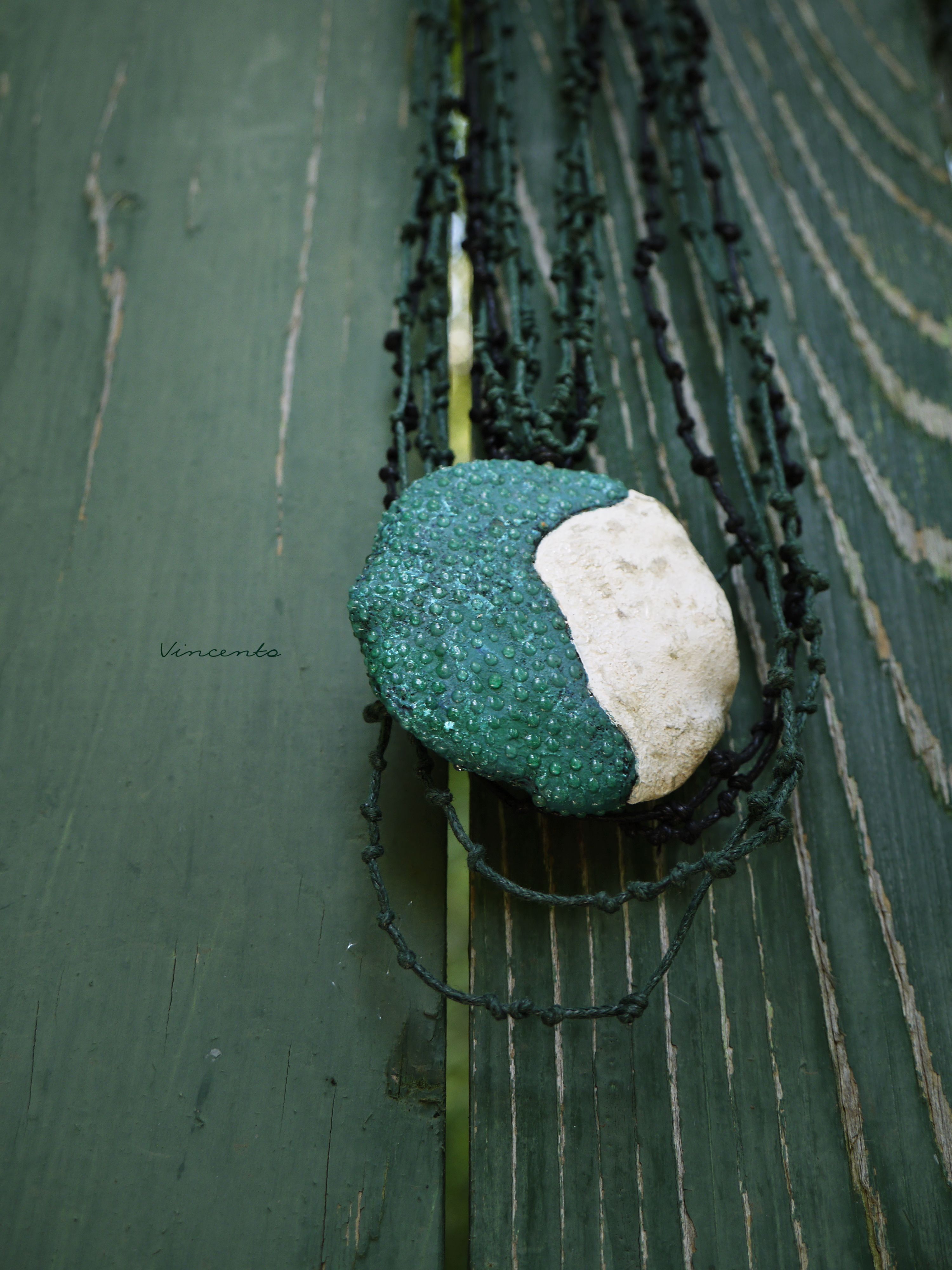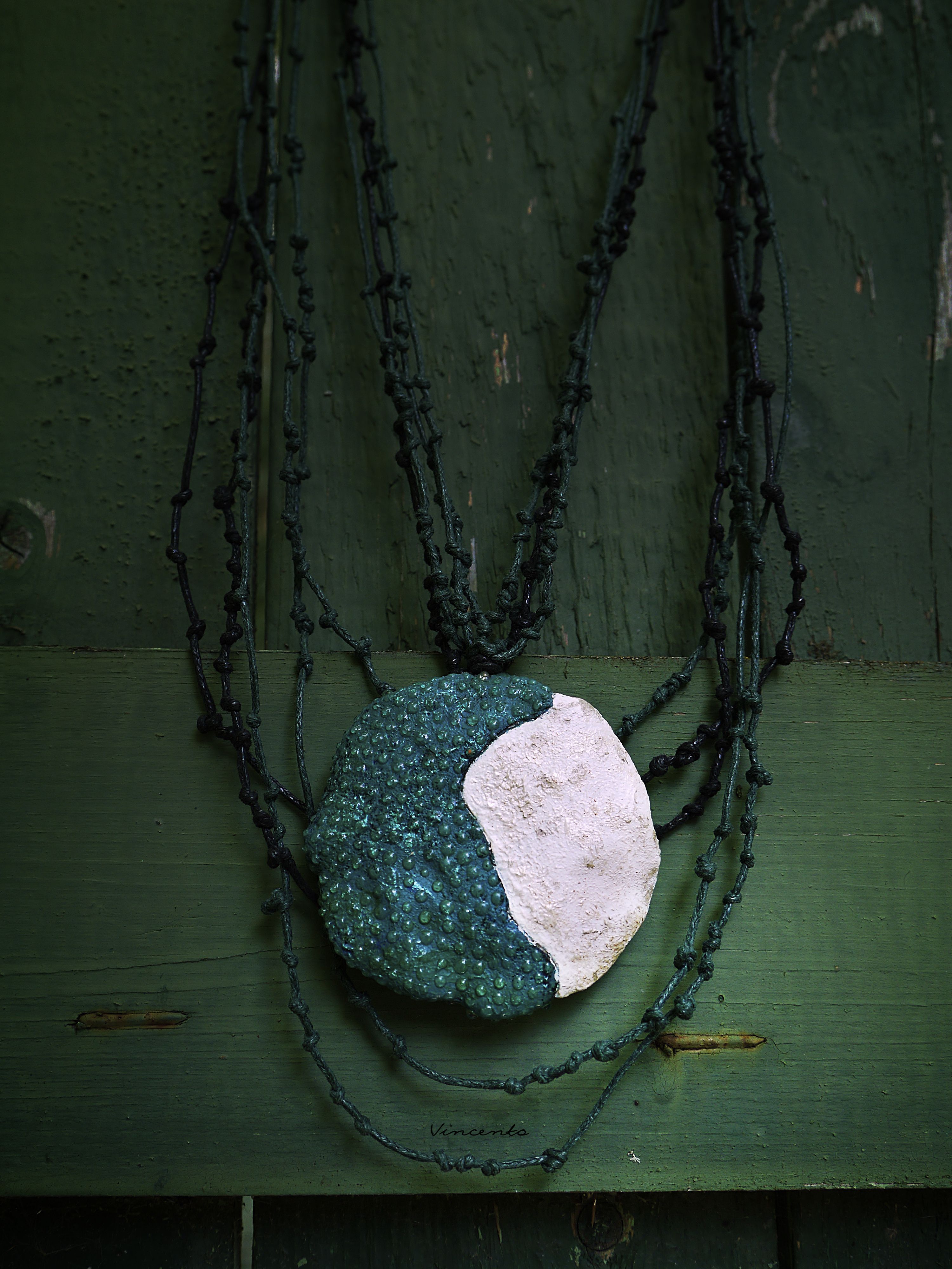 - Колье "Гримм" сплетено из фактурных вощёных шнуров тёмно-зелёного оттенка и завершается крупной подвеской с мерцающими каплями.