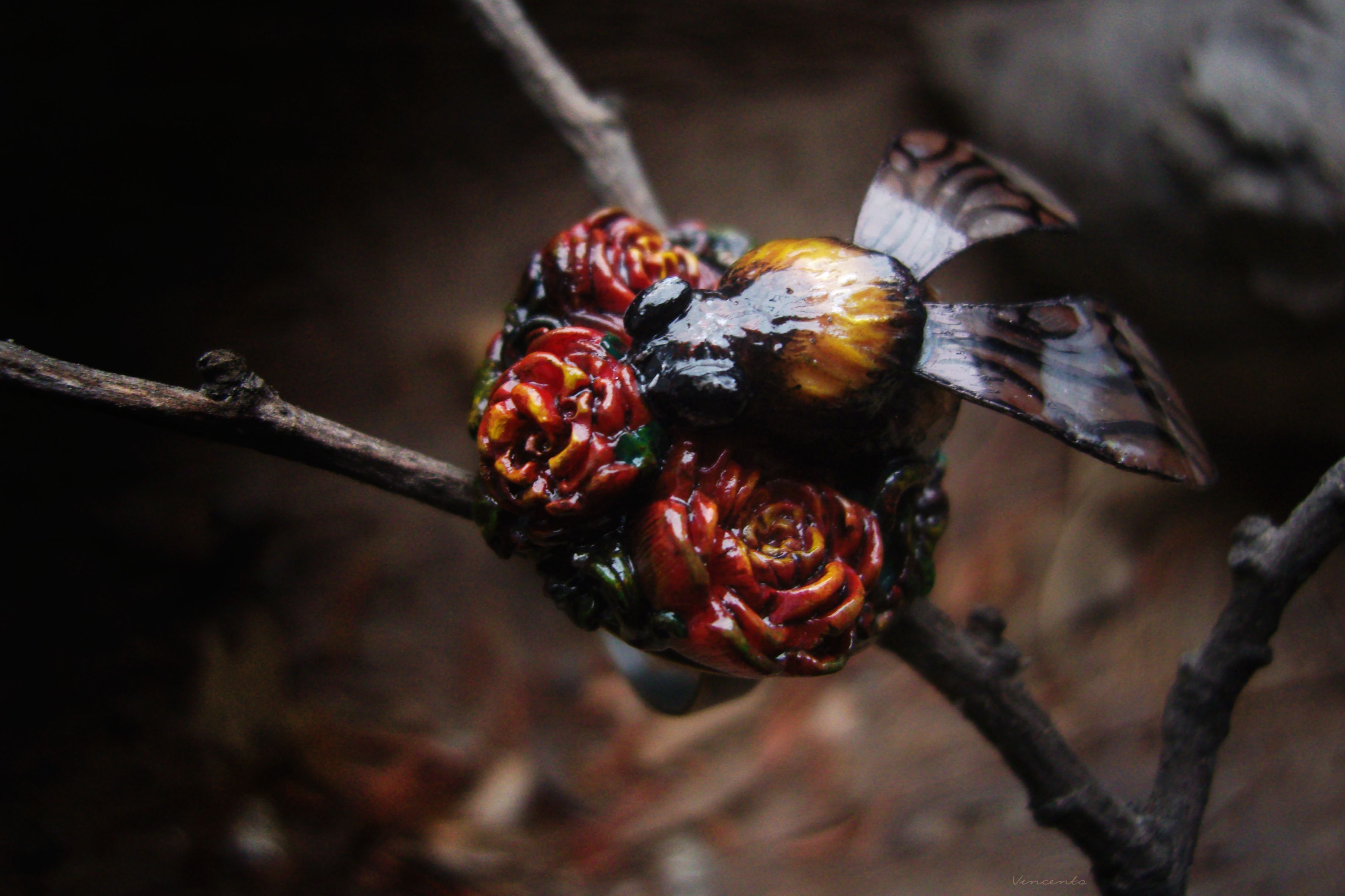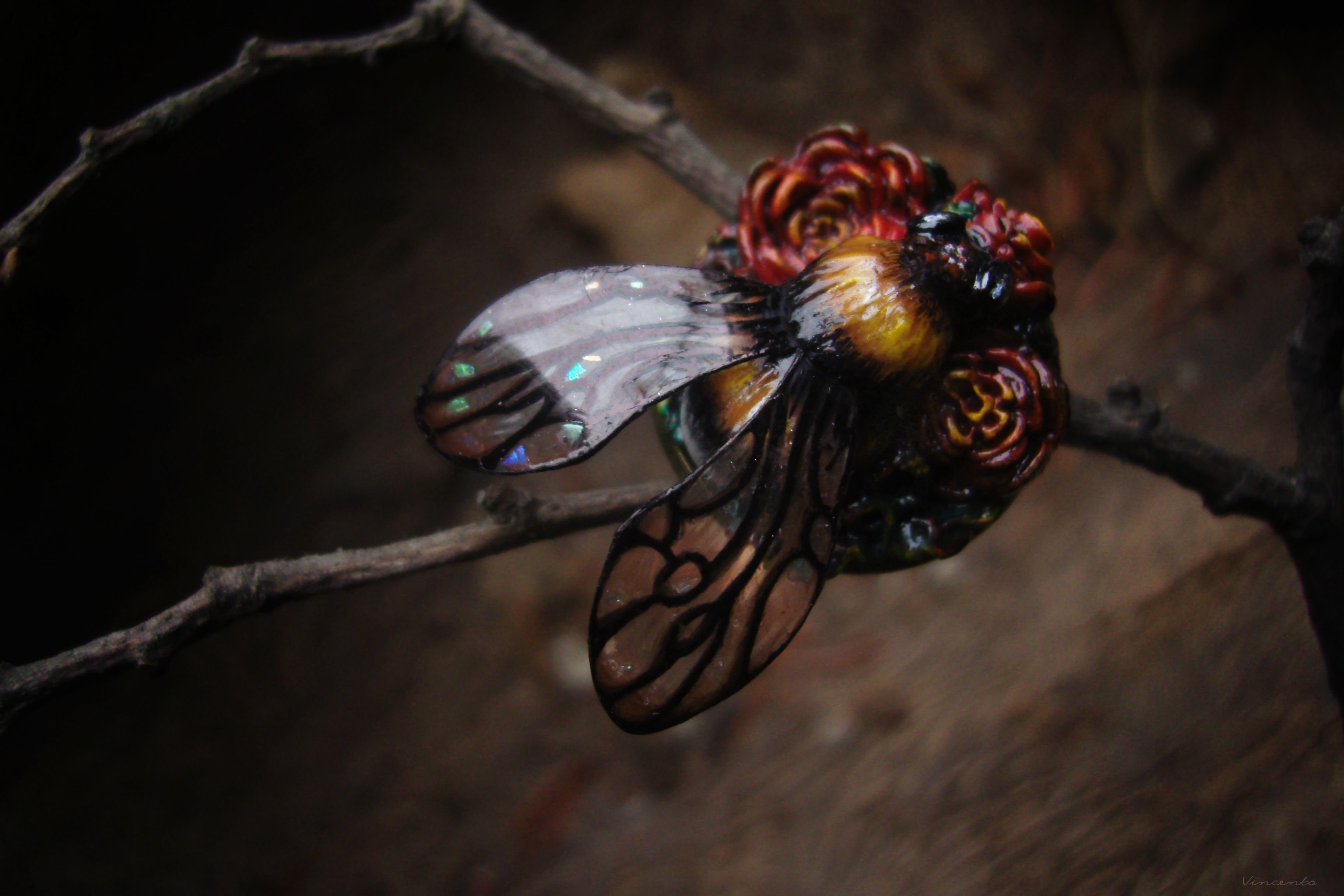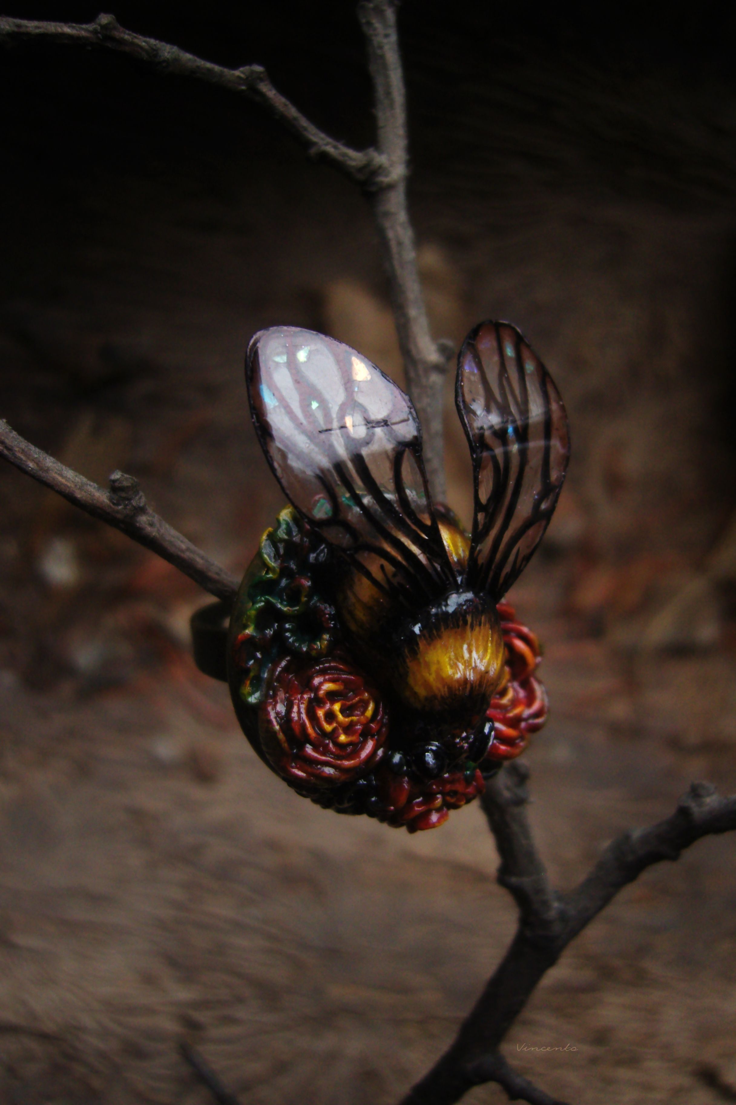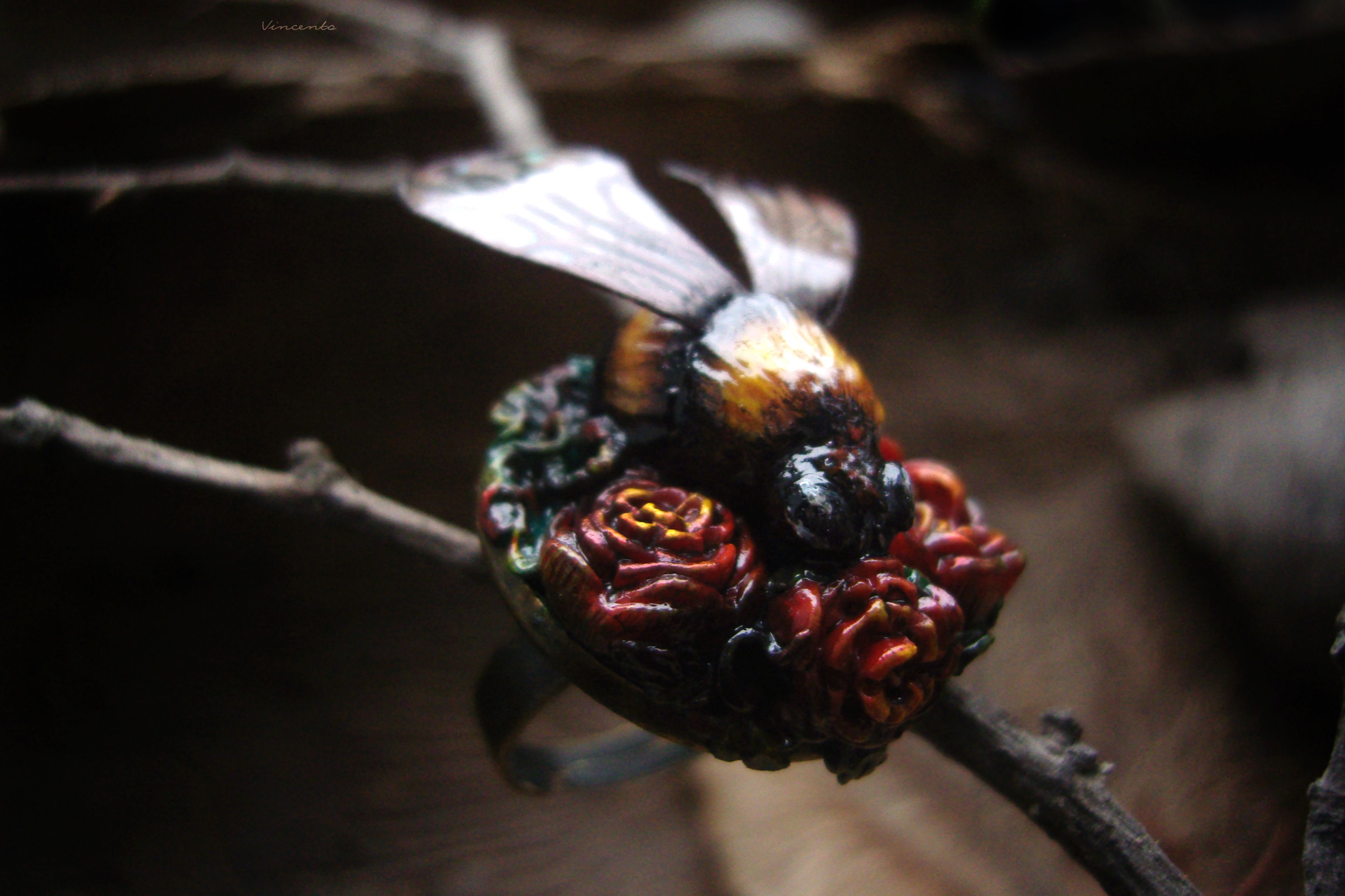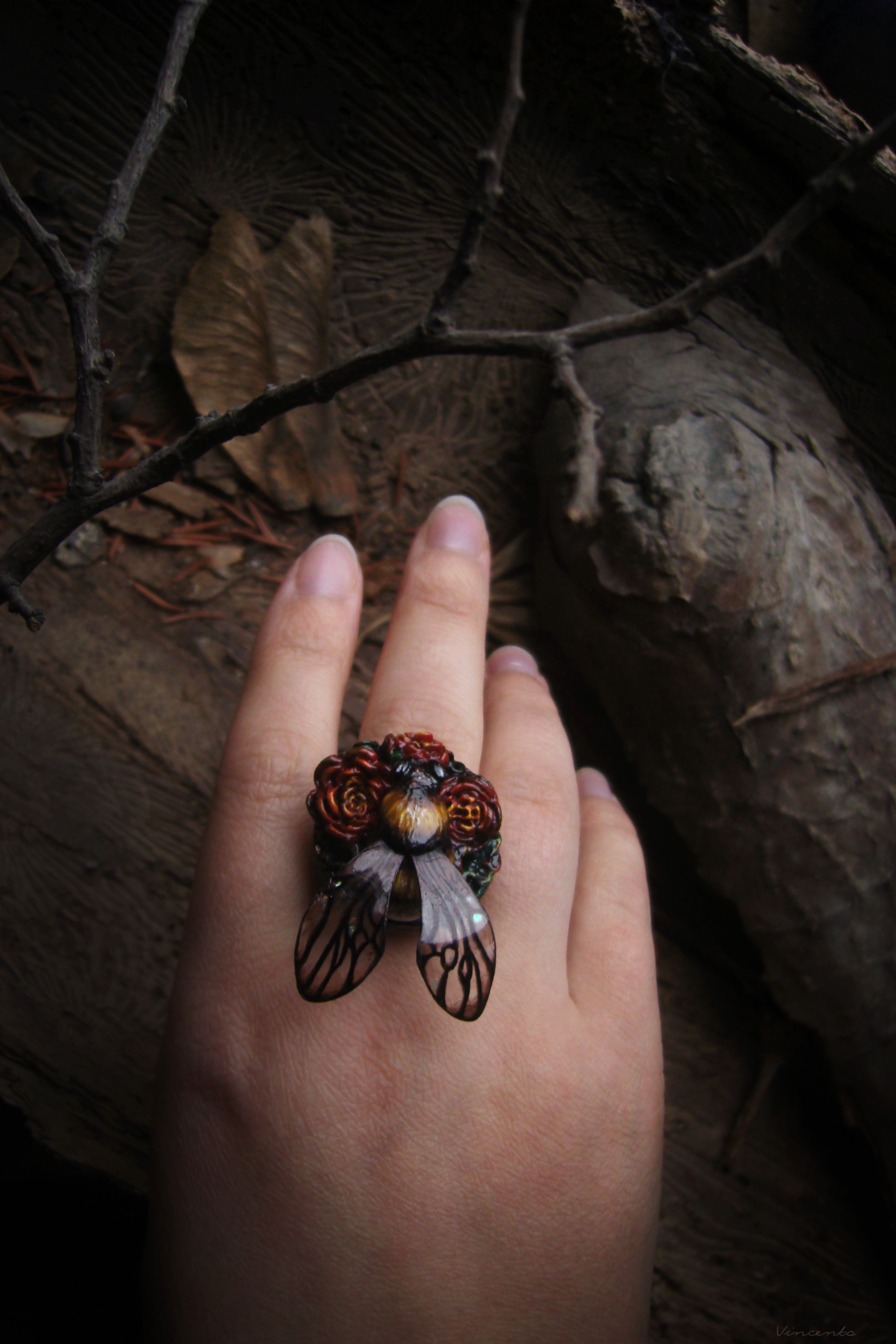 - Нарядное кольцо в стиле фэнтезийного барокко с зачарованным царевичем Шмелём, расправившим крылышки над пурпурно-золотистыми розами.