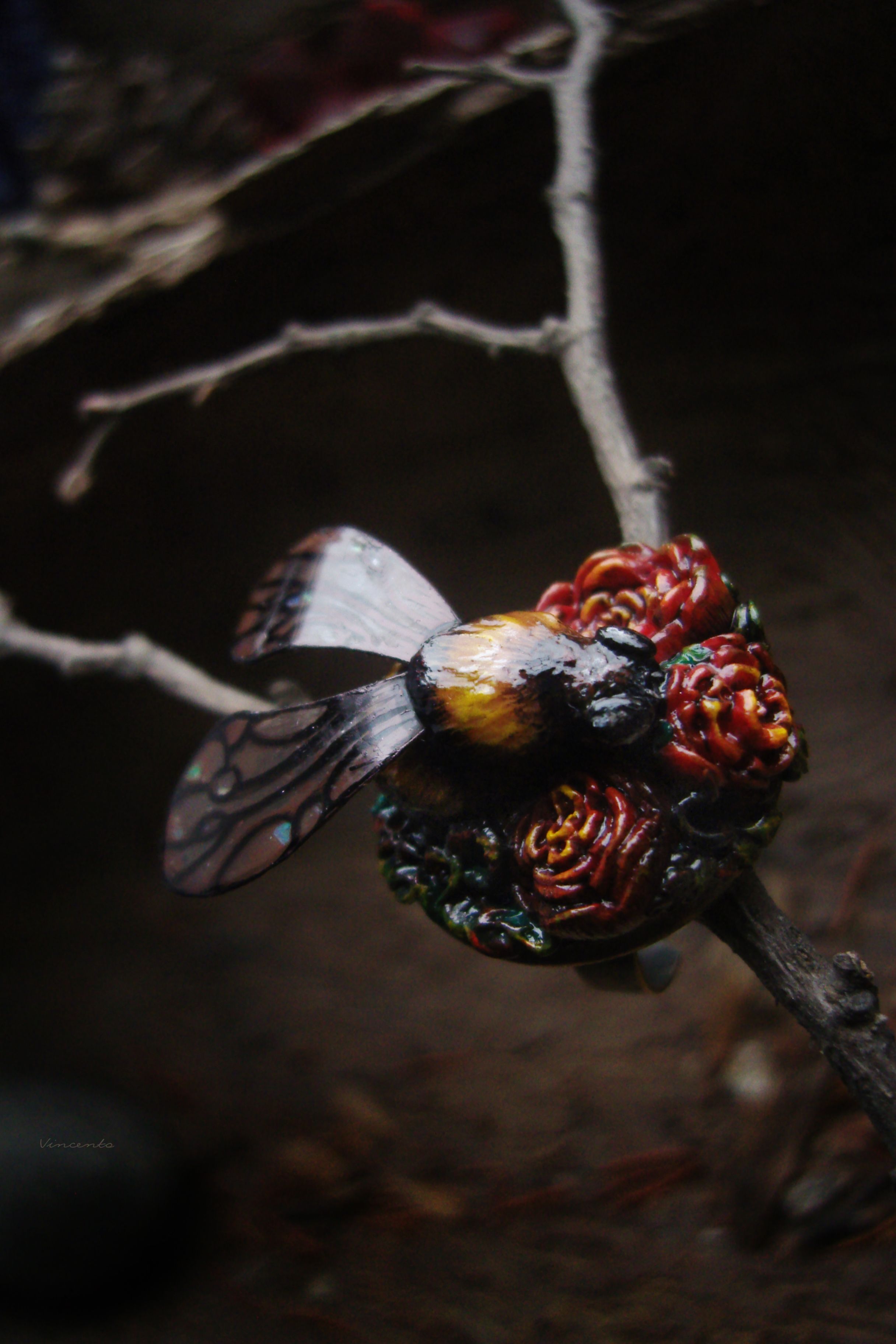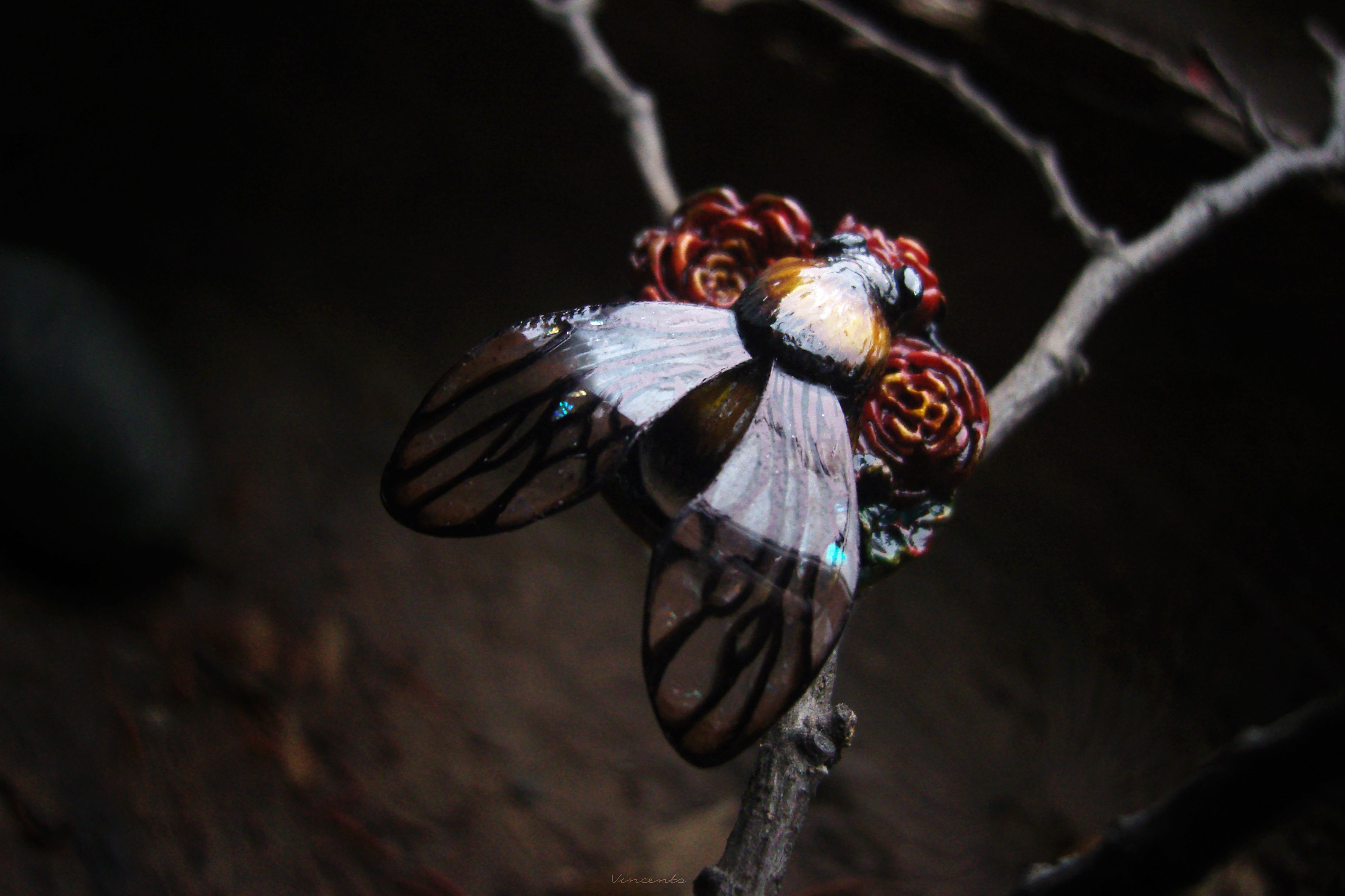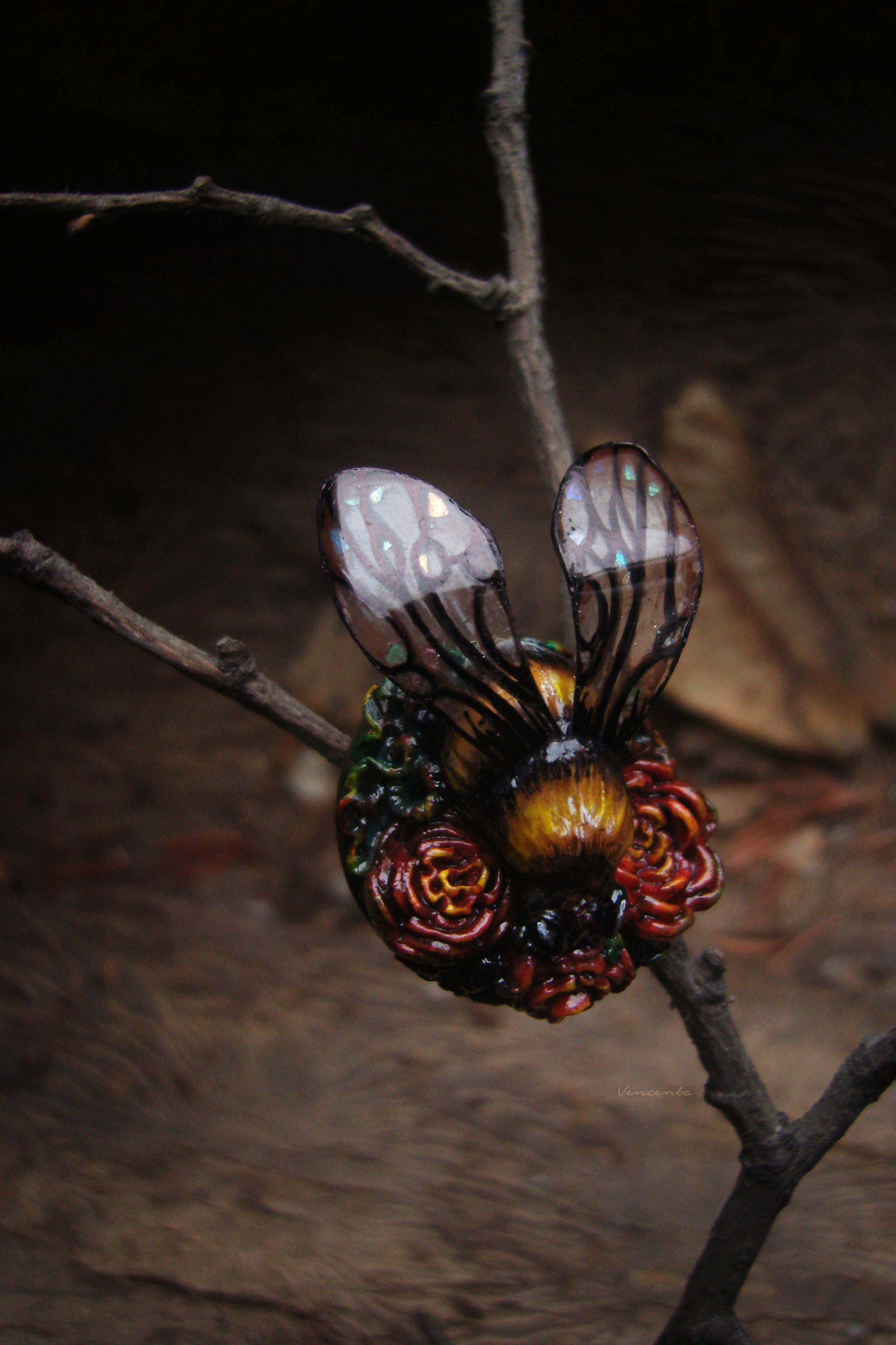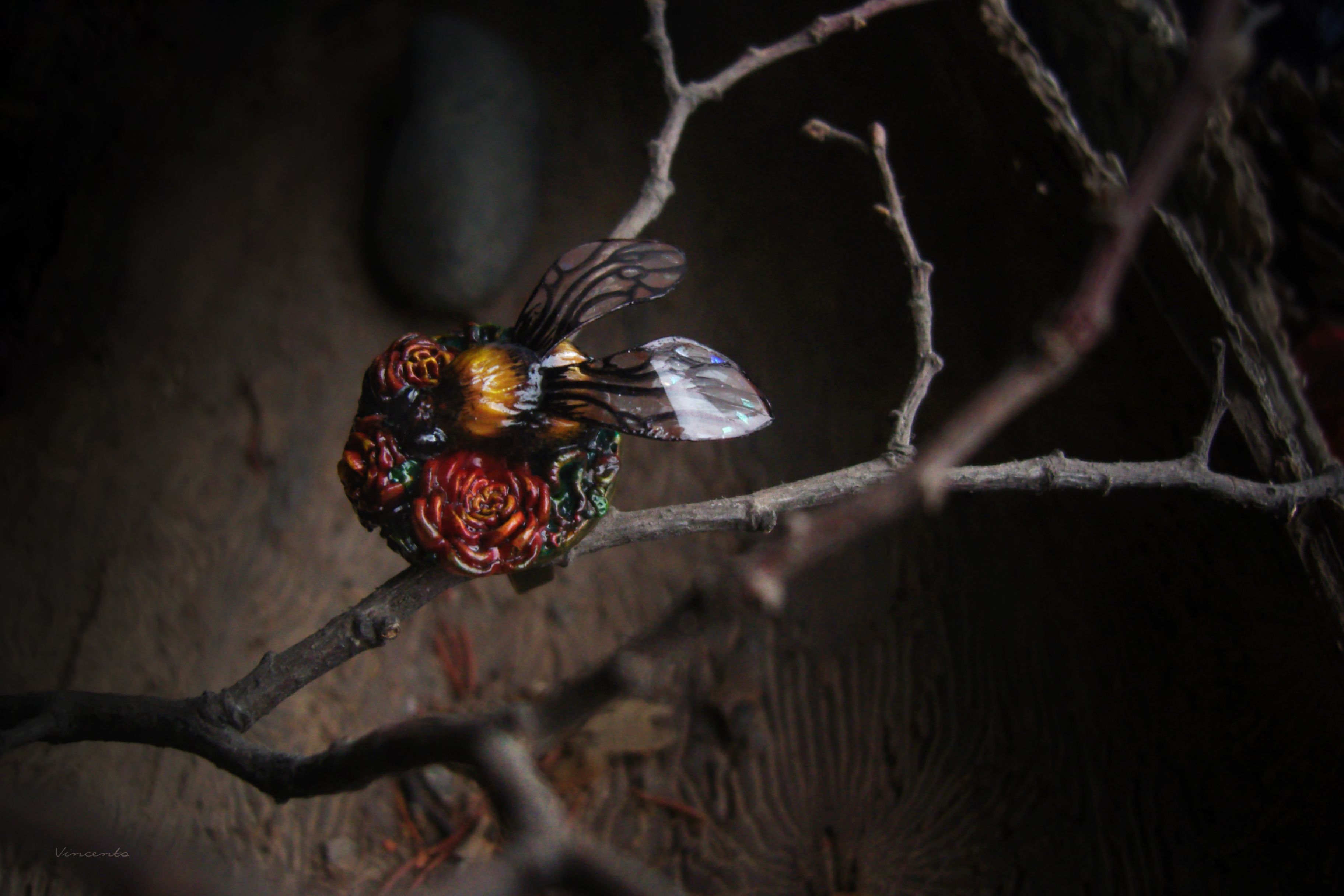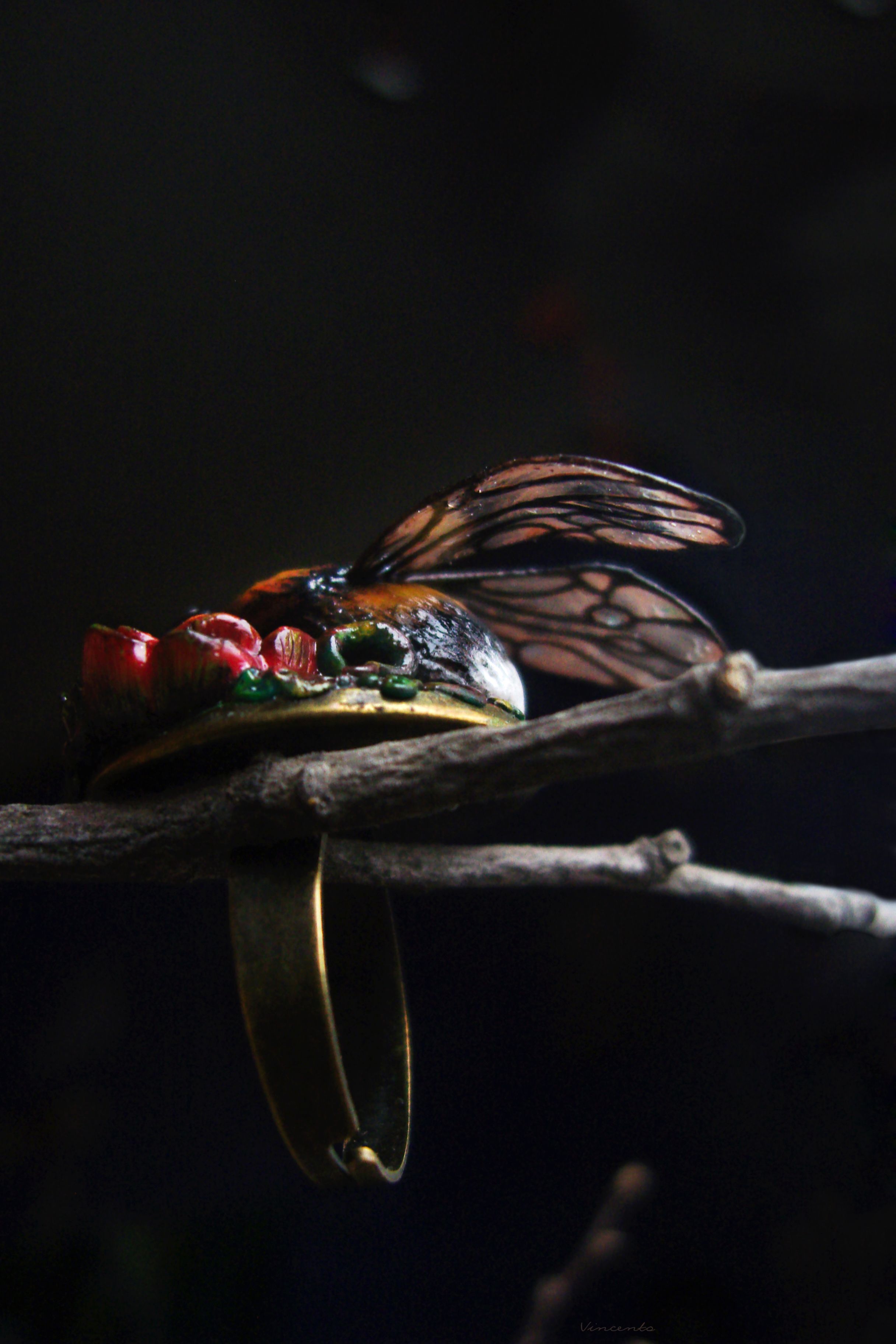 - Нарядное кольцо в стиле фэнтезийного барокко с зачарованным царевичем Шмелём, расправившим крылышки над пурпурно-золотистыми розами.