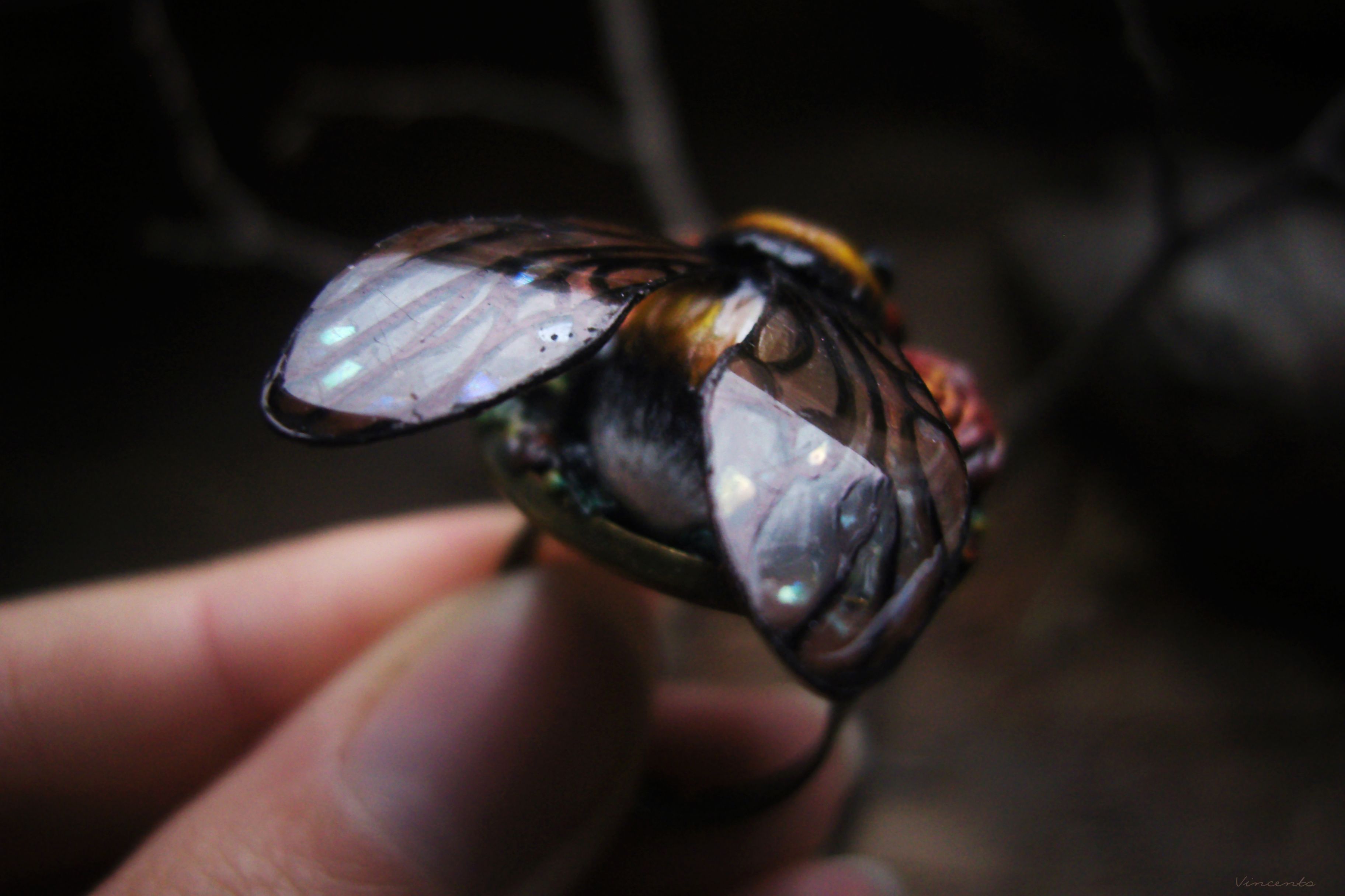 - Крылья шмеля плотные, но упругие (тем не менее, мы рекомендуем относиться к ним бережно и не заламывать), они, как настоящие, пропускают лучи света, словно по волшебству, вспыхивая яркими радужными искрами.