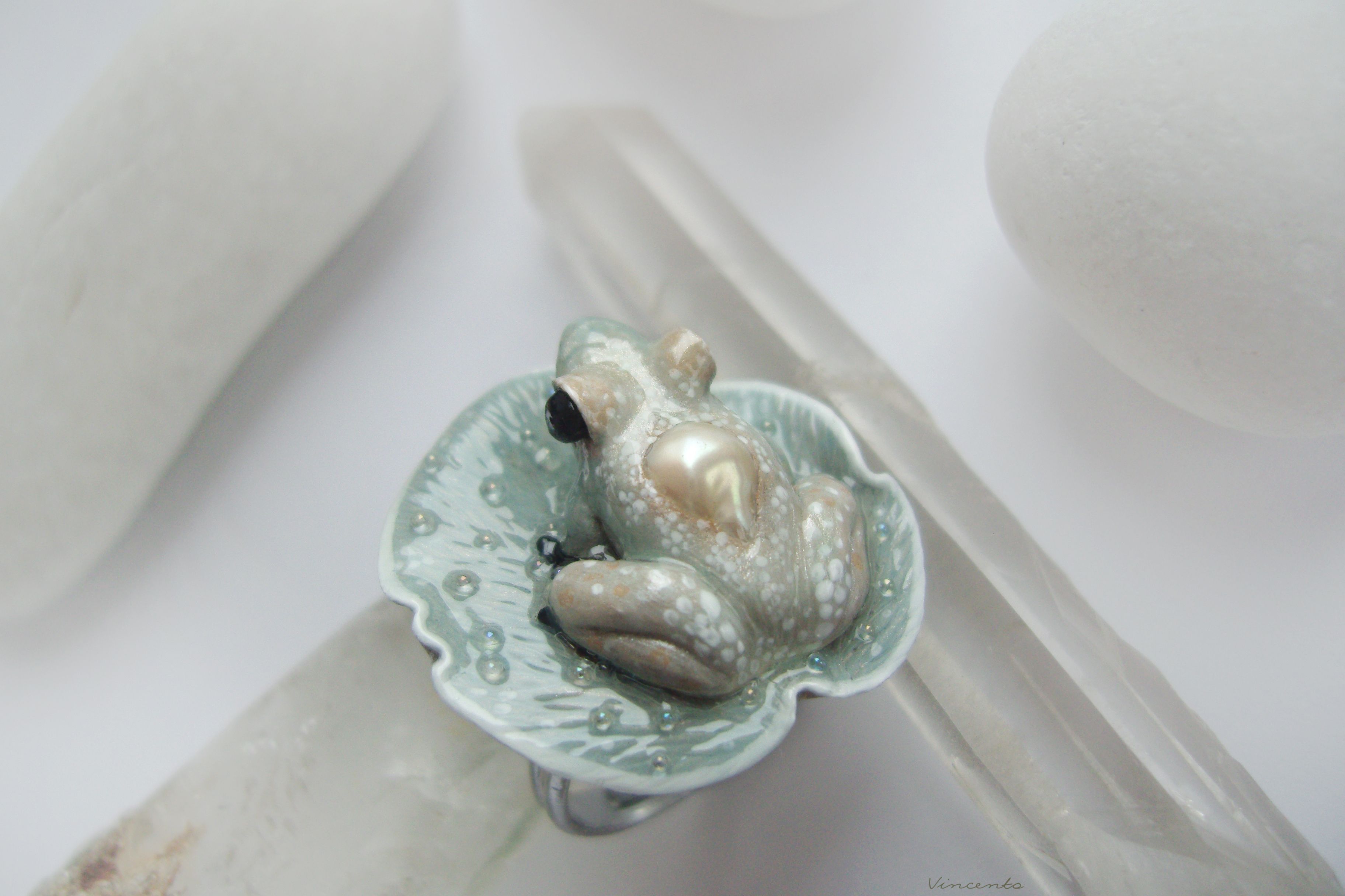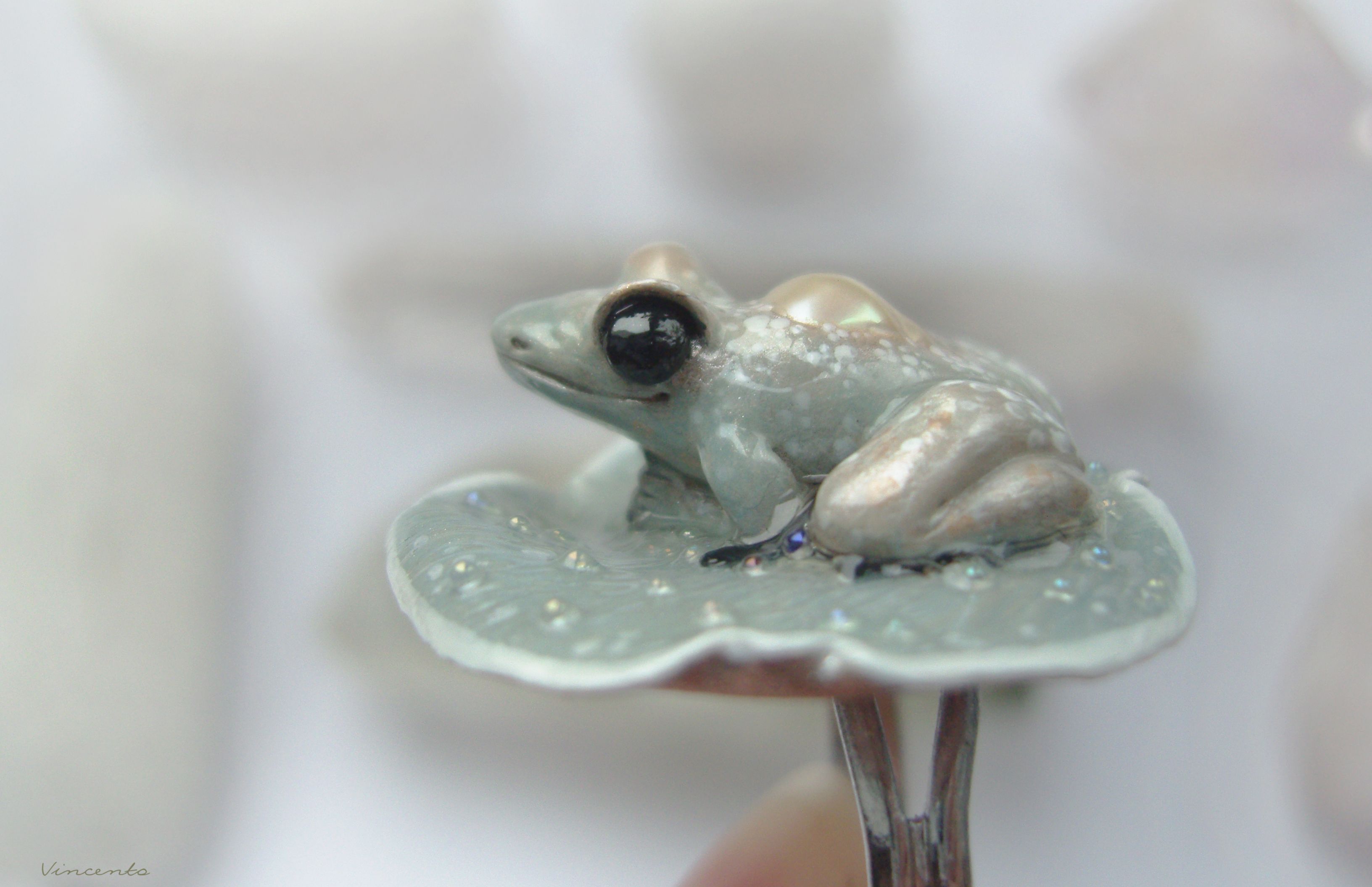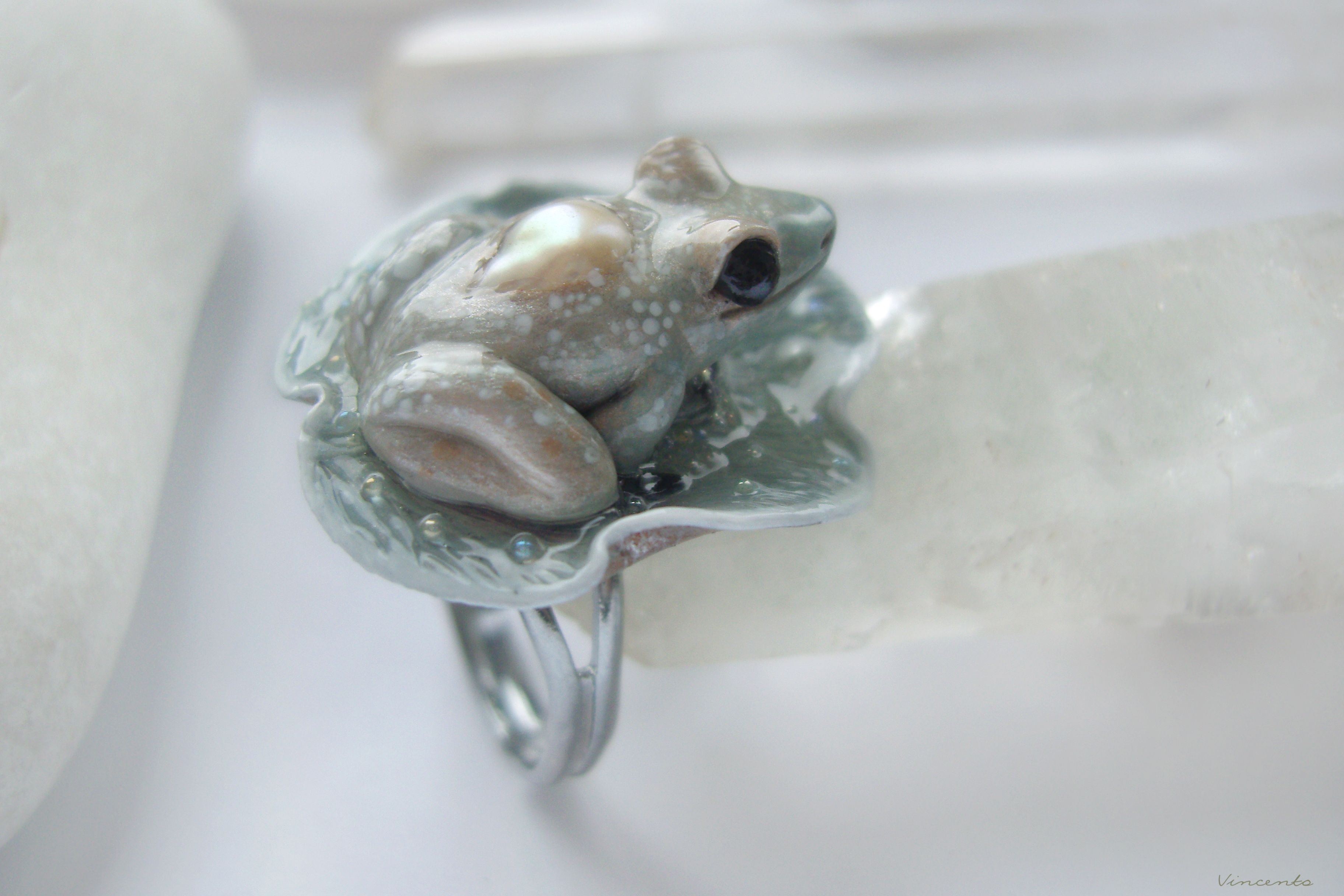 - Невероятно нежное и утончённое арт-нуво колечко в виде зачарованной принцессы-лягушки на листе волшебной кувшинки из затаившегося в туманной пелене сада.