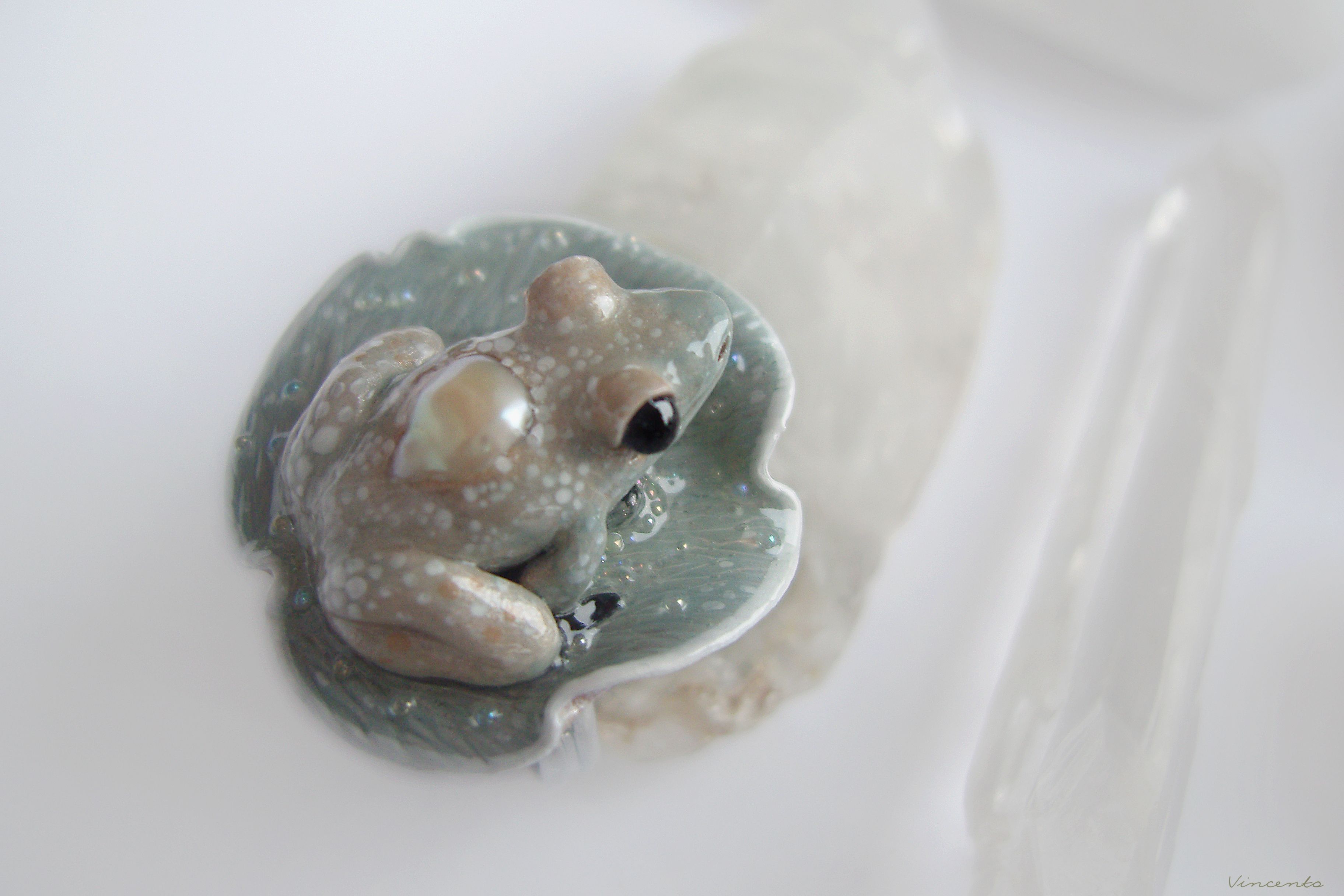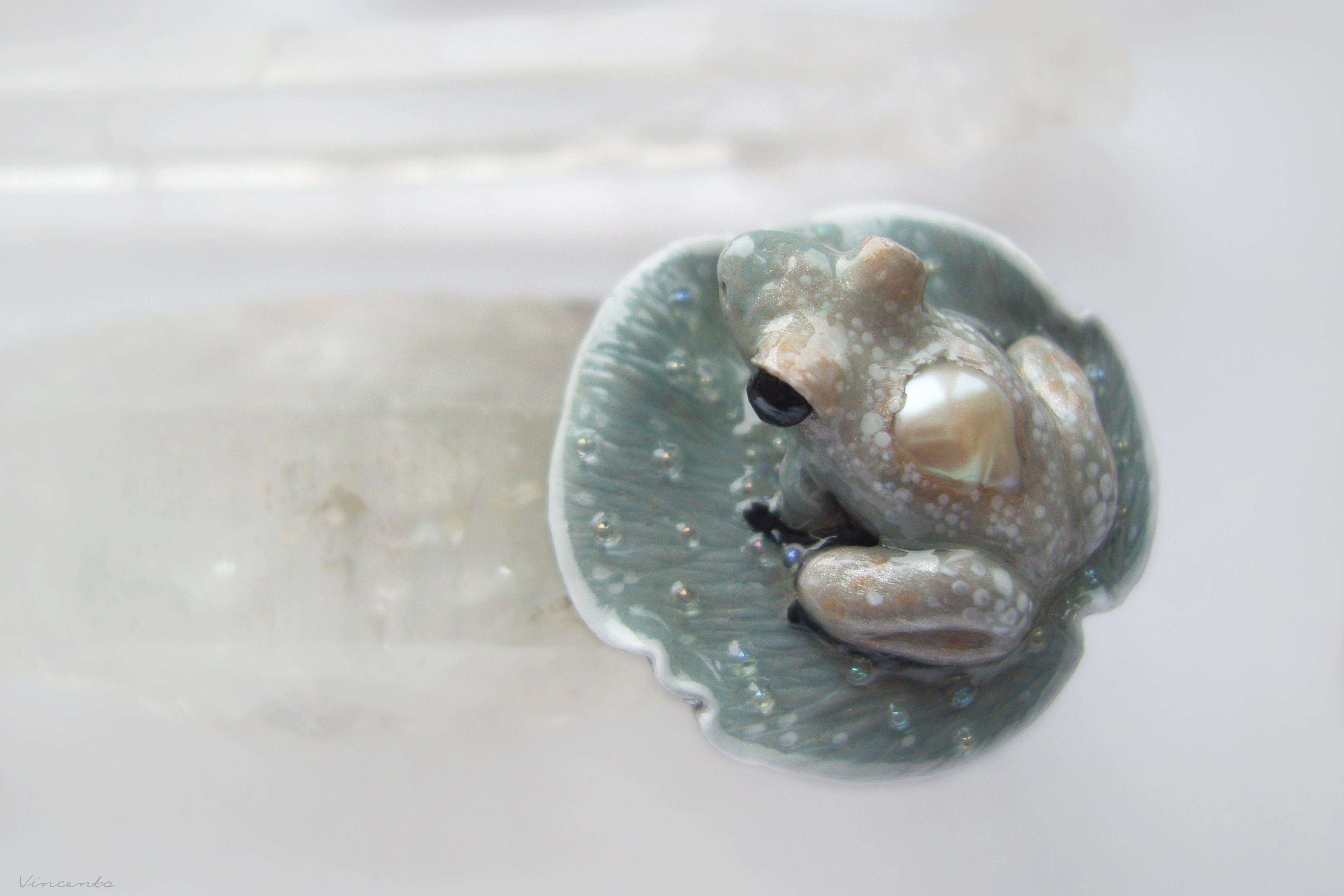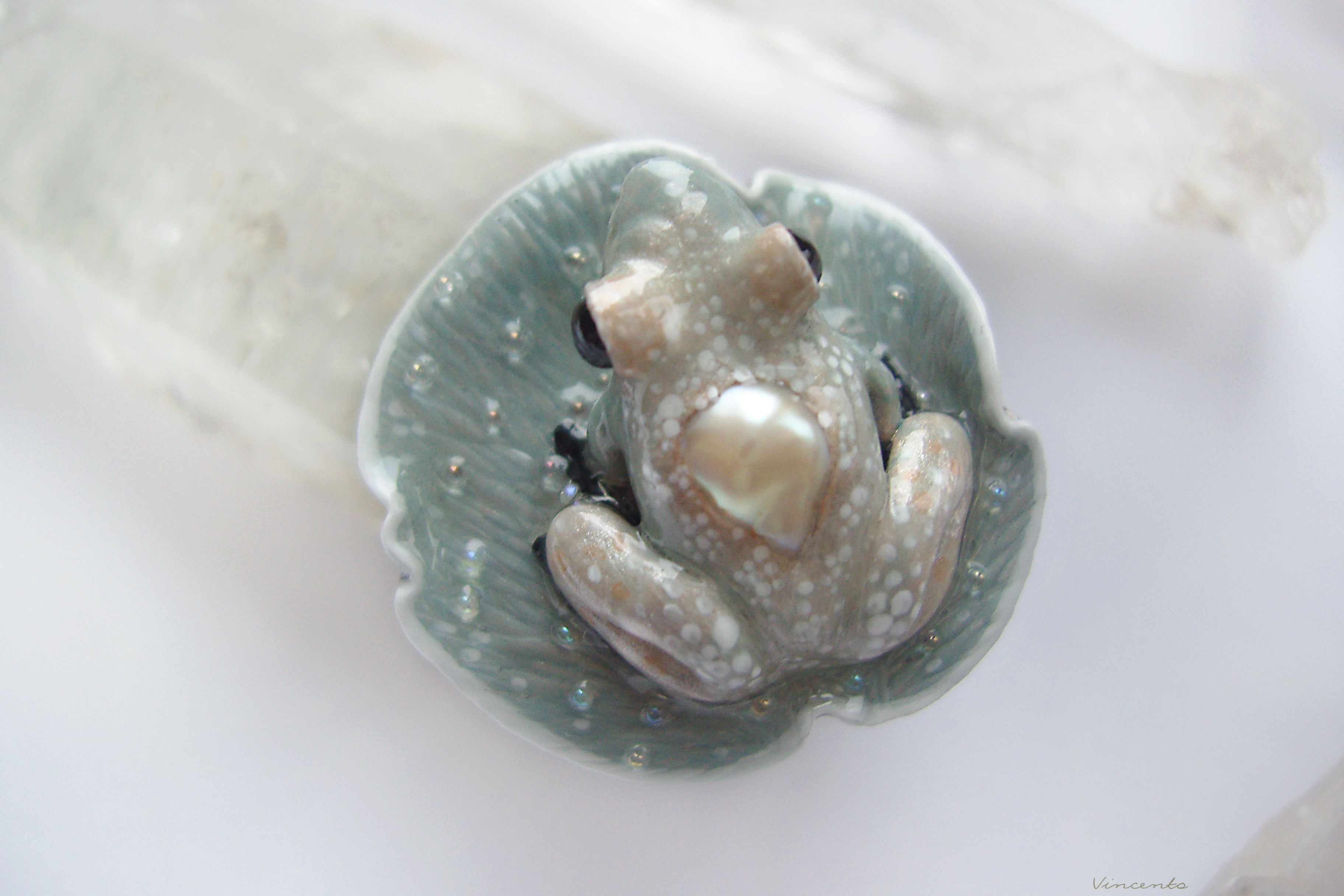 - Лягушечка инкрустирована красивой барочной жемчужиной кремового оттенка.
