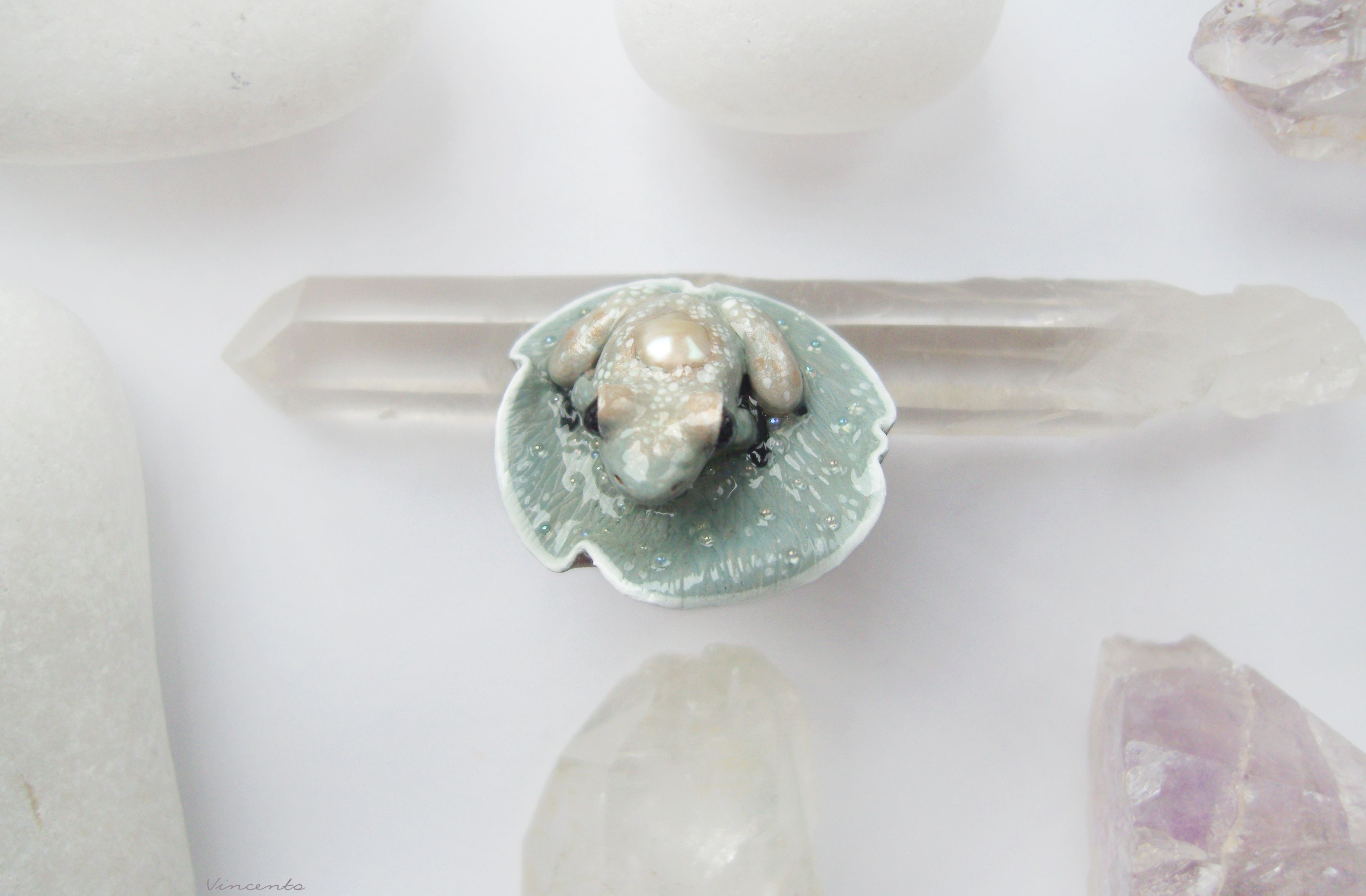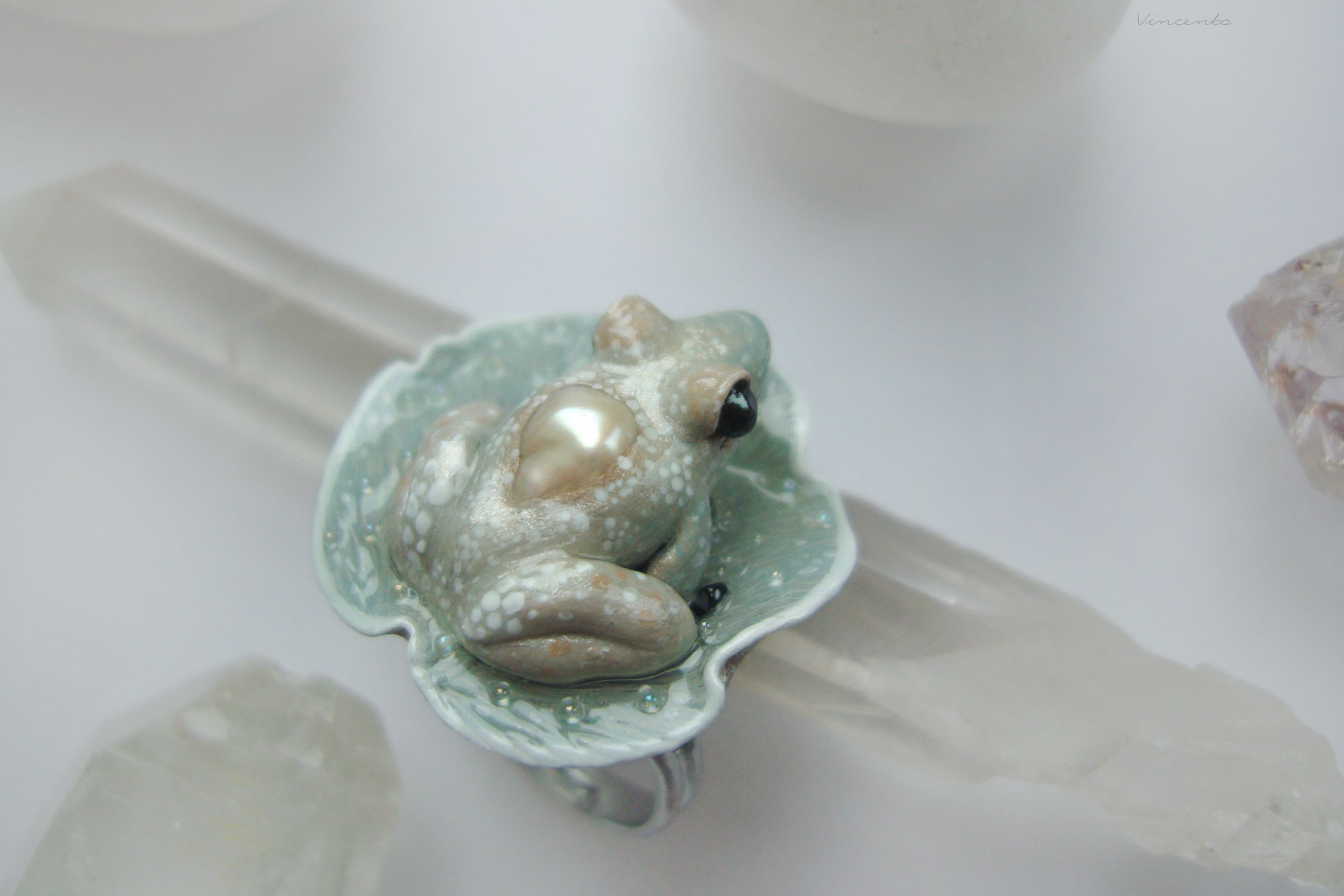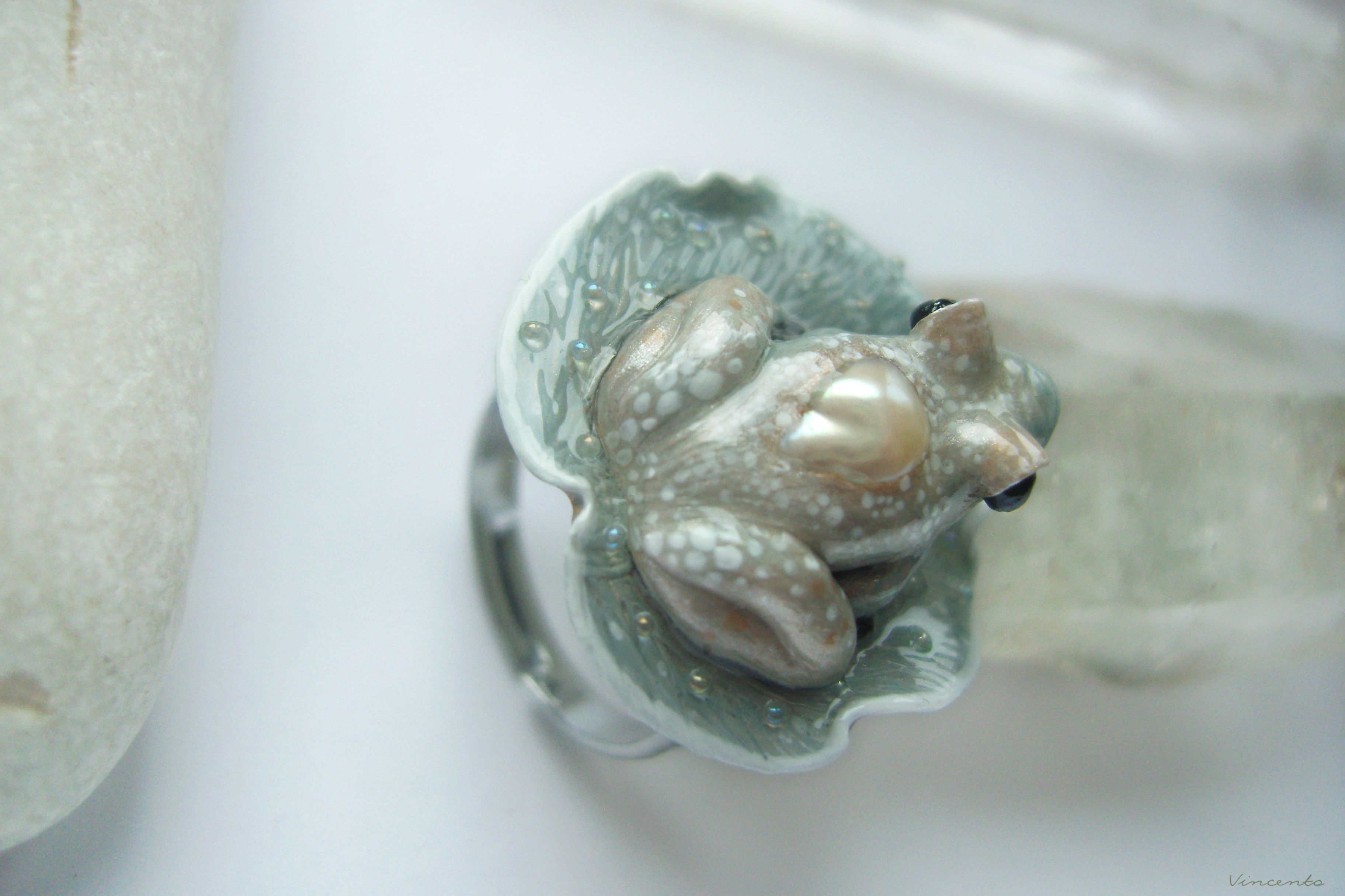 Коллекционное кольцо с лягушкой и жемчужиной "Капель в туманном саду"