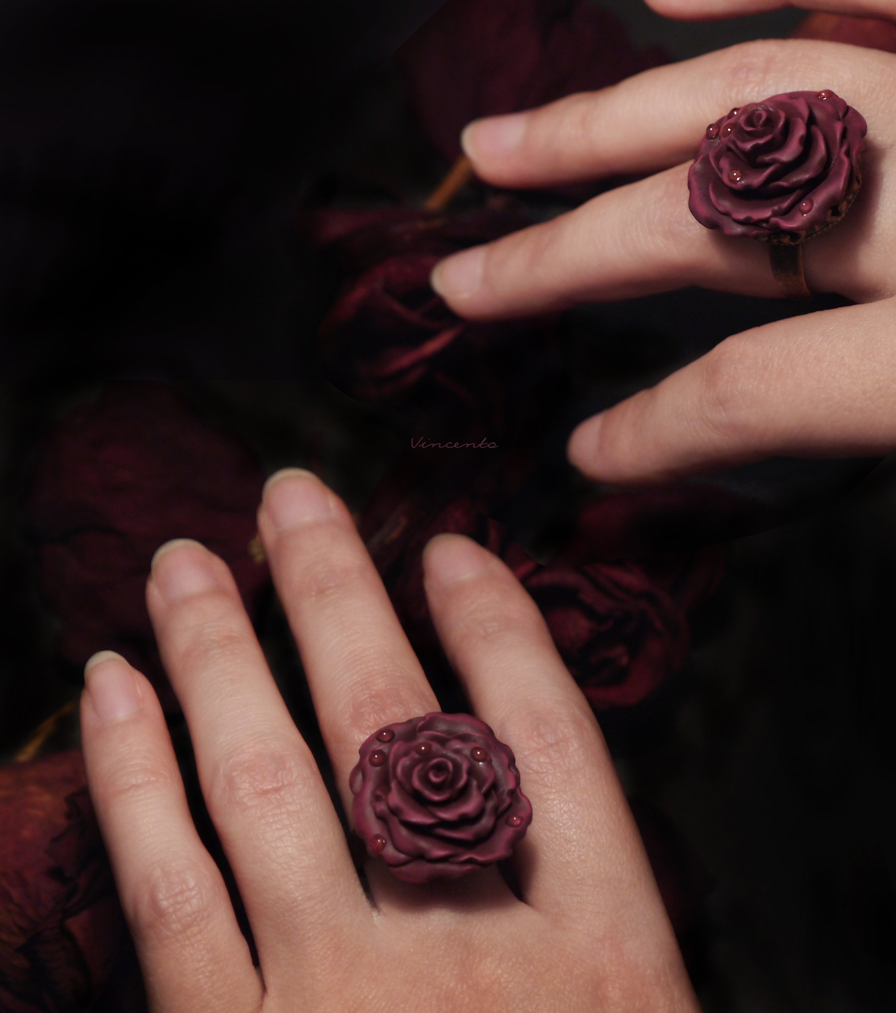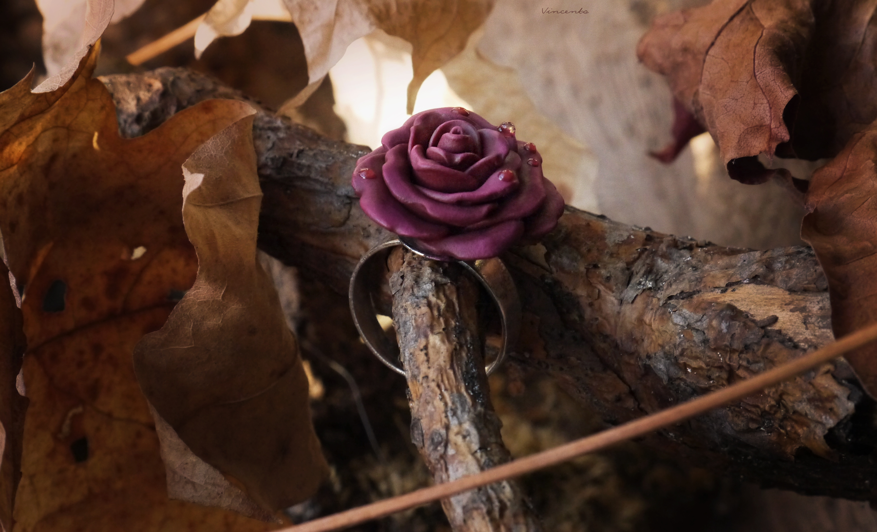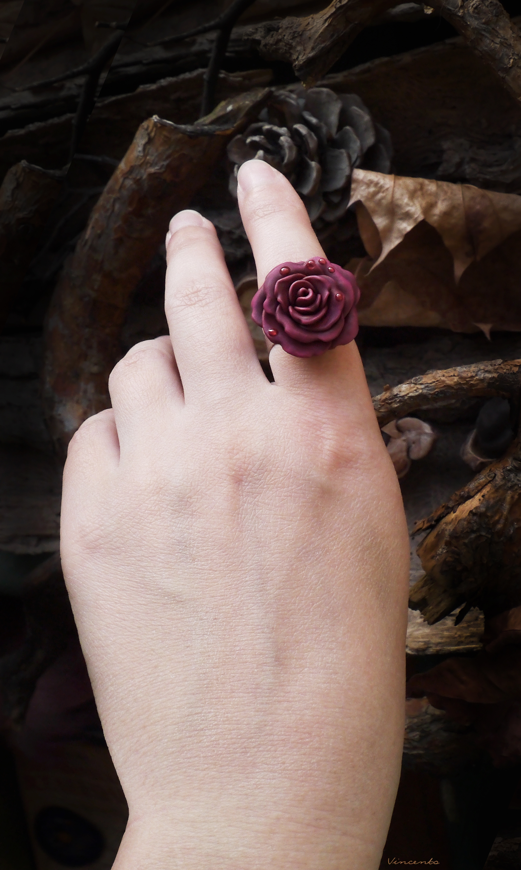 - Изящное кольцо ручной работы из запекаемой полимерной глины с распустившимся цветком осенней розы, тёмного, приглушённого, но в то же время глубокого пурпурно-фиолетового оттенка.