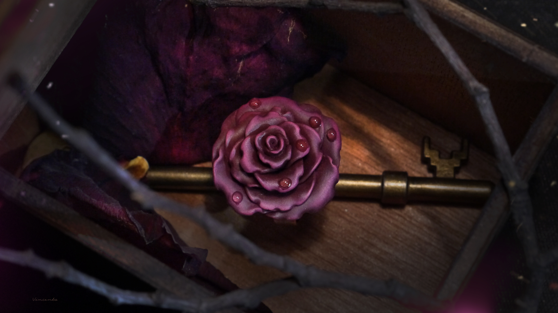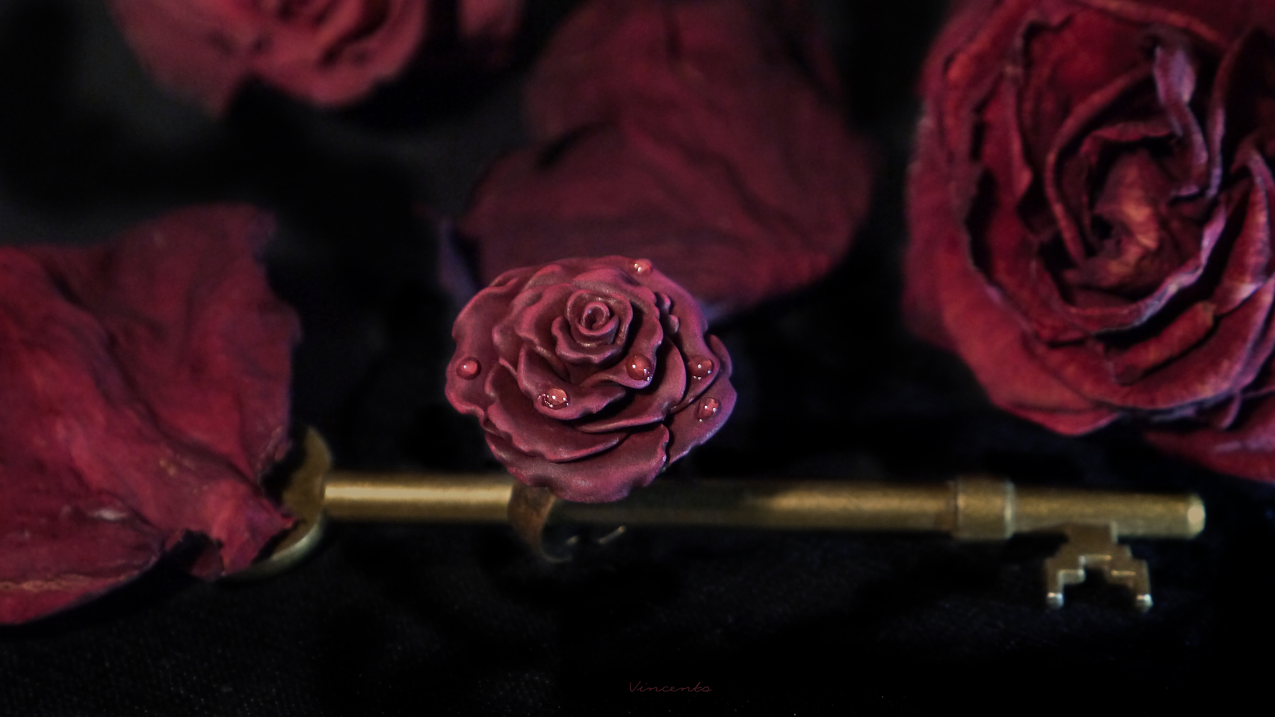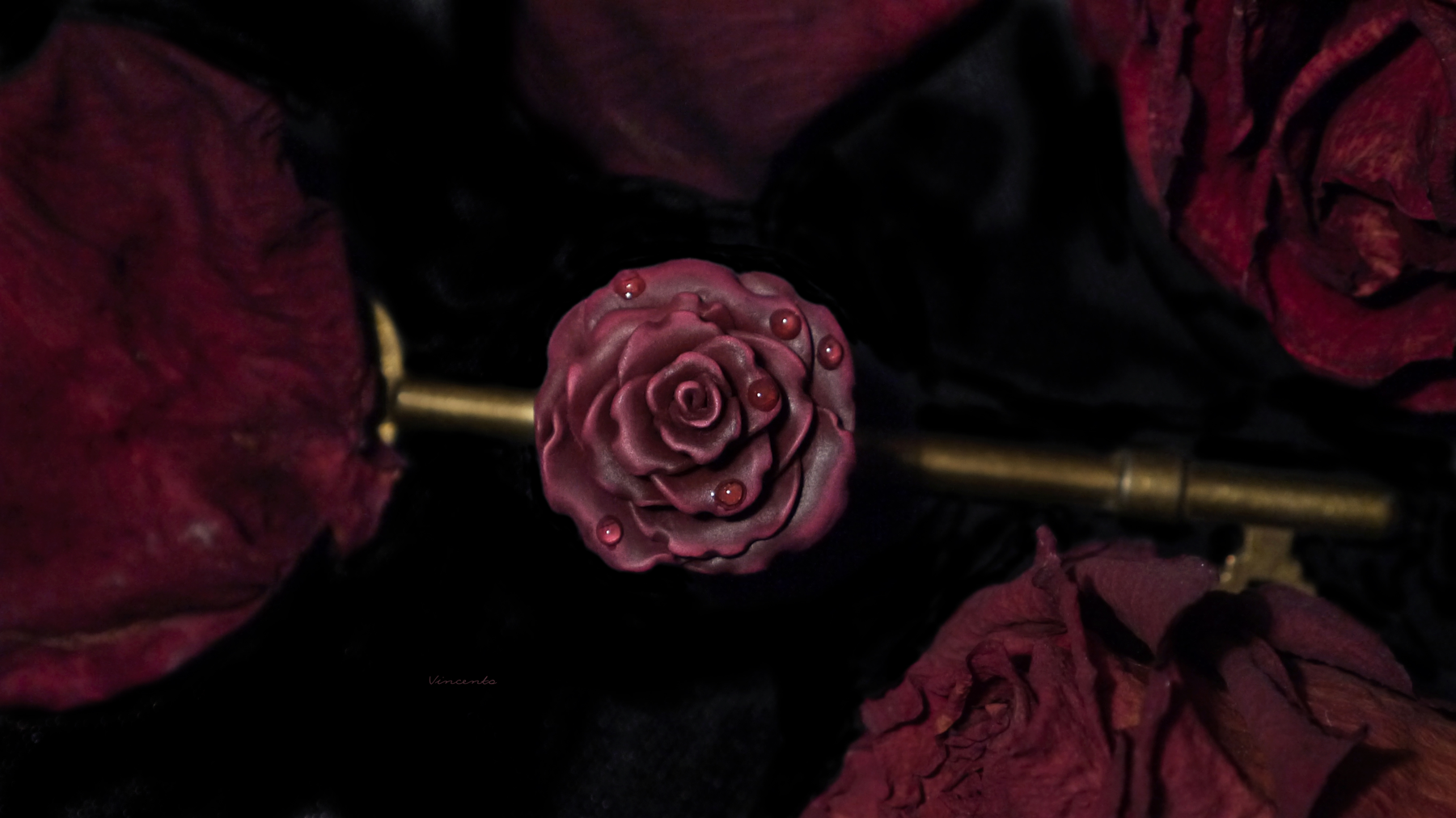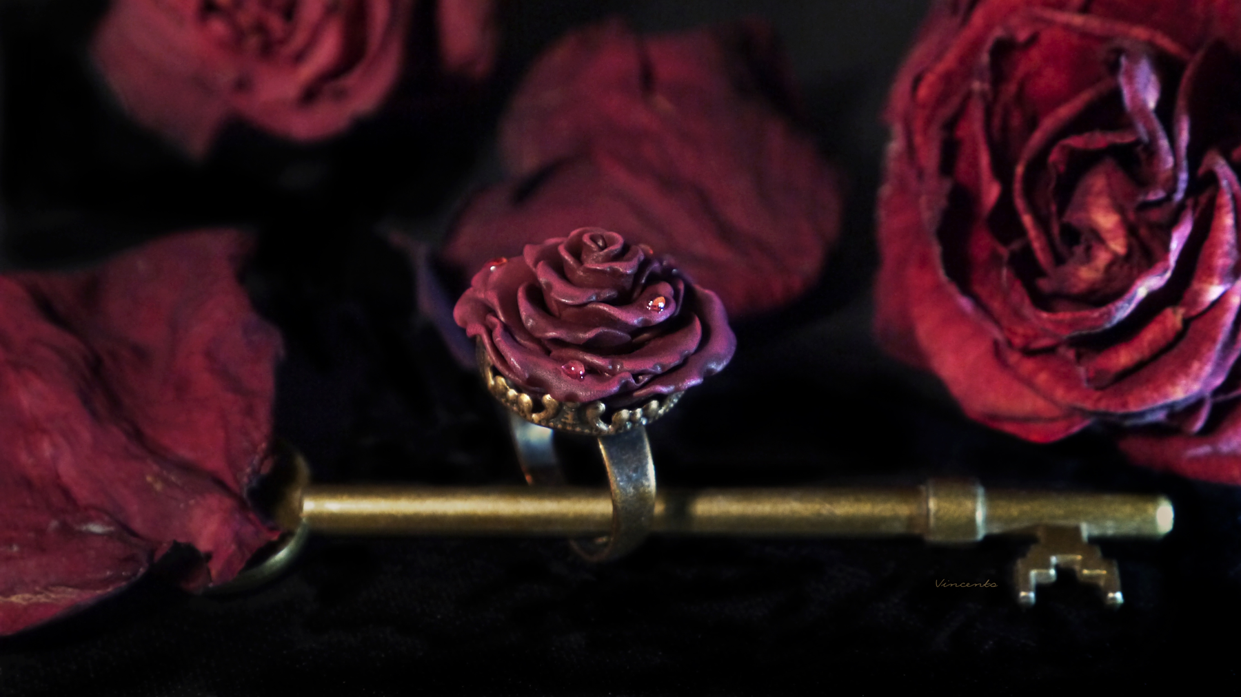 - Изящное кольцо ручной работы из запекаемой полимерной глины с распустившимся цветком осенней розы, тёмного, приглушённого, но в то же время глубокого пурпурно-фиолетового оттенка.
