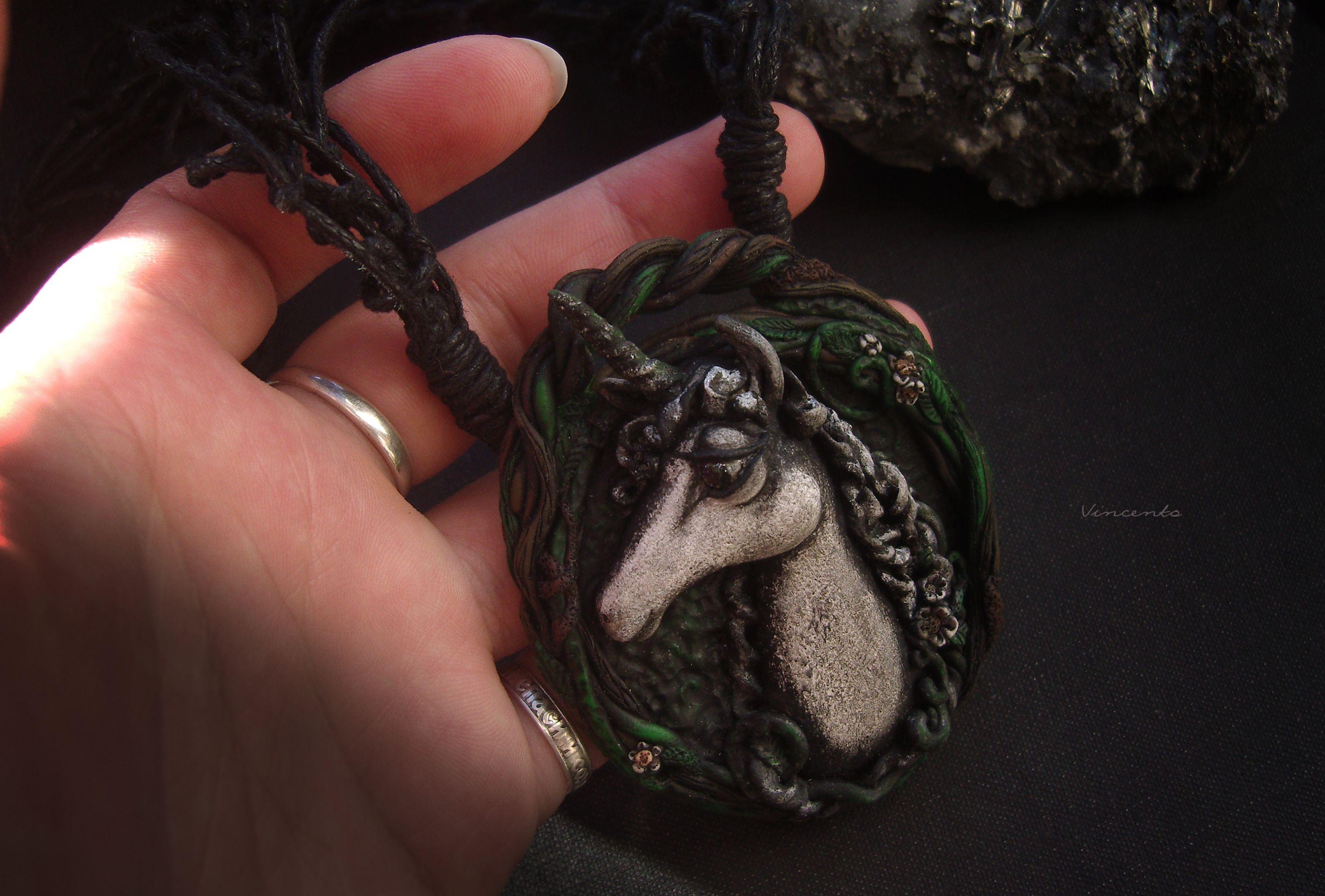 - Колье сплетено также вручную из чёрных вощёных шнуров (авторское плетение) так, чтобы они напоминали узловатые веточки-тени, какие обычно вселяют трепет в случайных лесных путников глухими ночами...