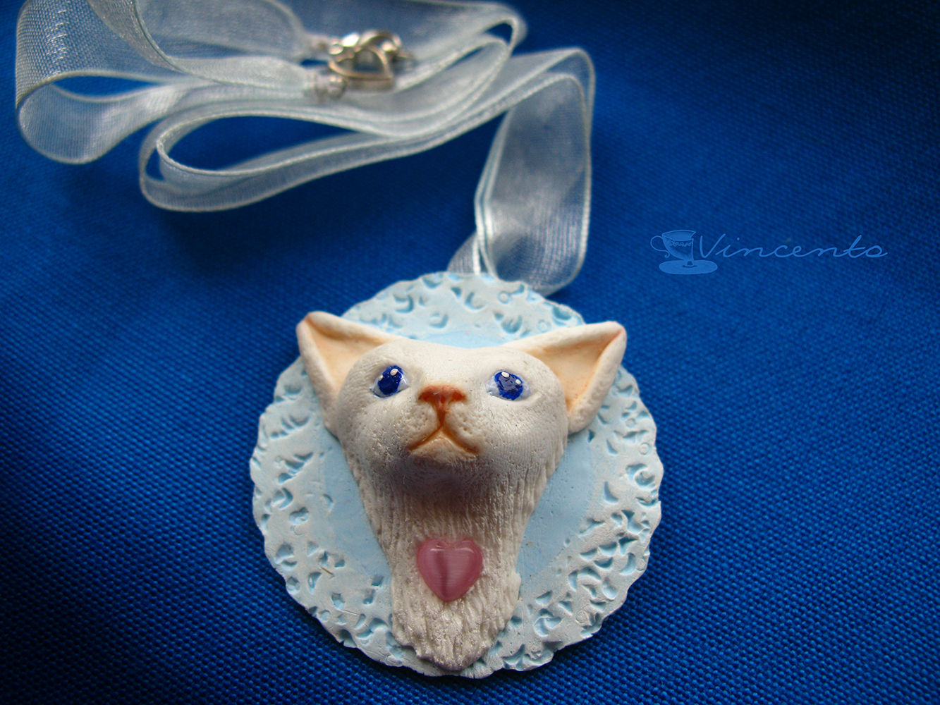 - Изящная белая кошечка Шебби с голубыми глазами и кулоном в виде сердца из кошачьего глаза может стать нежным дополнением романтичного образа мечтательной девушки.
