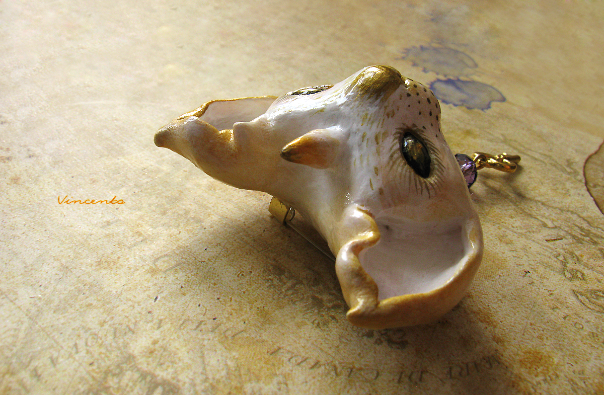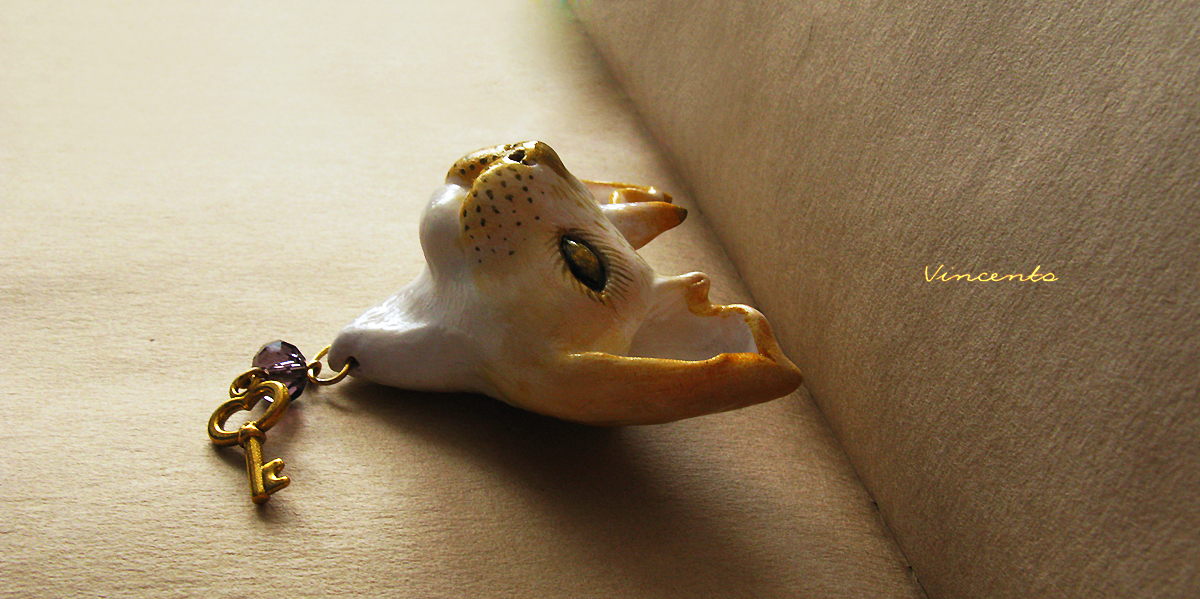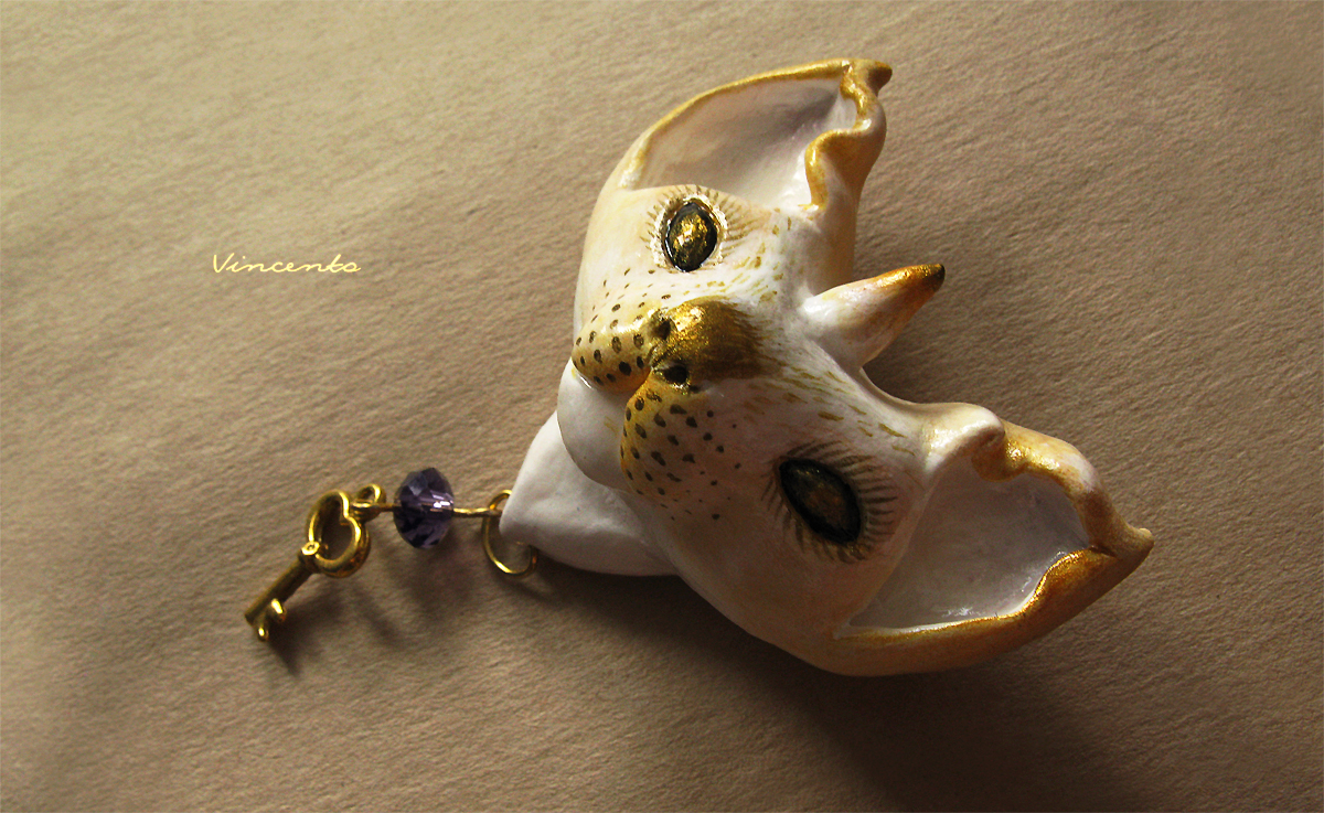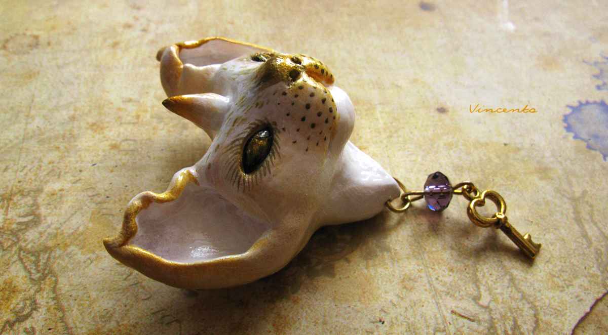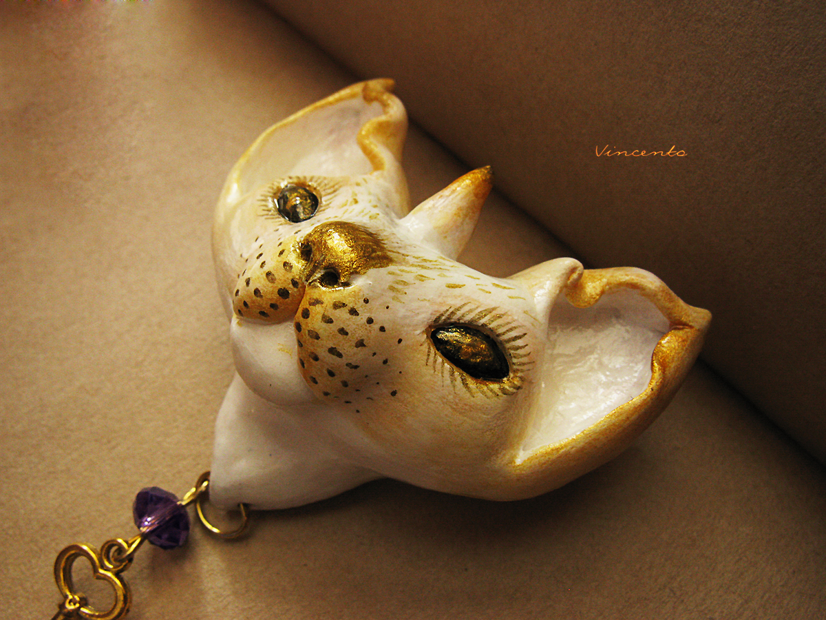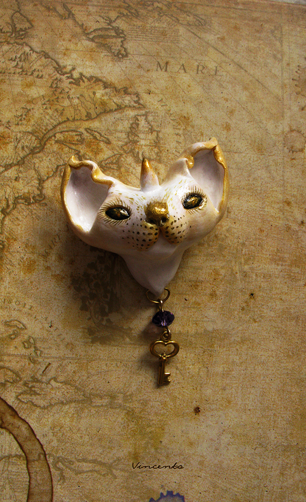 - Наш мифический кот-единорог выполнен полностью вручную из лёгкой термоглины, расписан белым и золотым акрилом. Дополнен подвеской - миниатюрным ключиком с красивой фиолетовой хрустальной бусинкой. Застёжка металлическая. Размер - около 4,5 см.