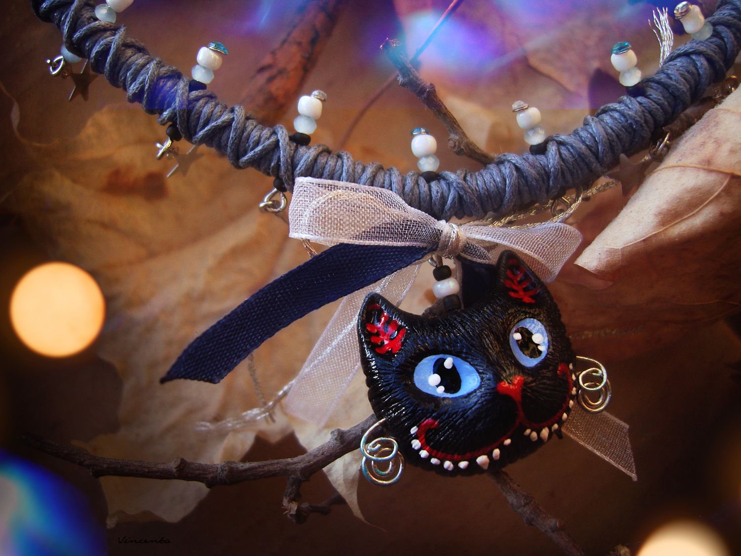 - Нарядное колье под шейку с подвеской в виде очаровательного котика Меркурия с нежно-голубыми глазами, белоснежными зубками и чёрной, как осенняя ночь, шёрсткой.