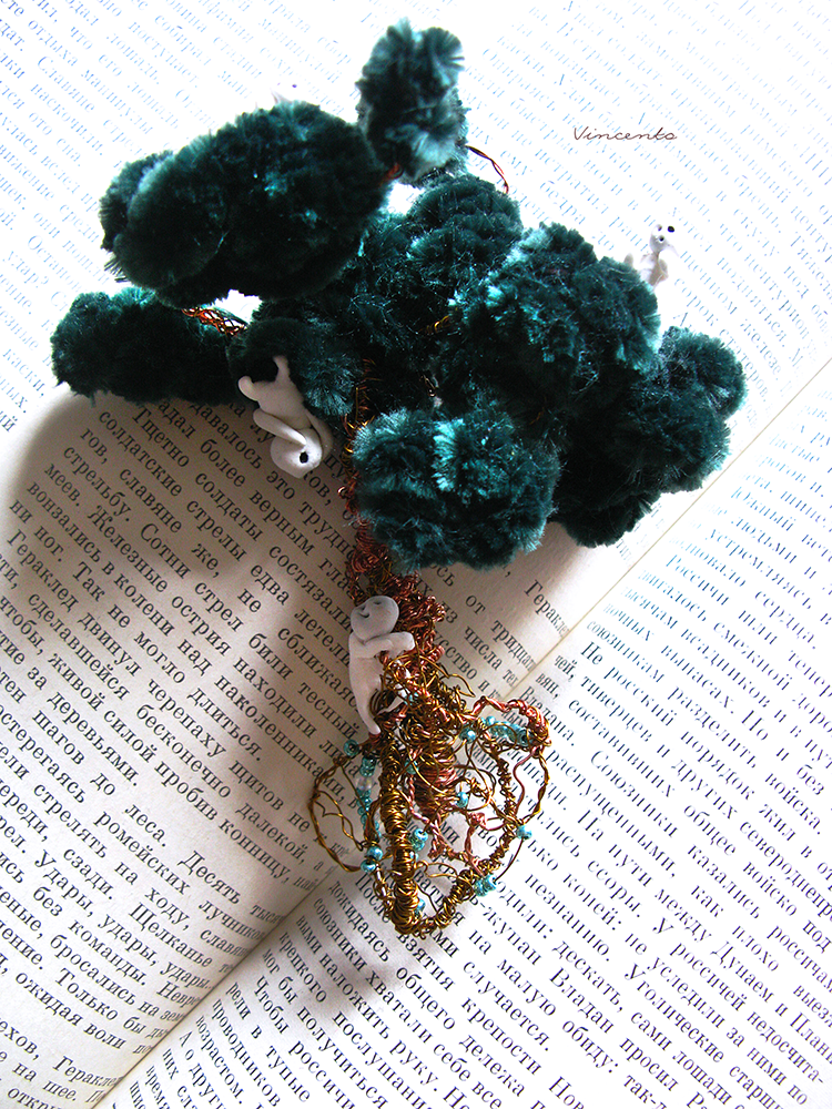 - Материалы: медная проволока, изумрудная пряжа, термоглина, металлическая фурнитура, чешский бисер.