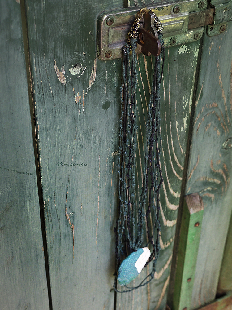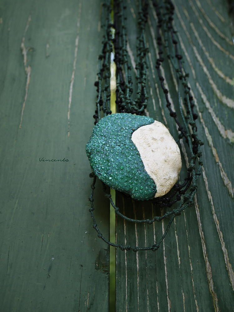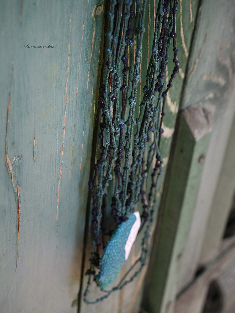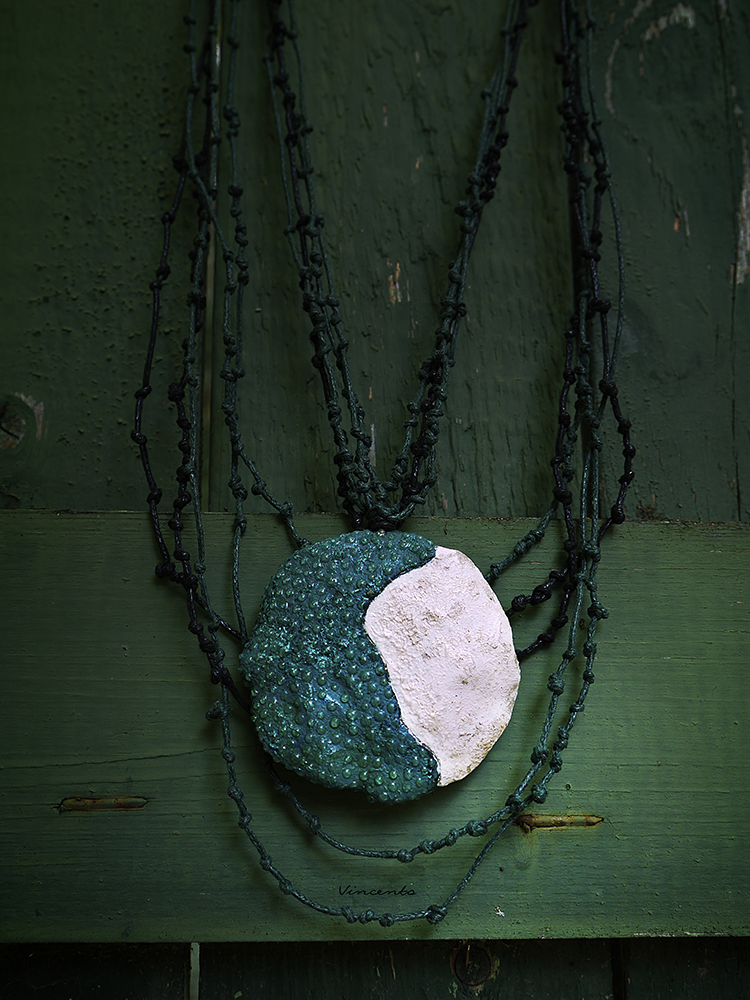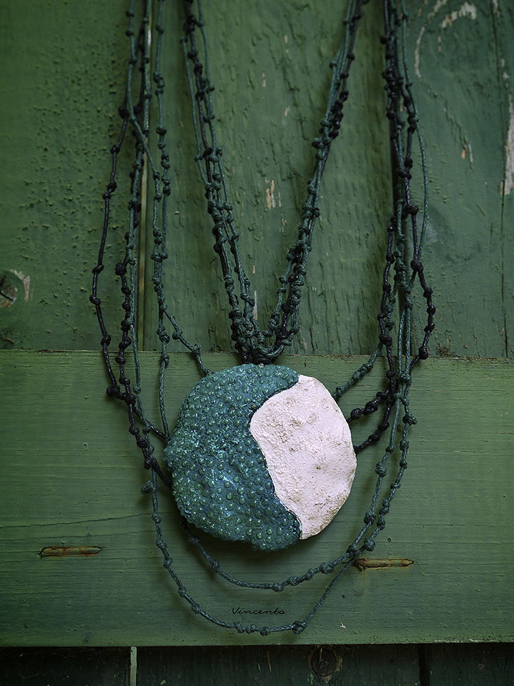 - Выполнен кулон из полимерной глины, расписан акрилом, декорирован стекловидной массой и подвешен на гирлянду шнуров с маленькими узелками, создающими эффект перепутанных ветвей, будто украшение и правда попало вам в руки прямиком из Зачарованного леса.