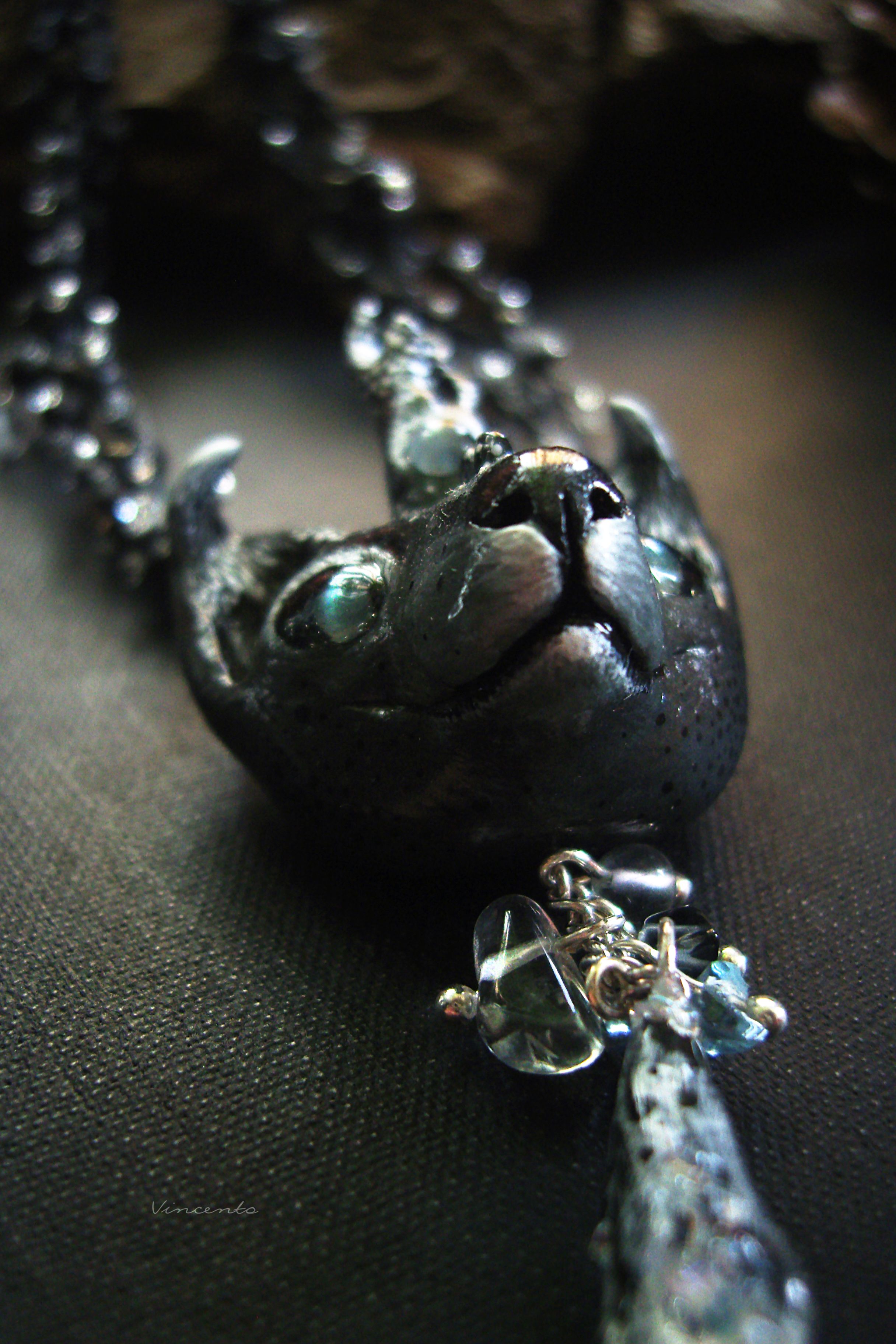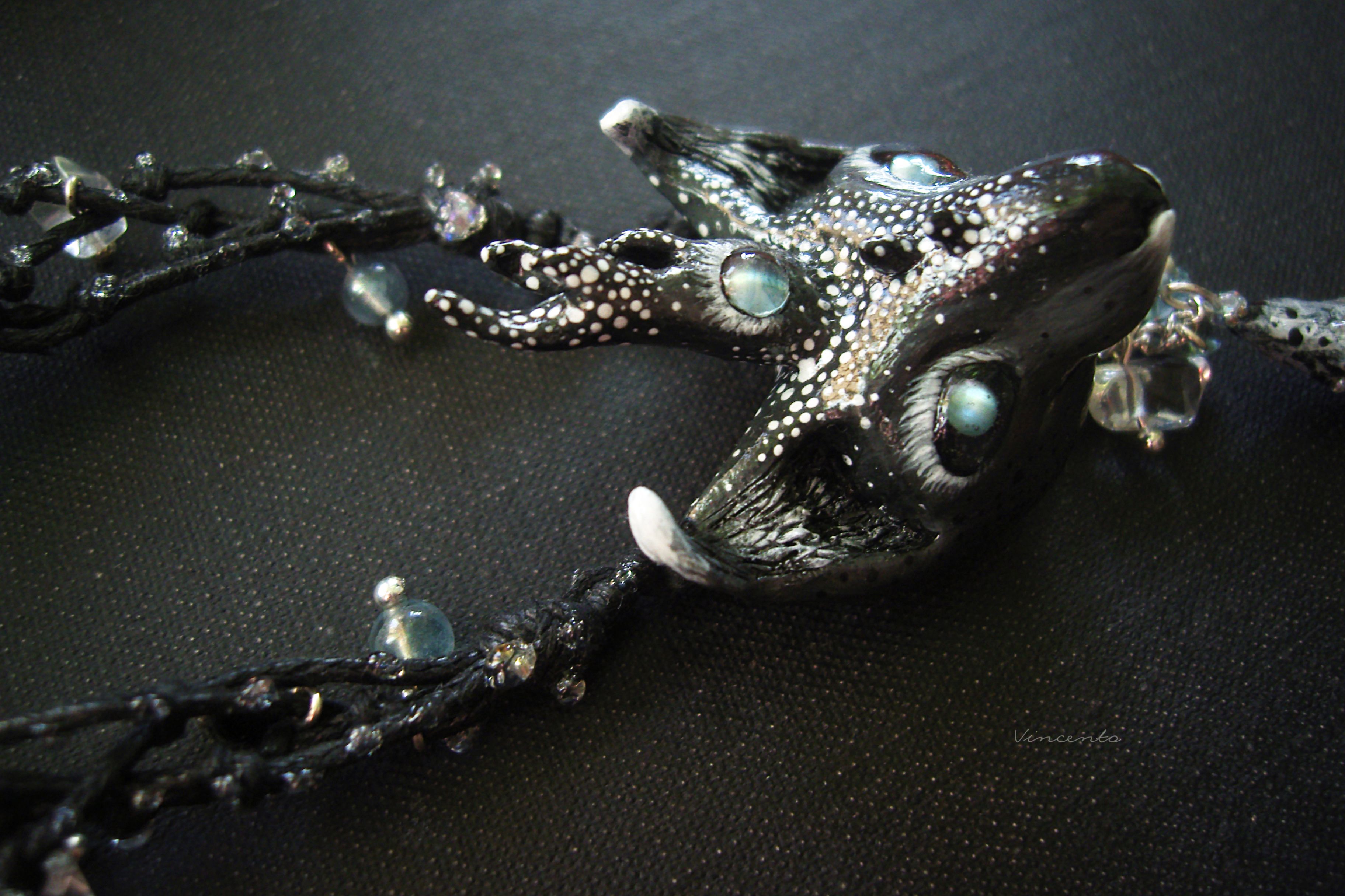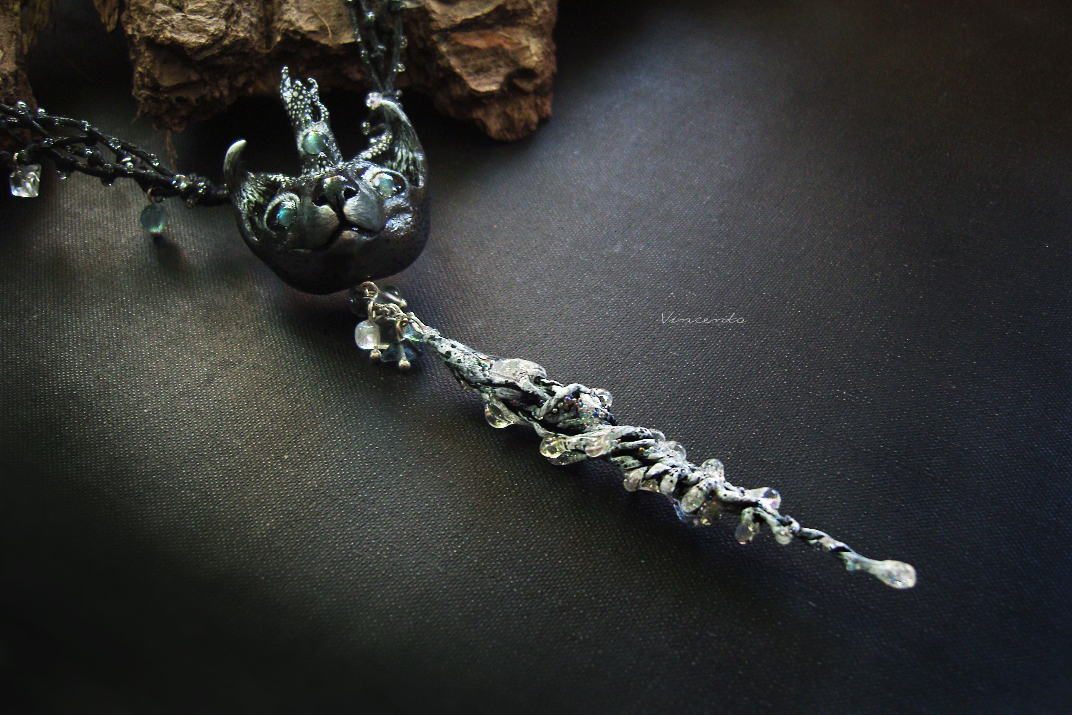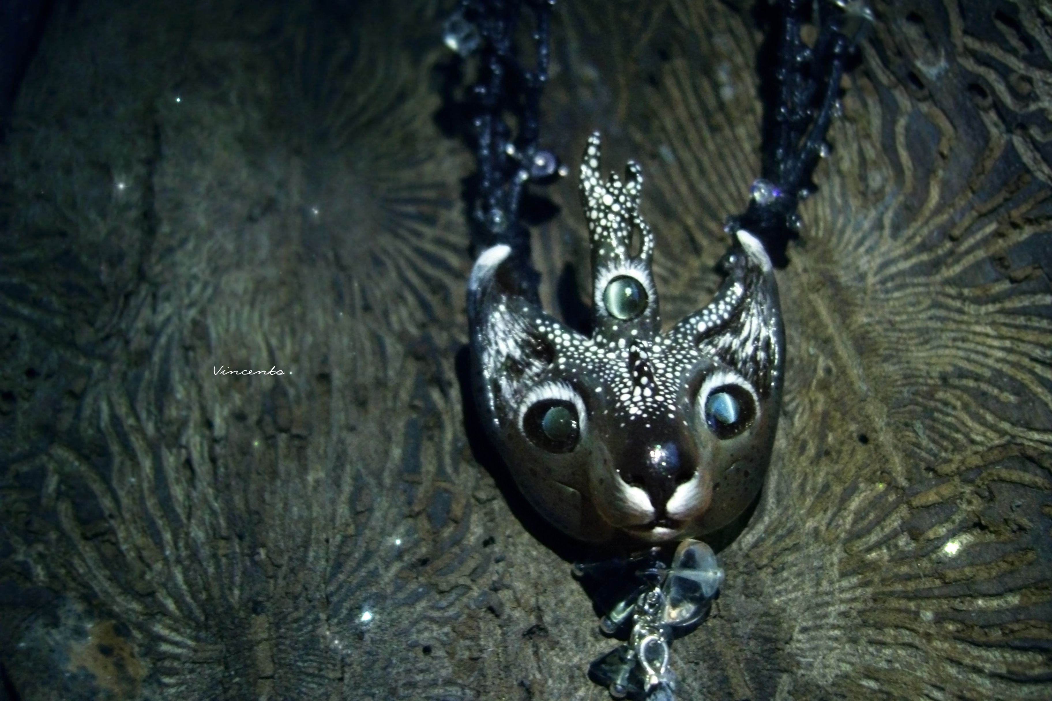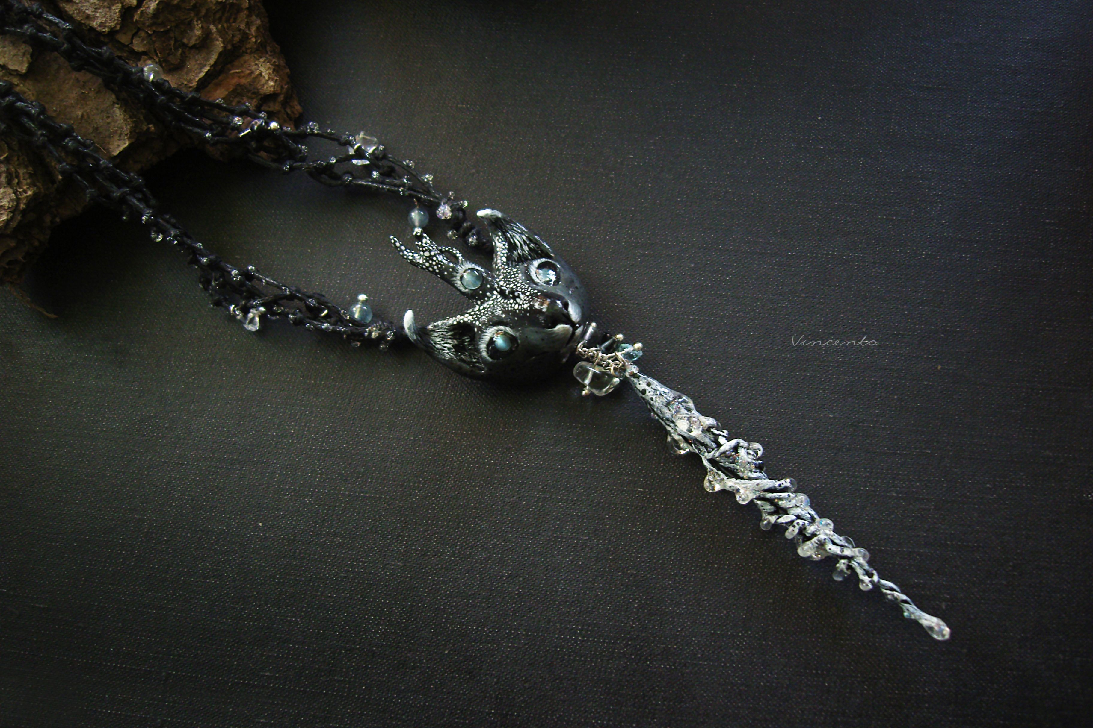 - Украшение выполнено по авторским эскизам в смешанной технике: фигурные элементы - миниатюра из термоглины и папье-маше, само колье - из вощёных шнуров. Ручная роспись акриловыми красками. Инкрустация морскими стёклышками и натуральными камнями (для глаз использованы александриты с эффектом кошачьего глаза, благодаря чему Оракул словно следит за наблюдателем, флюорит же дополняет подвески).