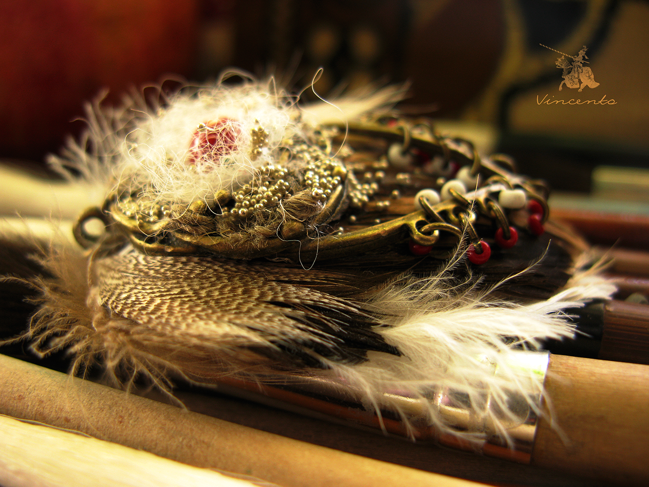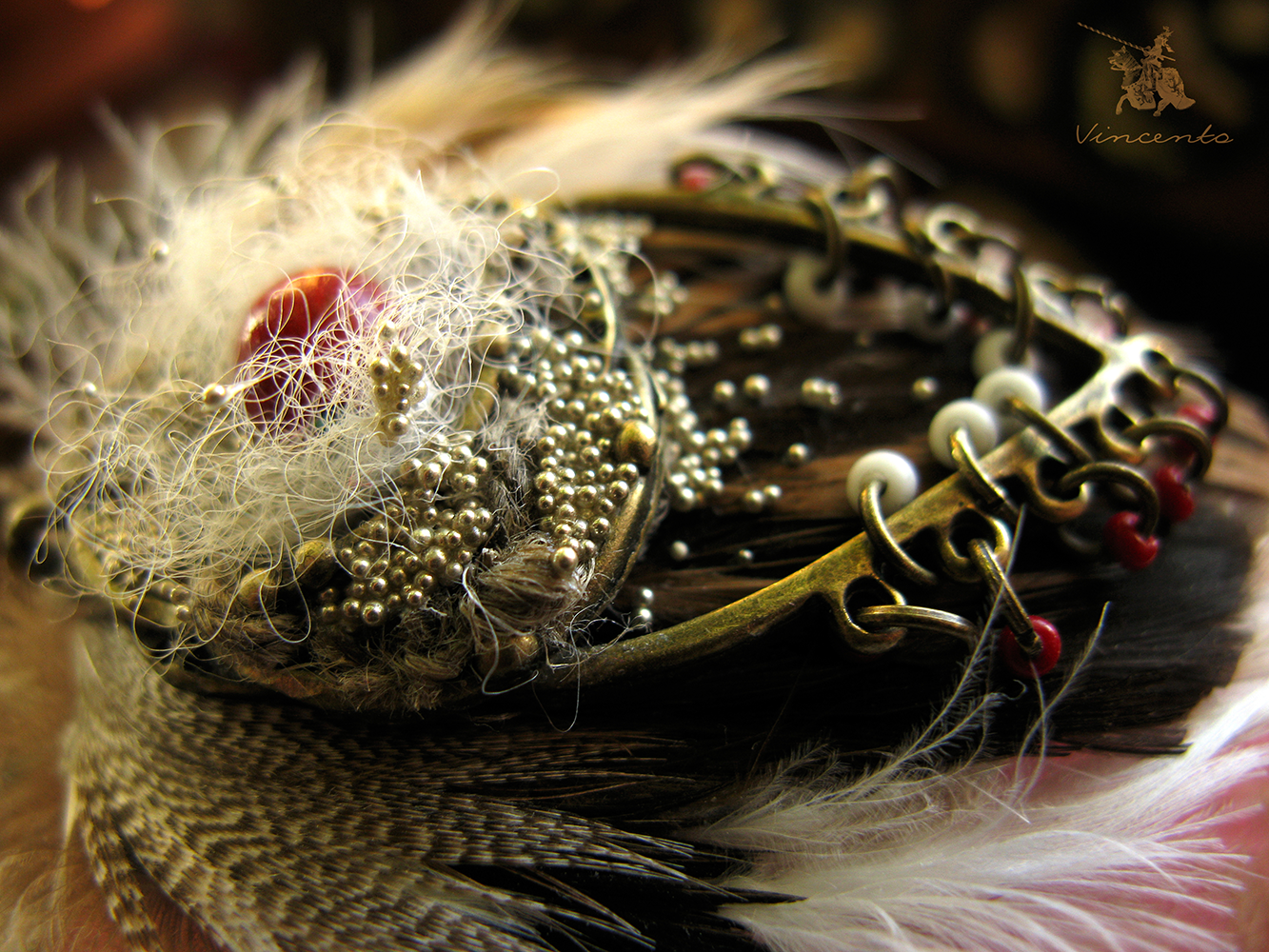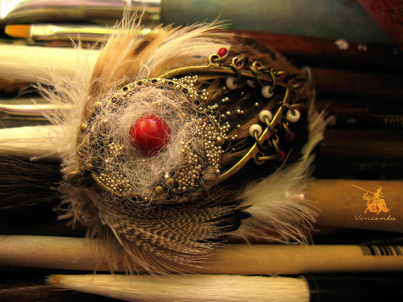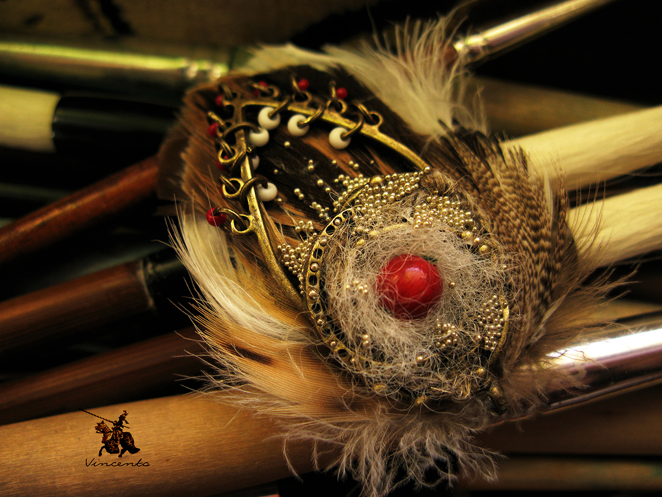 - Заколка " Робин Гуд. Легенда Шервуда" выполнена на металлическом каркасе (цвета бронзы), прошита байховой тканью, украшена перьями, шерстью, декорирована деревянной бусиной, тёмно-красным чешским и белым бисером, золотистым микробисером, напоминающим россыпь драгоценных камушков... Длина заколки - около 5 см.