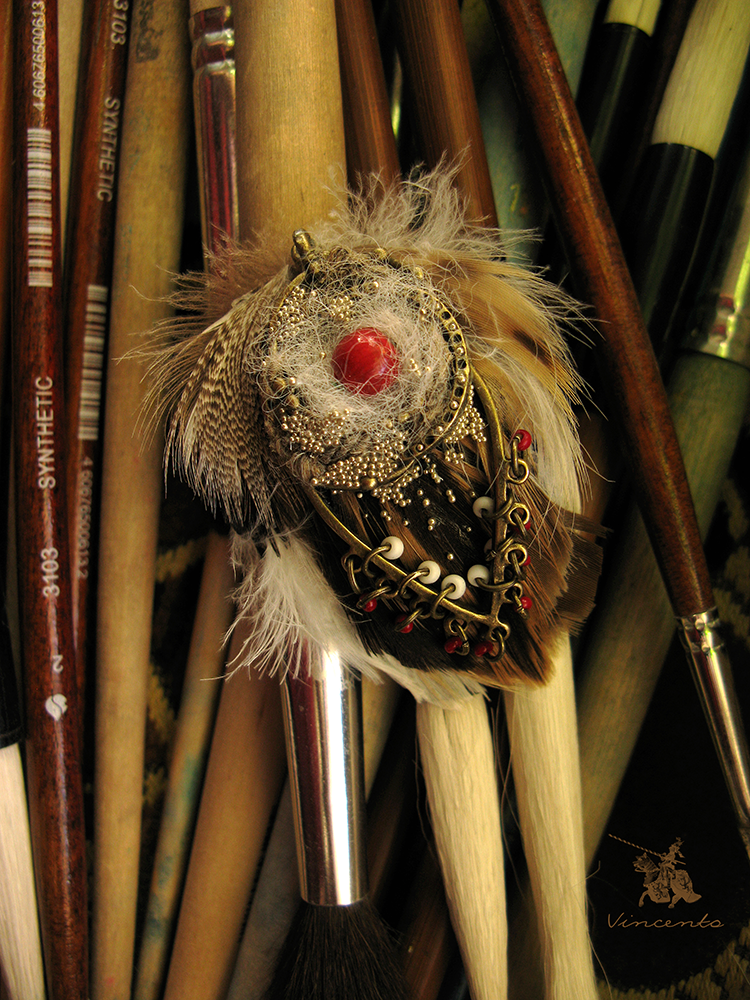- Заколка с перьями " Робин Гуд. Легенда Шервуда" - пёстрый, но не эпатажный аксессуар, выполненный в естественной, даже немного "лесной" цветовой гамме (разнообразные оттенки коричневого, серый, красный, белый очень гармонично сочетаются друг с другом).