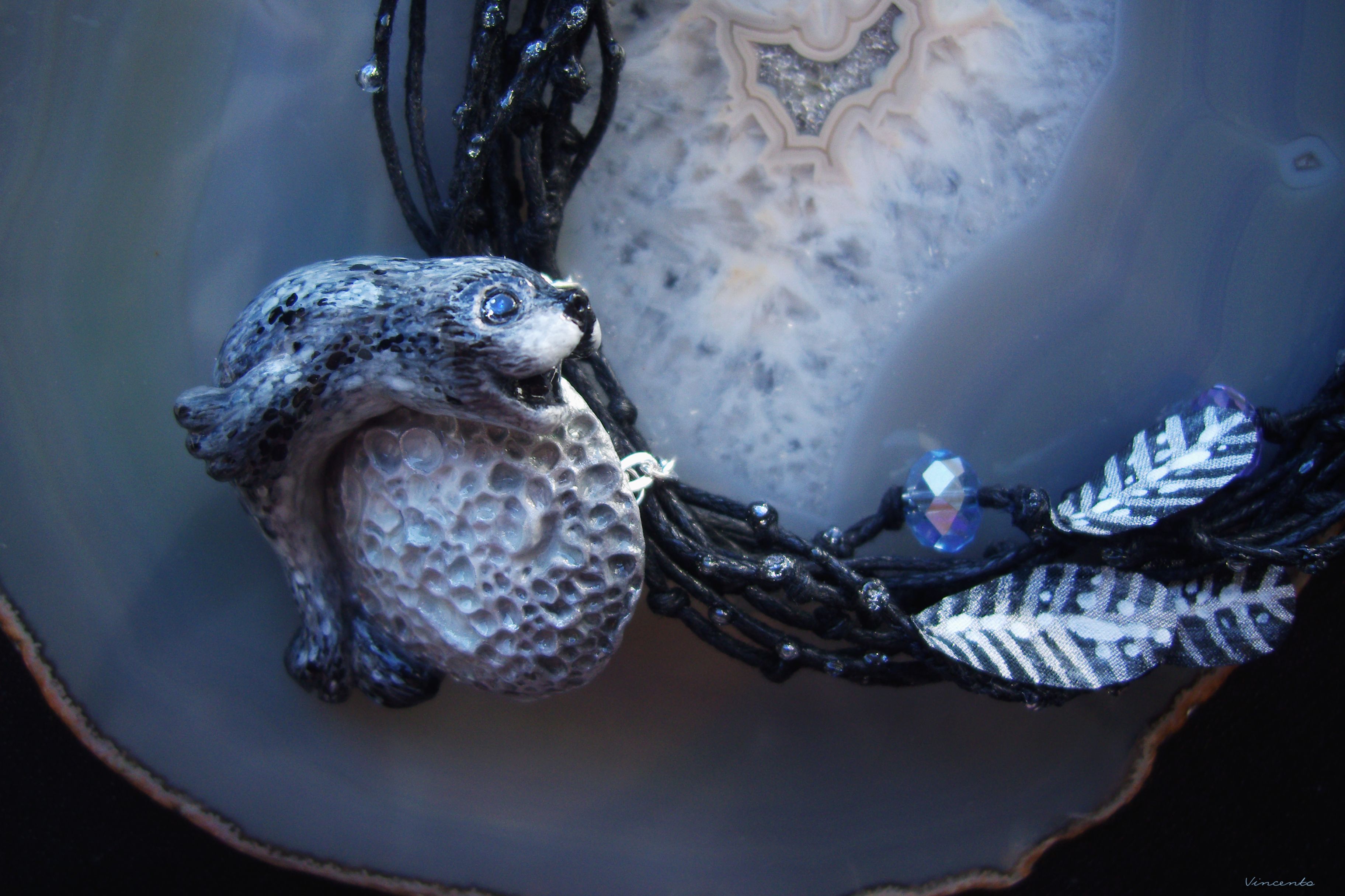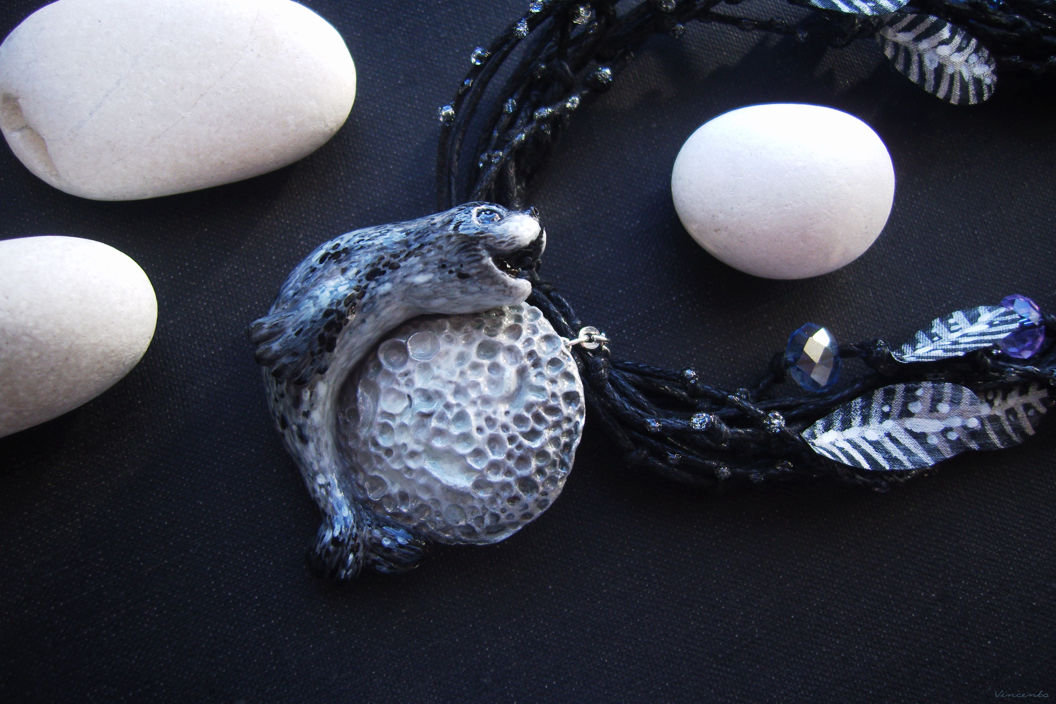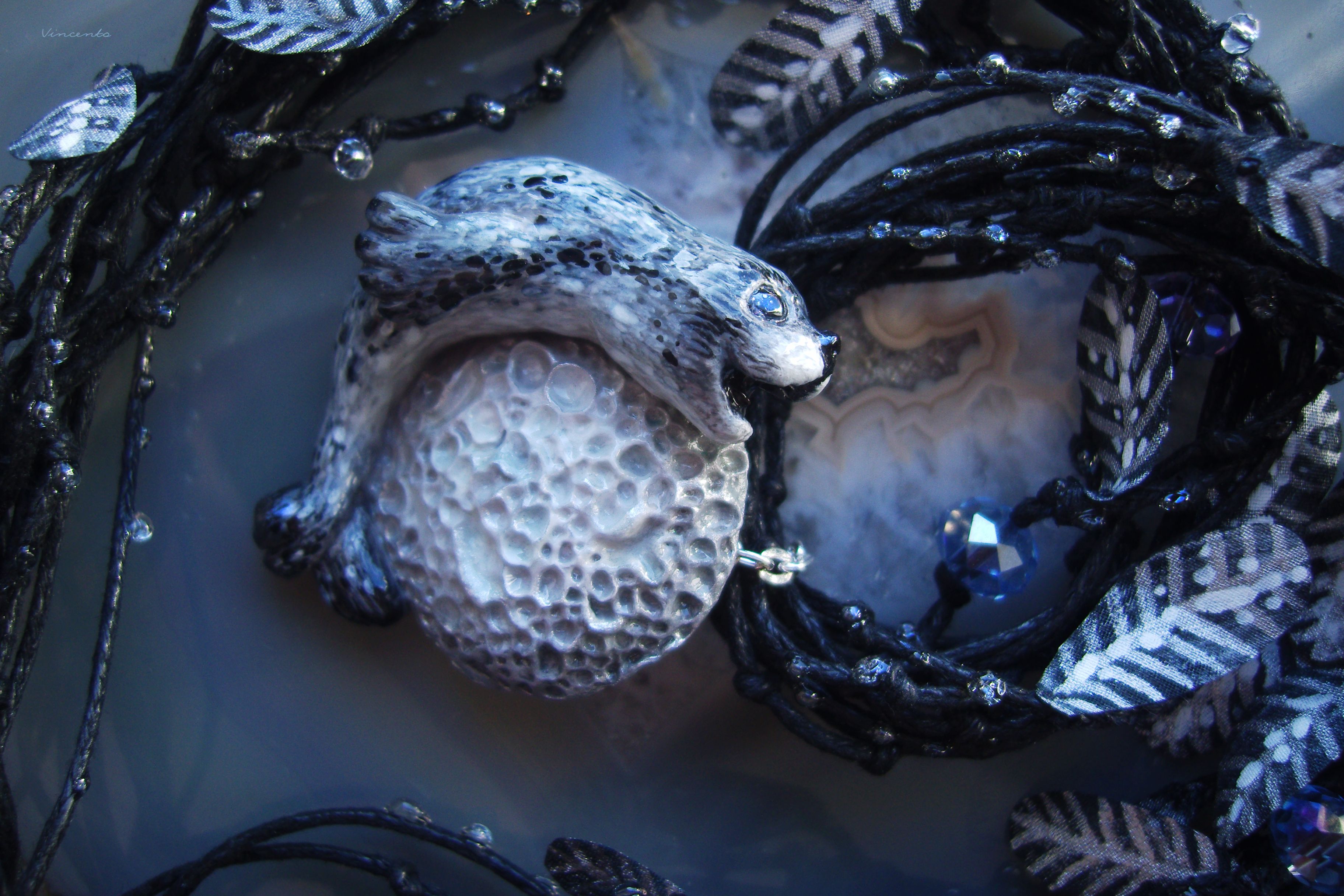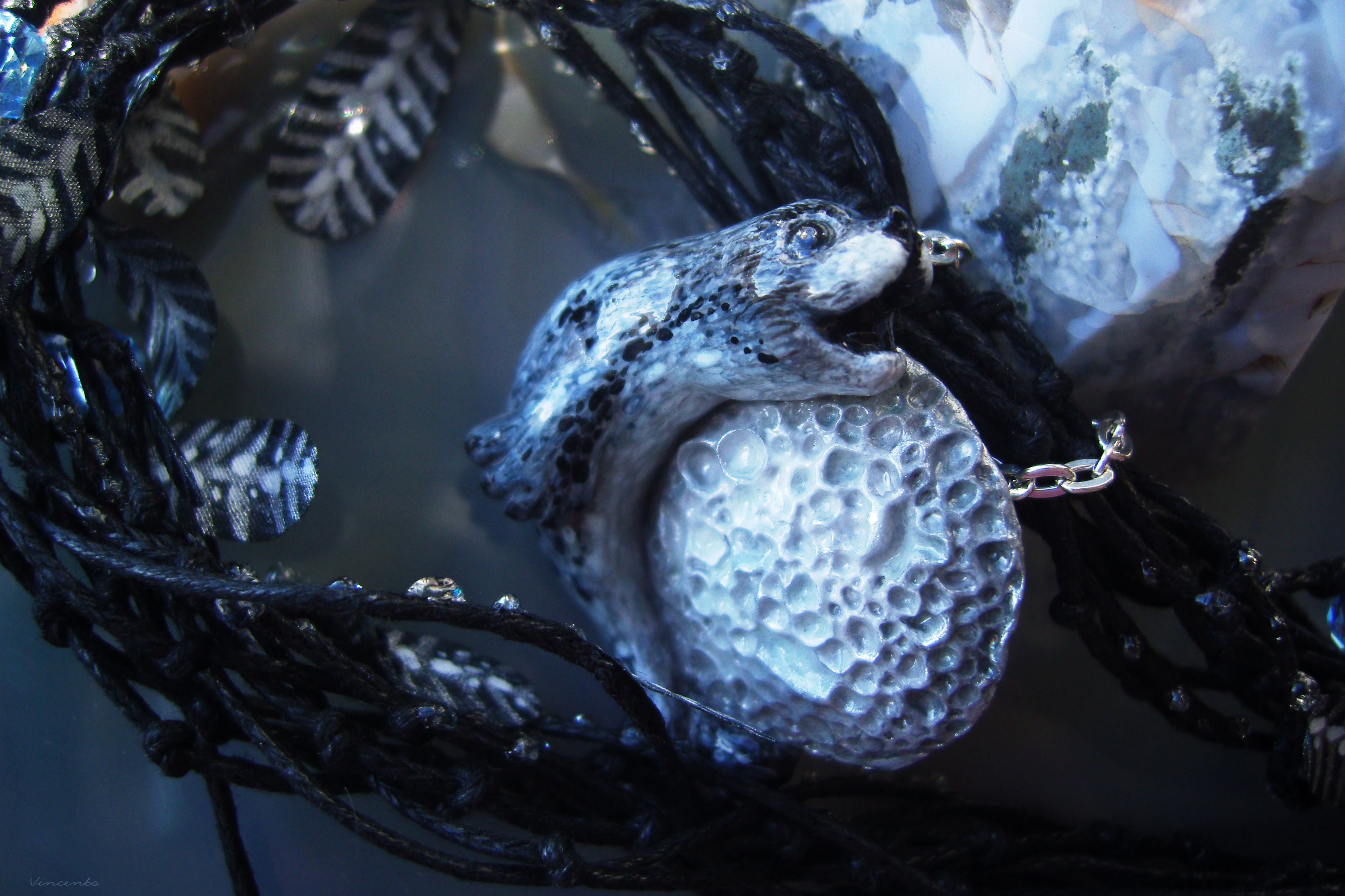 - Волшебное украшение с диском луны, тюленем, шёлковыми лепестками, чешским хрусталём и сверкающими капельками холодного океана.