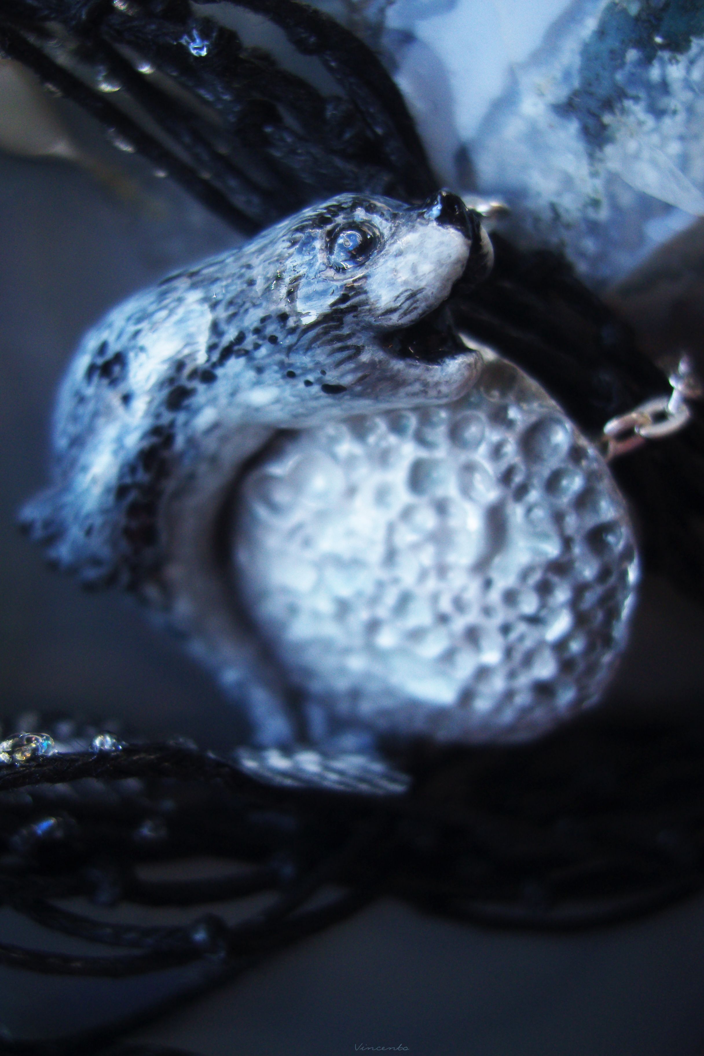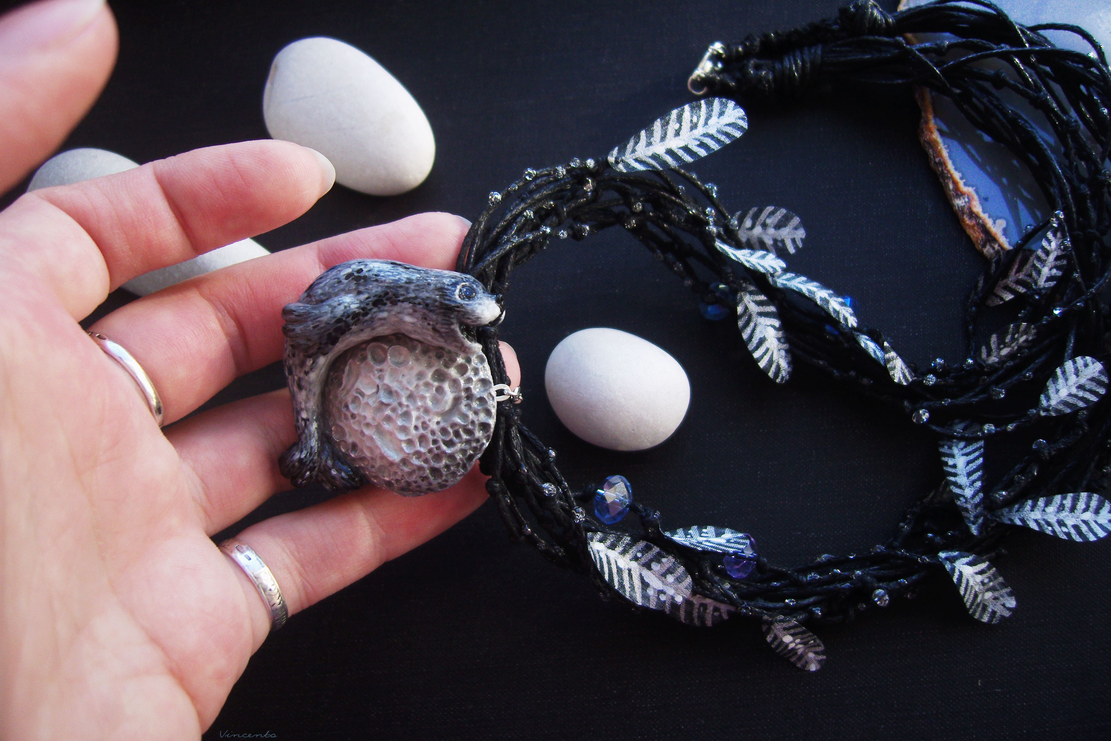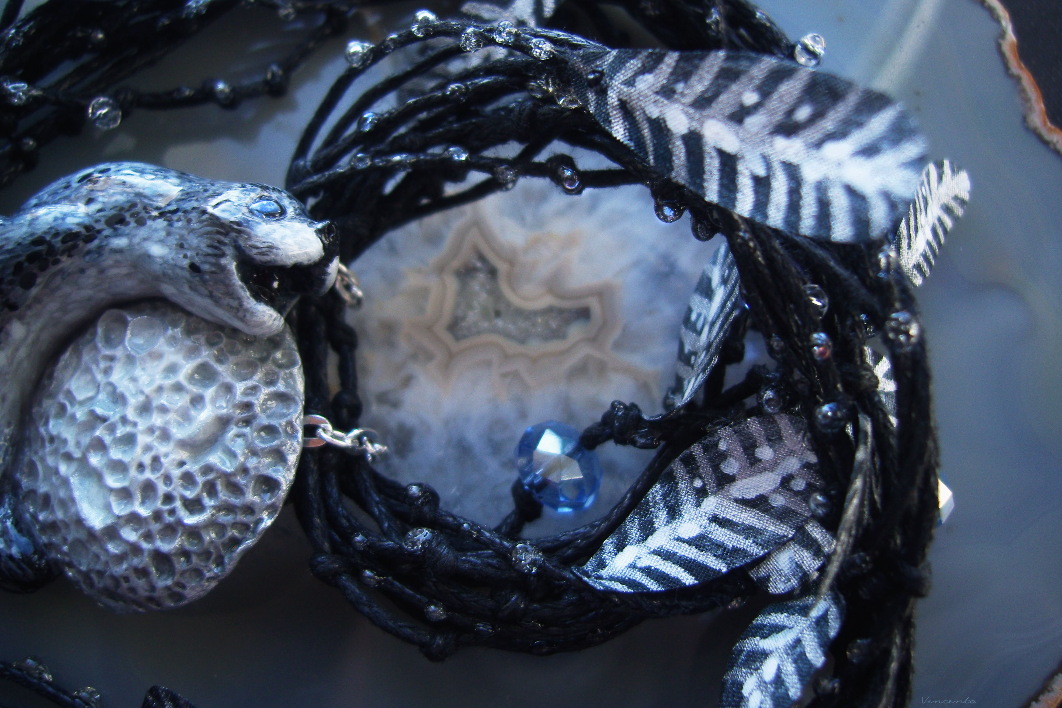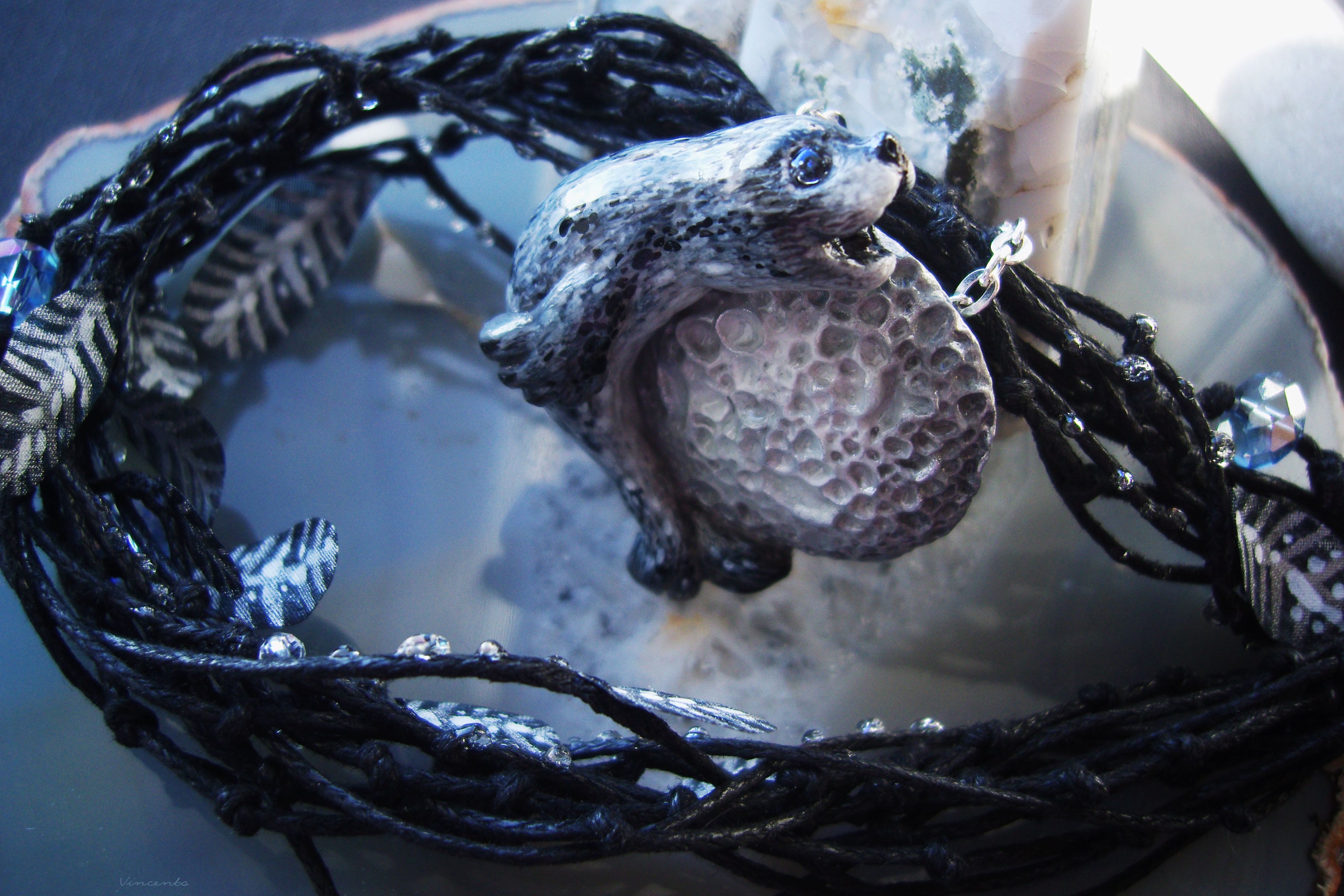 - Волшебное украшение с диском луны, тюленем, шёлковыми лепестками, чешским хрусталём и сверкающими капельками холодного океана.