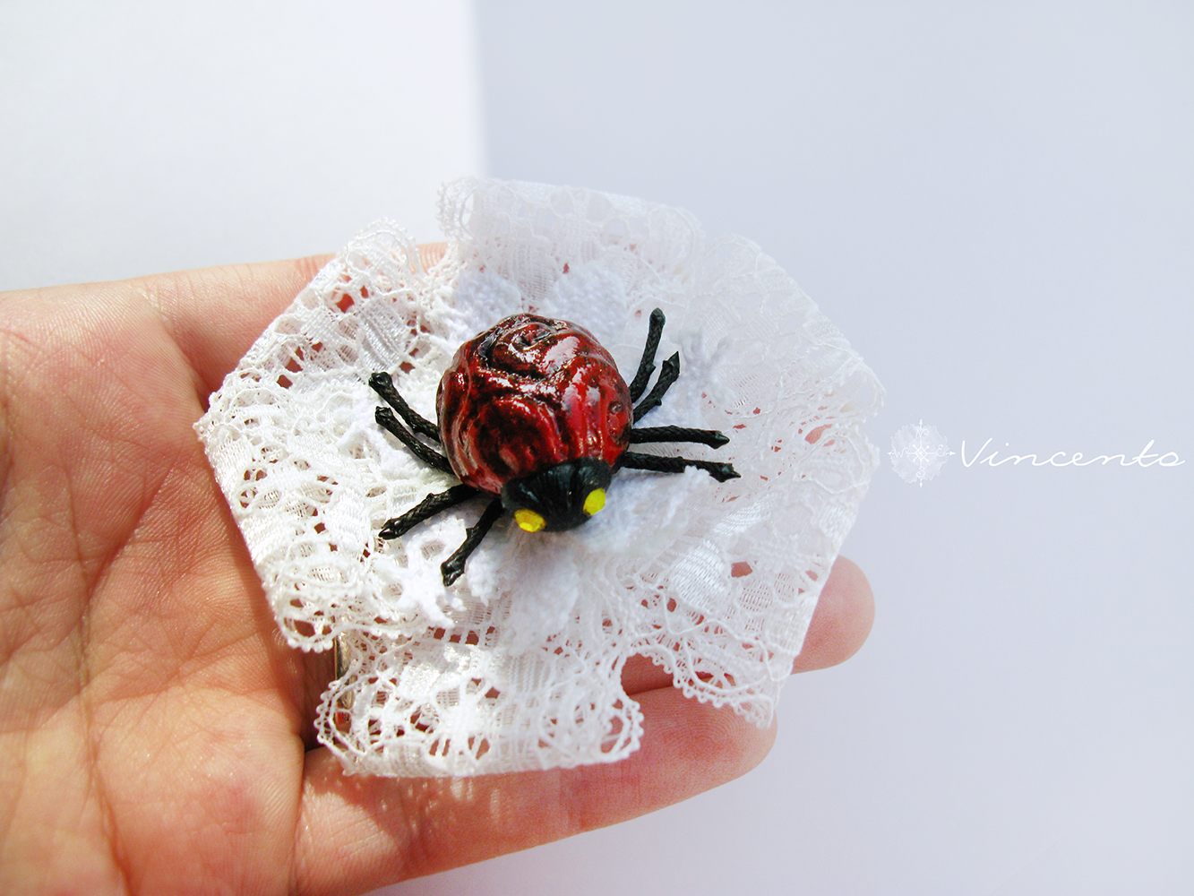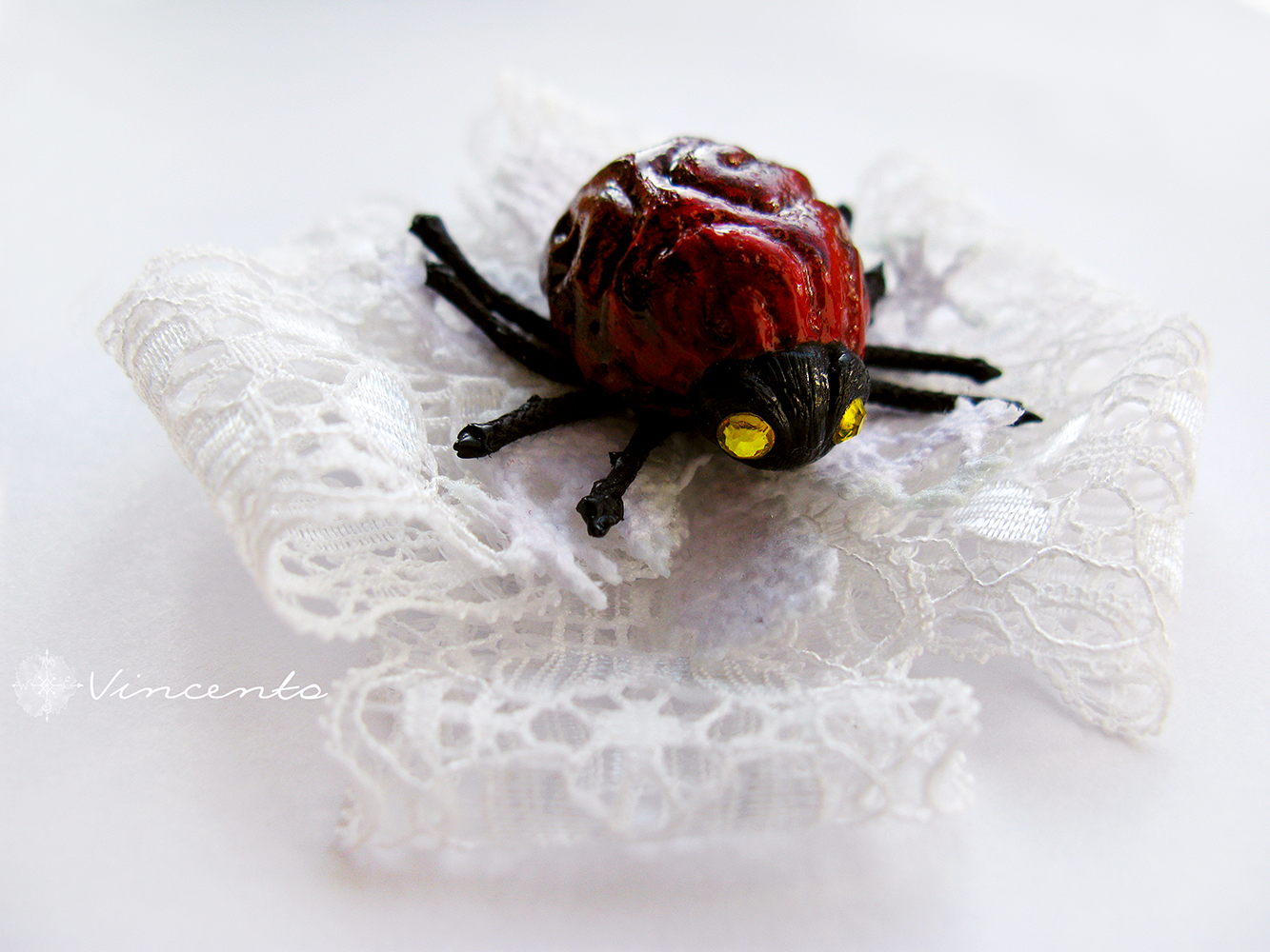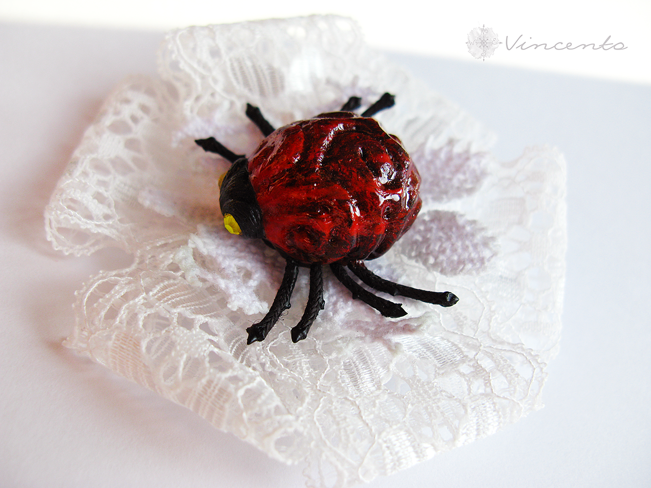 Необычная брошь с кружевом и жуком - "Хранитель"