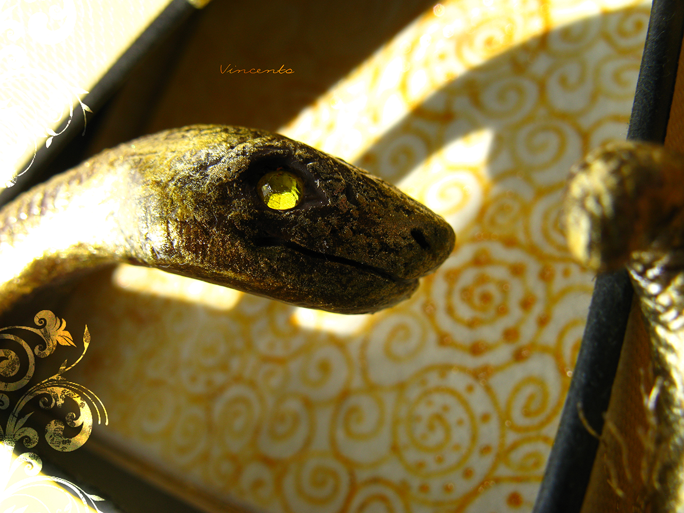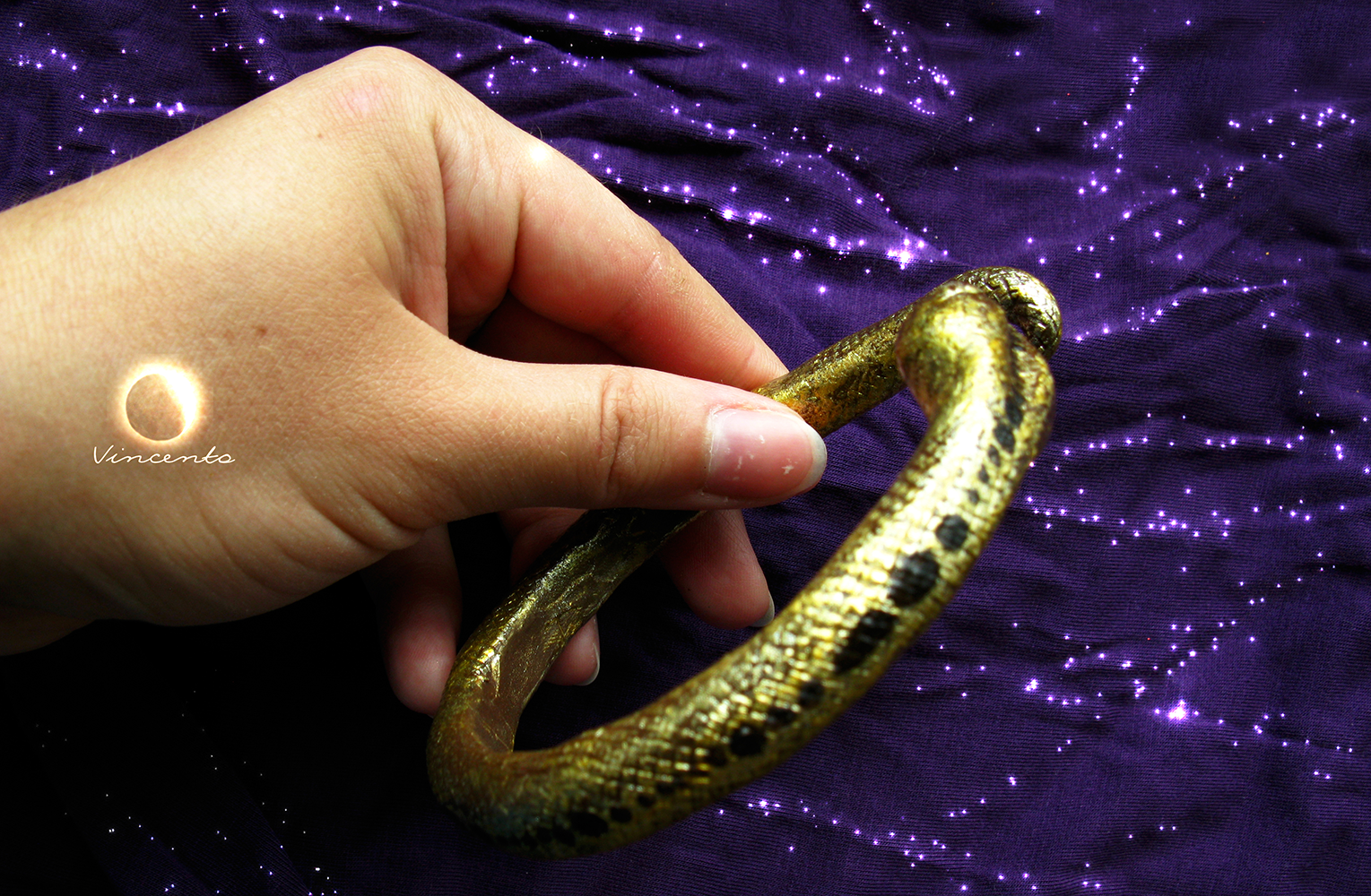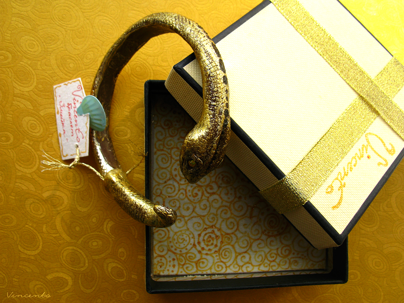 - "Золотая змейка" - необычный браслет золотистого цвета (акрил, лак). Он выполнен полностью вручную из полимерной глины на проволочном каркасе. Застёжка - подвижный, откручивающийся хвостик. Глазки - золотые (жёлтые) стразы Сваровски. Точная копия невозможна! (На фото представлены два разных браслета в виде змеек.)
