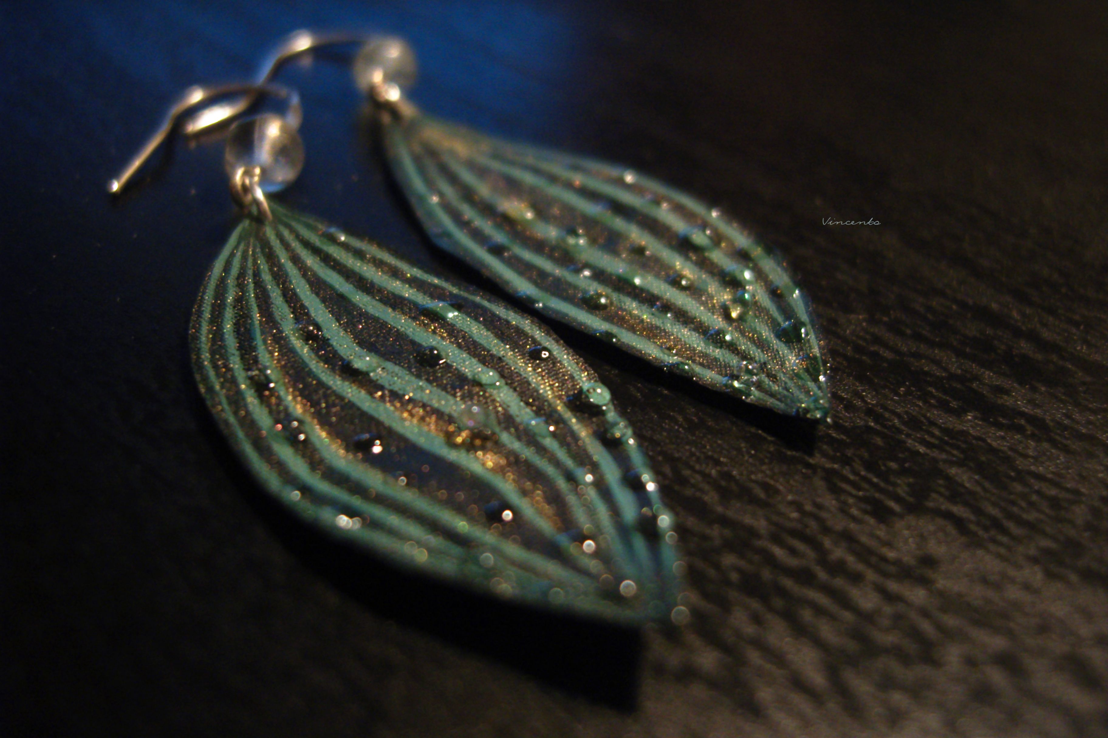 - Серьги ненавязчиво завершают образ, повторяя лепестки русалочьего плавника. Они дополнены фактурными бусинами натурального флюорита.