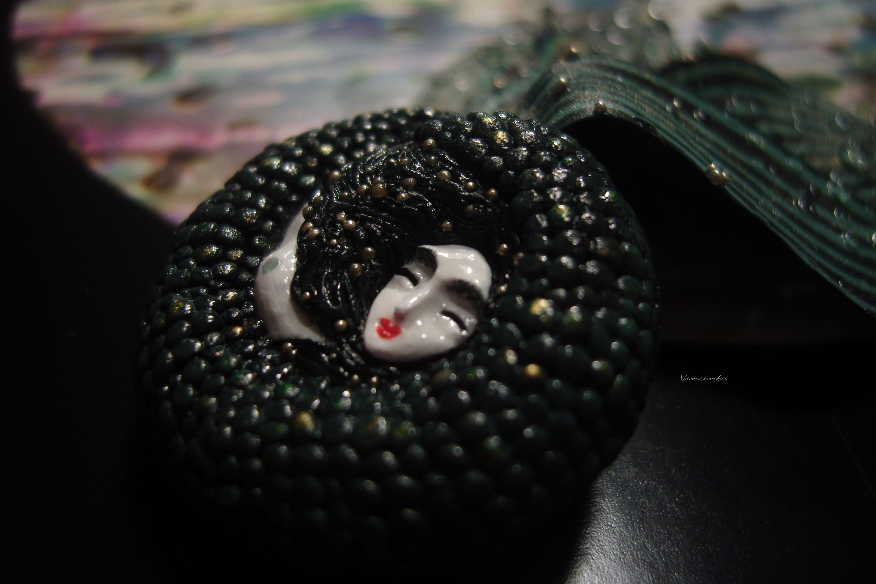 - Материалы: термоглина, папье-маше, акриловые краски, лак, стекловидная масса, микробисер, металлическая фурнитура, натуральный флюорит.