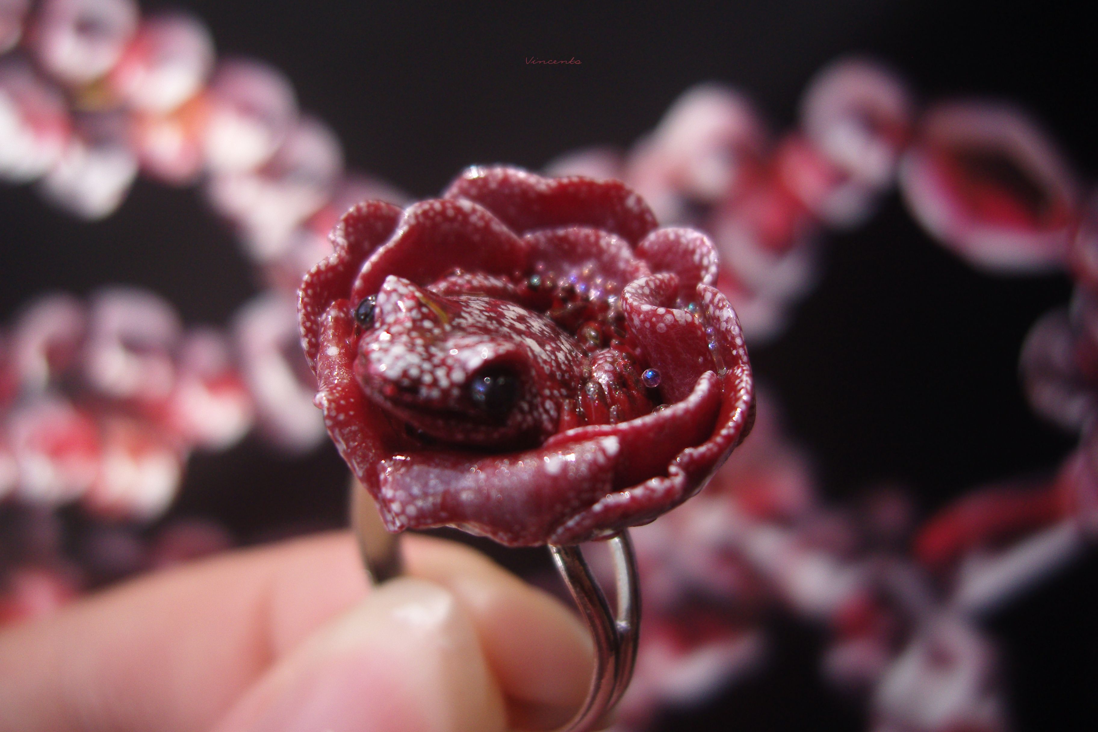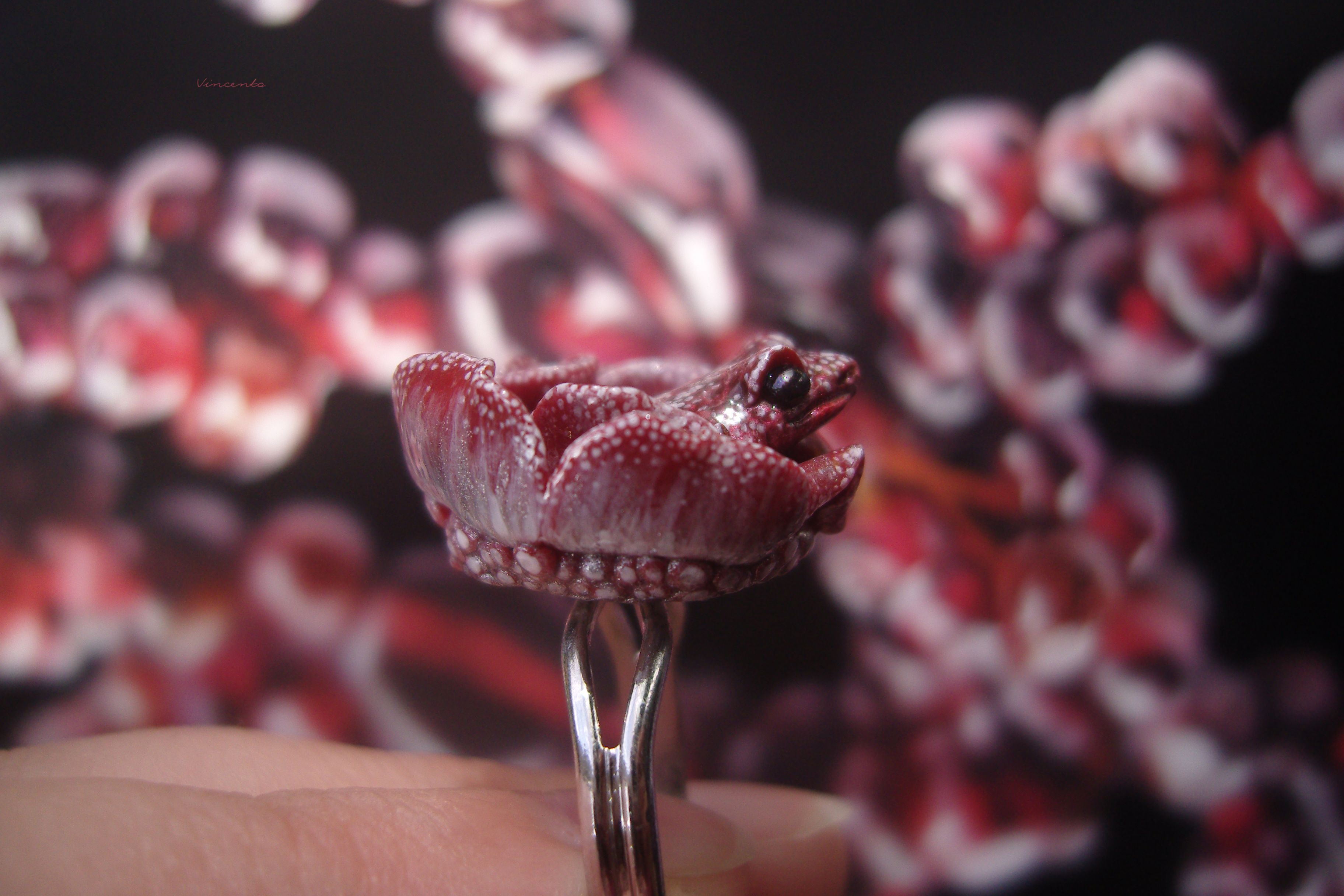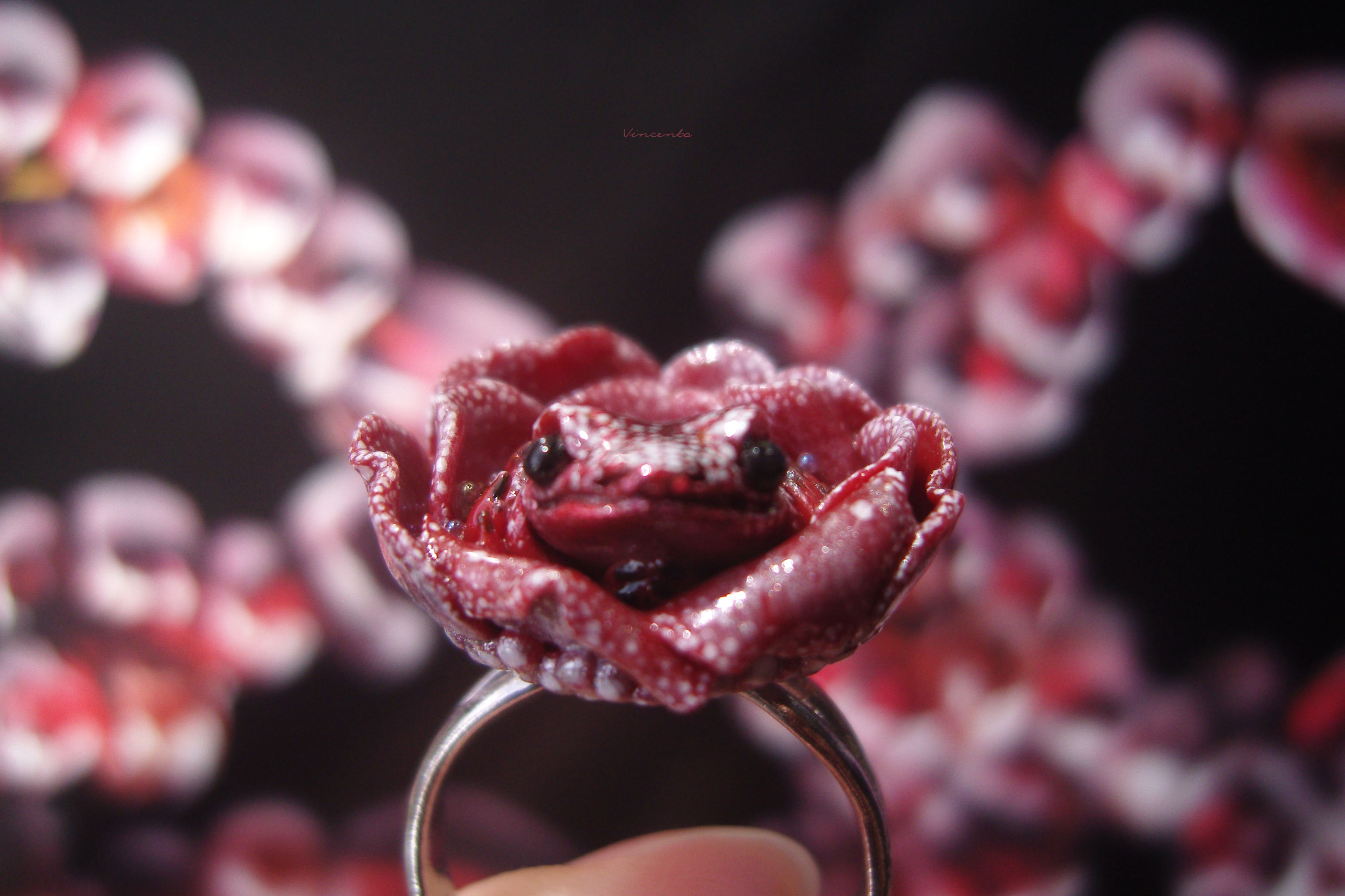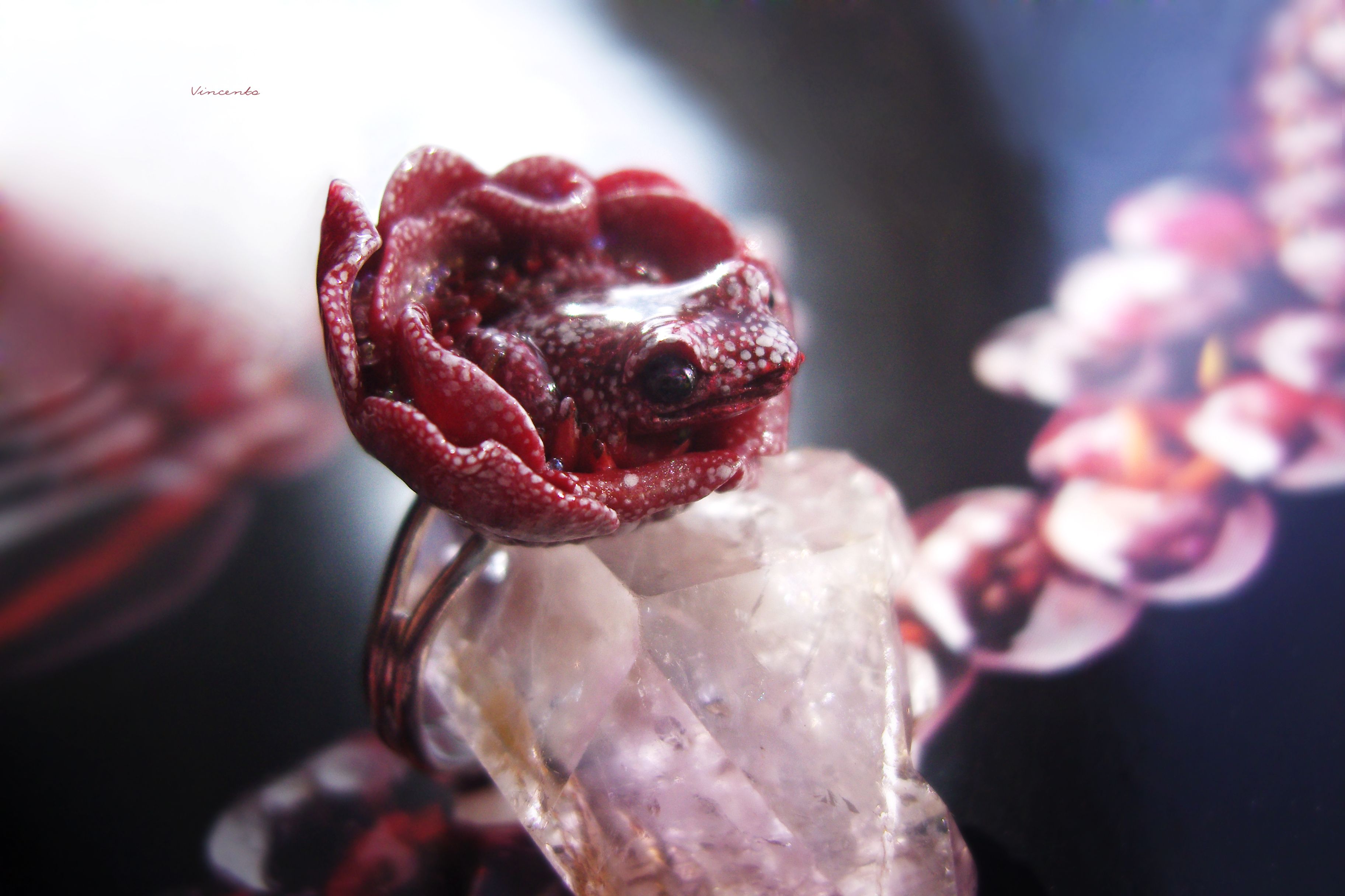 - Элегантное, парадное и изящное кольцо в виде фэнтезийного цветка дикого сербарина и миниатюрной лягушечки.
