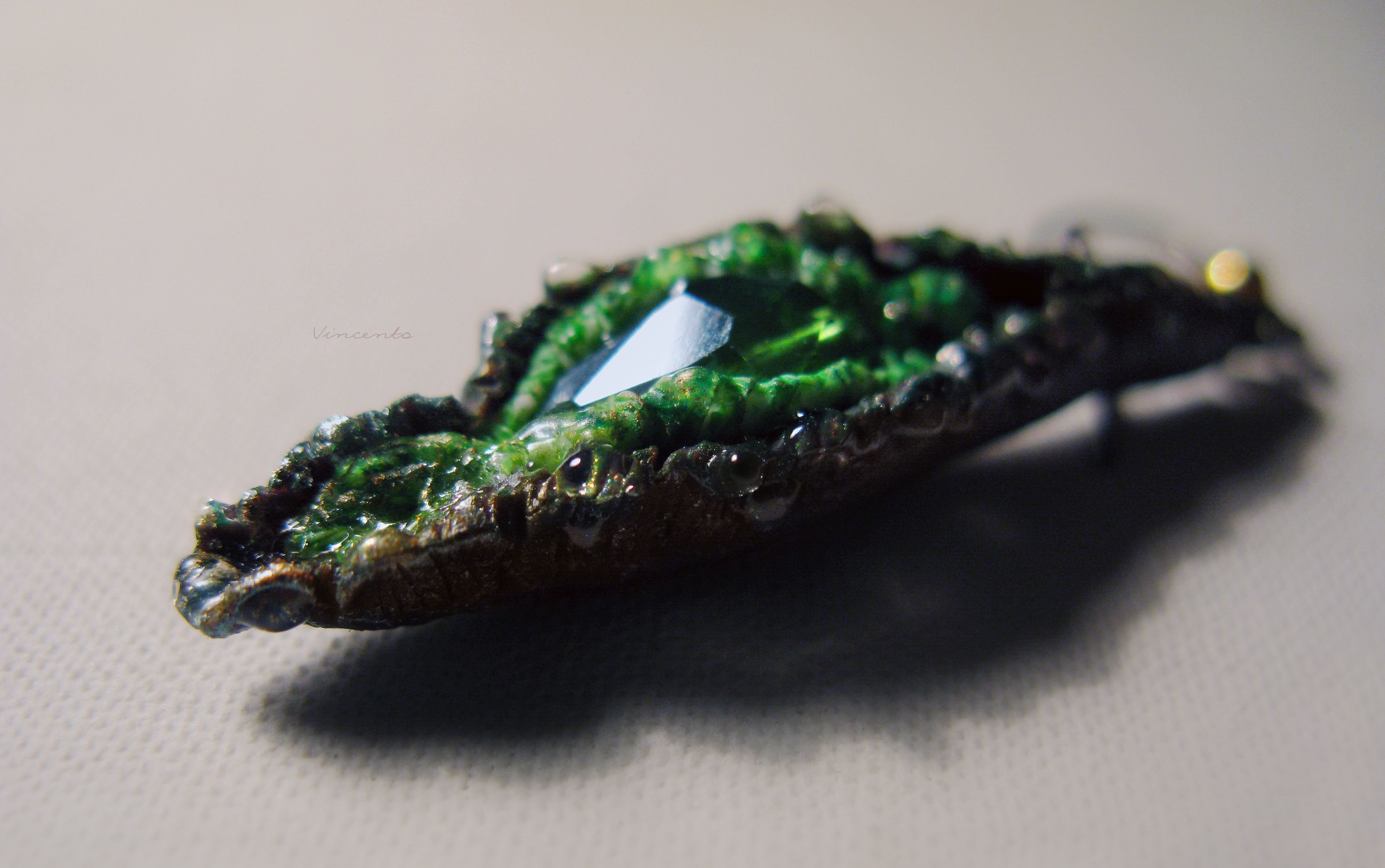 - Сама подвеска - дриада - завершается гранёным хрусталиком изумрудного стекла, перекликаясь с центральными элементами серёжек.