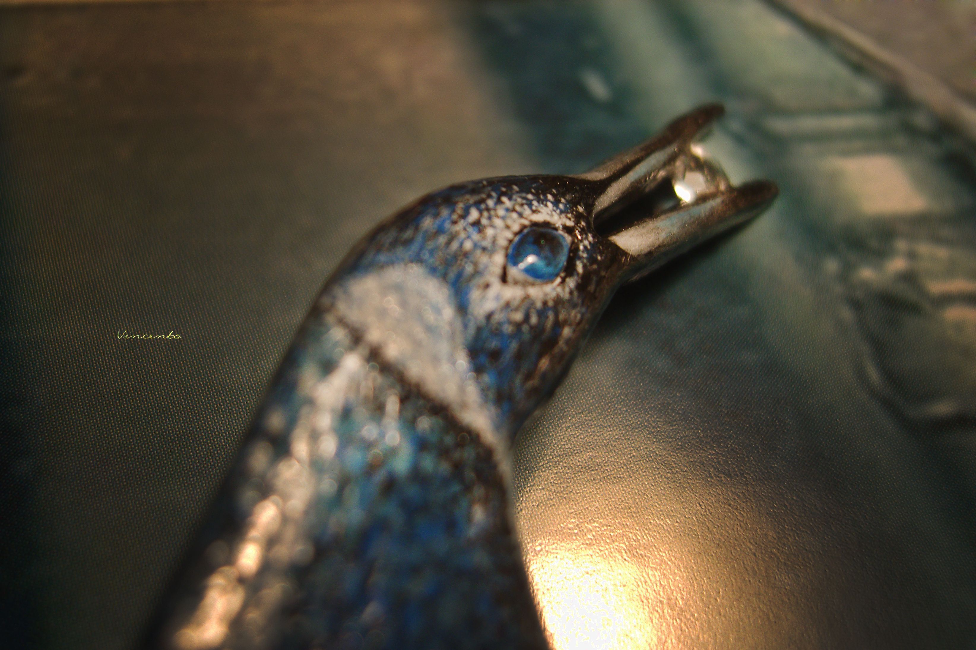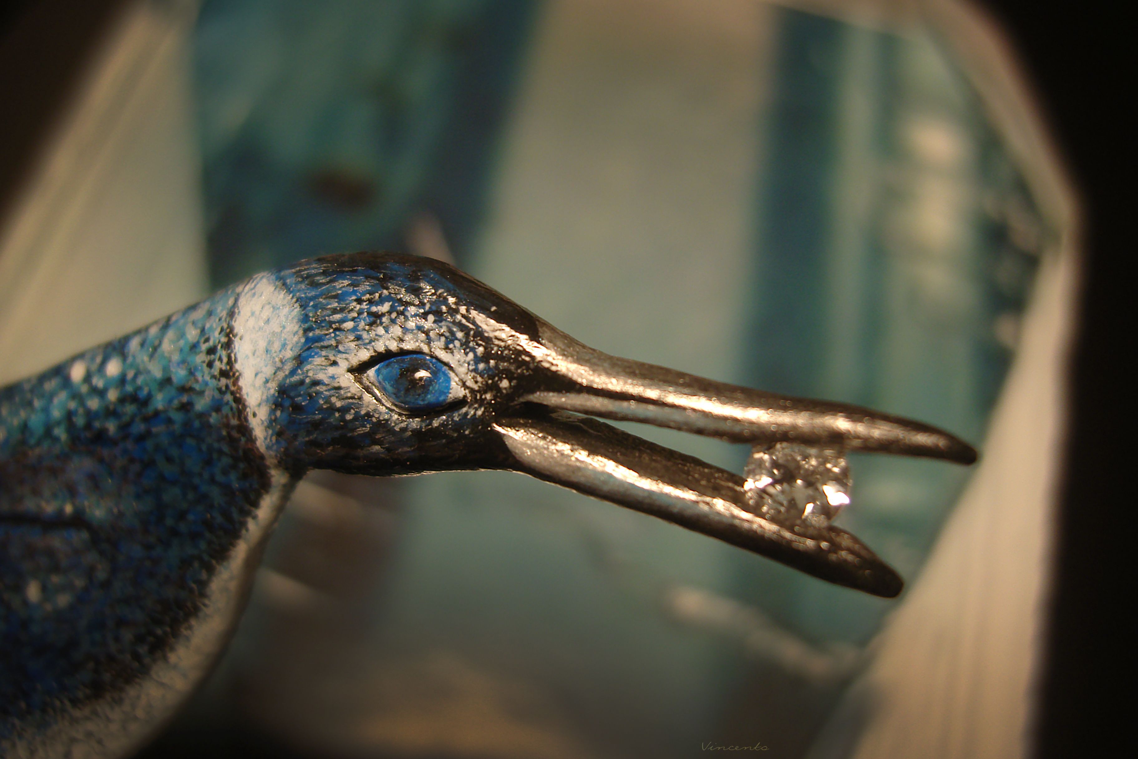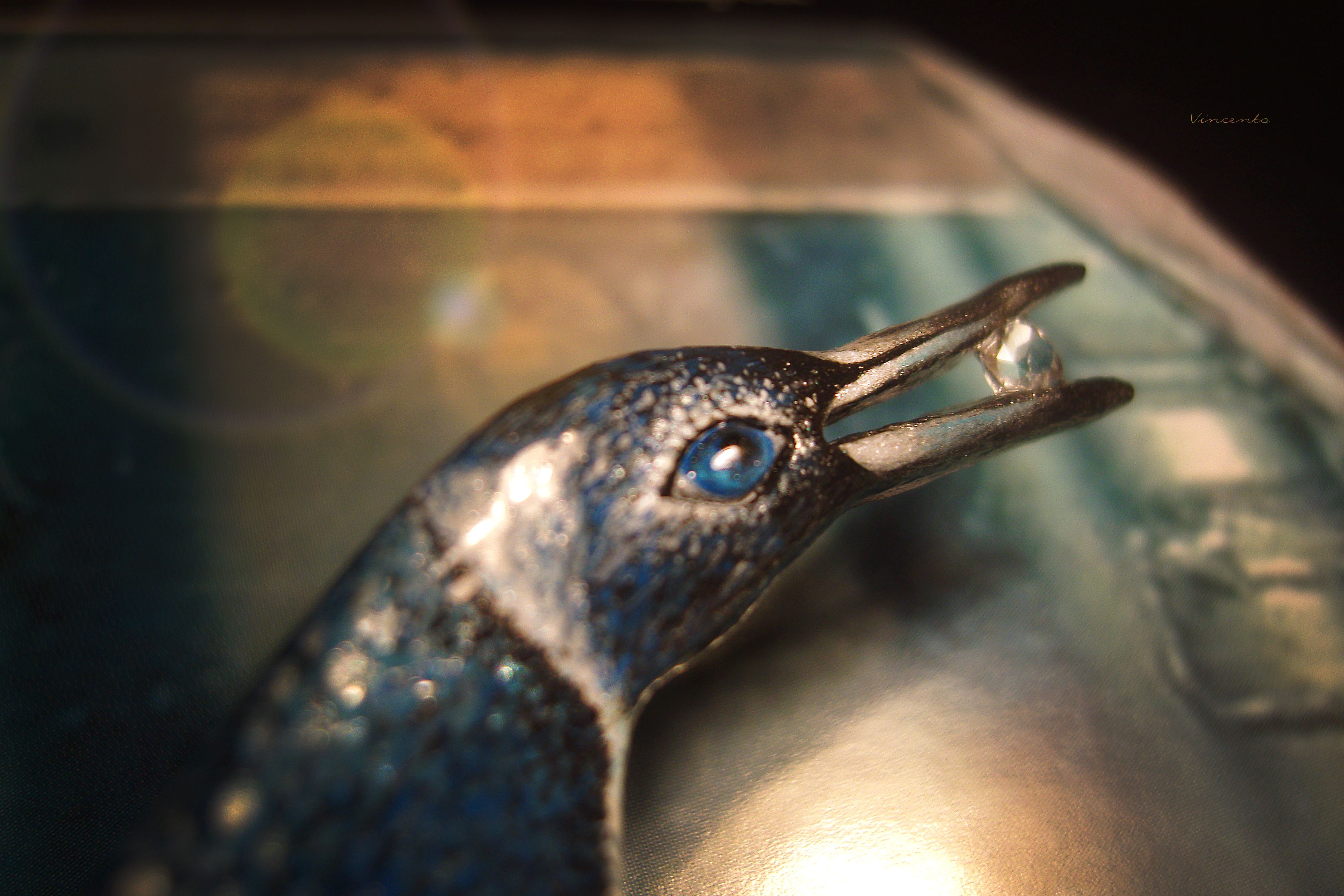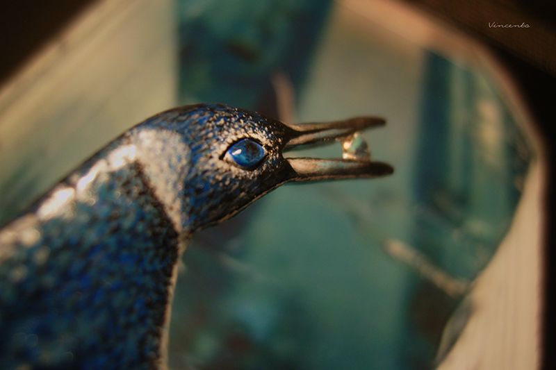 - Клюв серебристый, в нём, словно в зеркале, отражается кристально-прозрачный камешек-льдинка морганита.