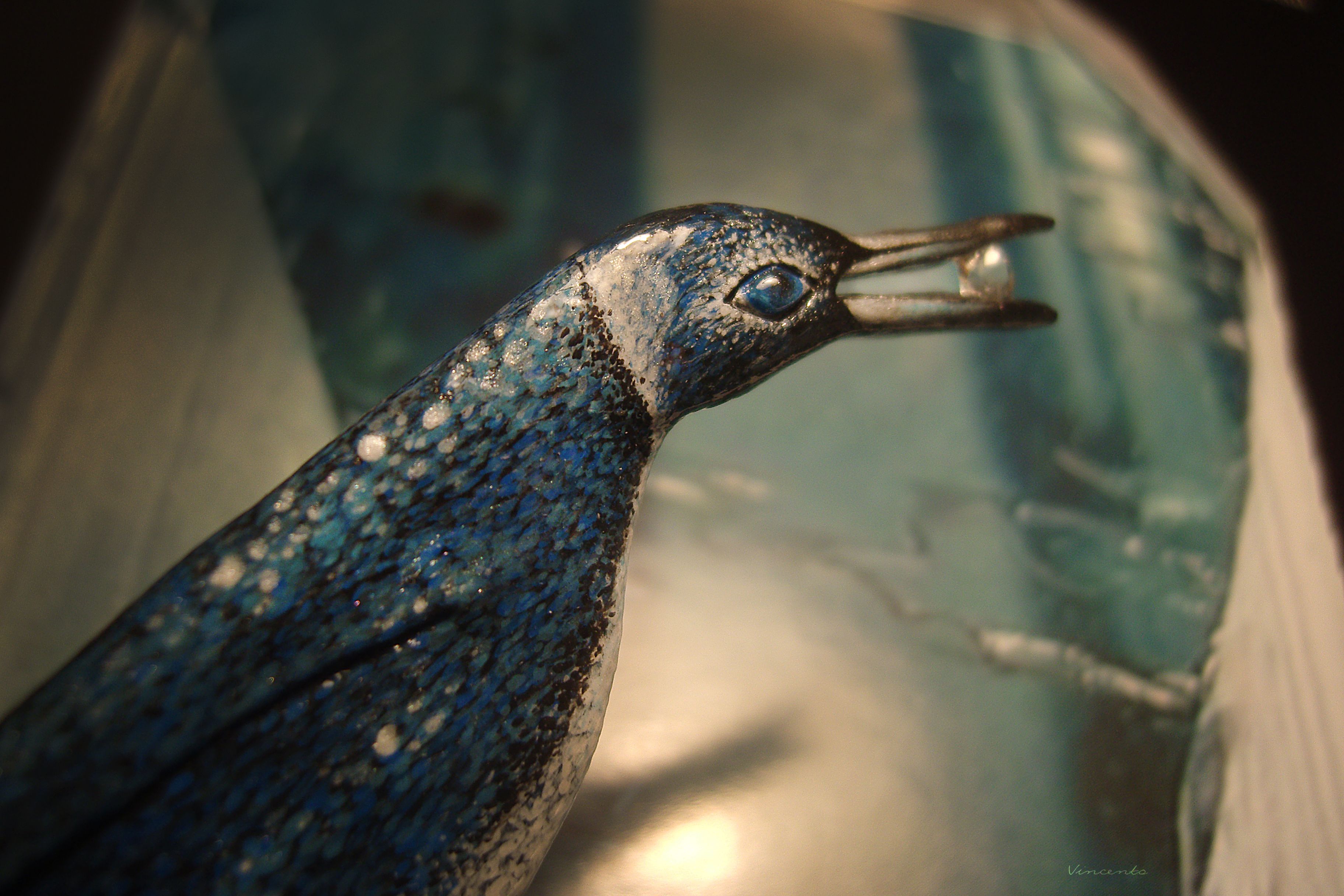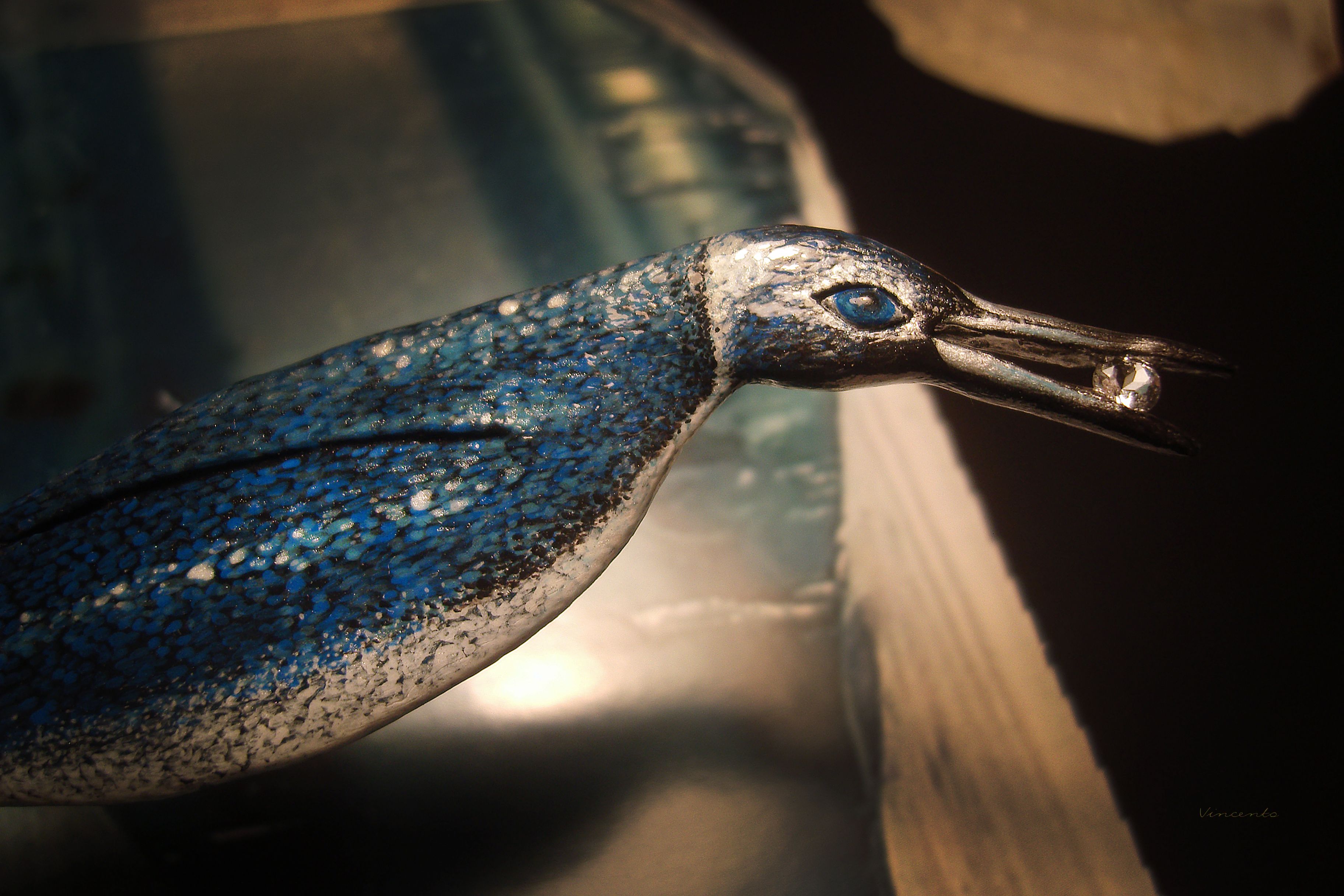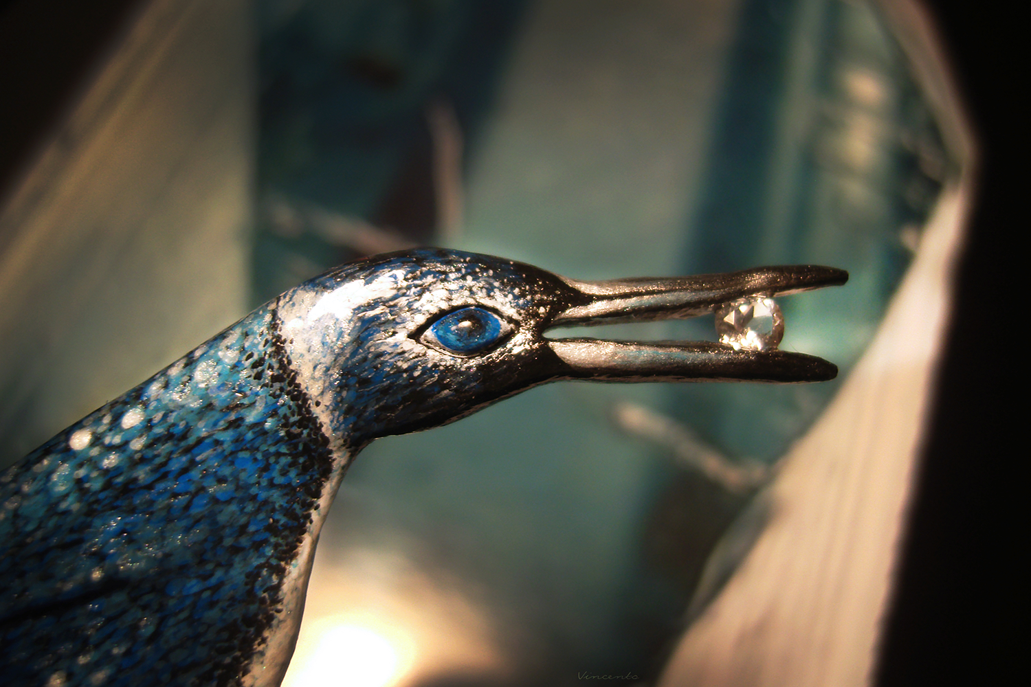- Клюв серебристый, в нём, словно в зеркале, отражается кристально-прозрачный камешек-льдинка морганита.