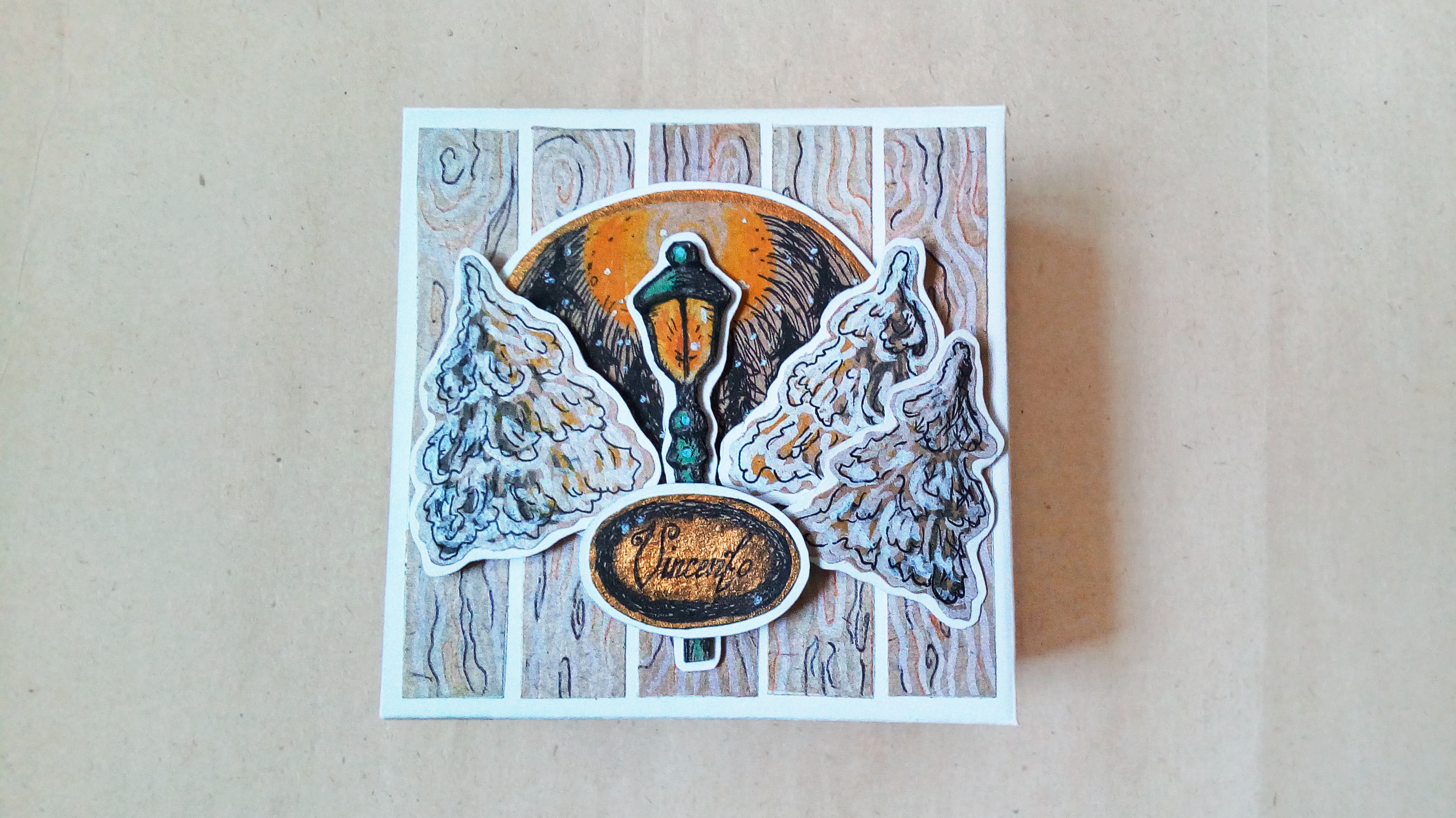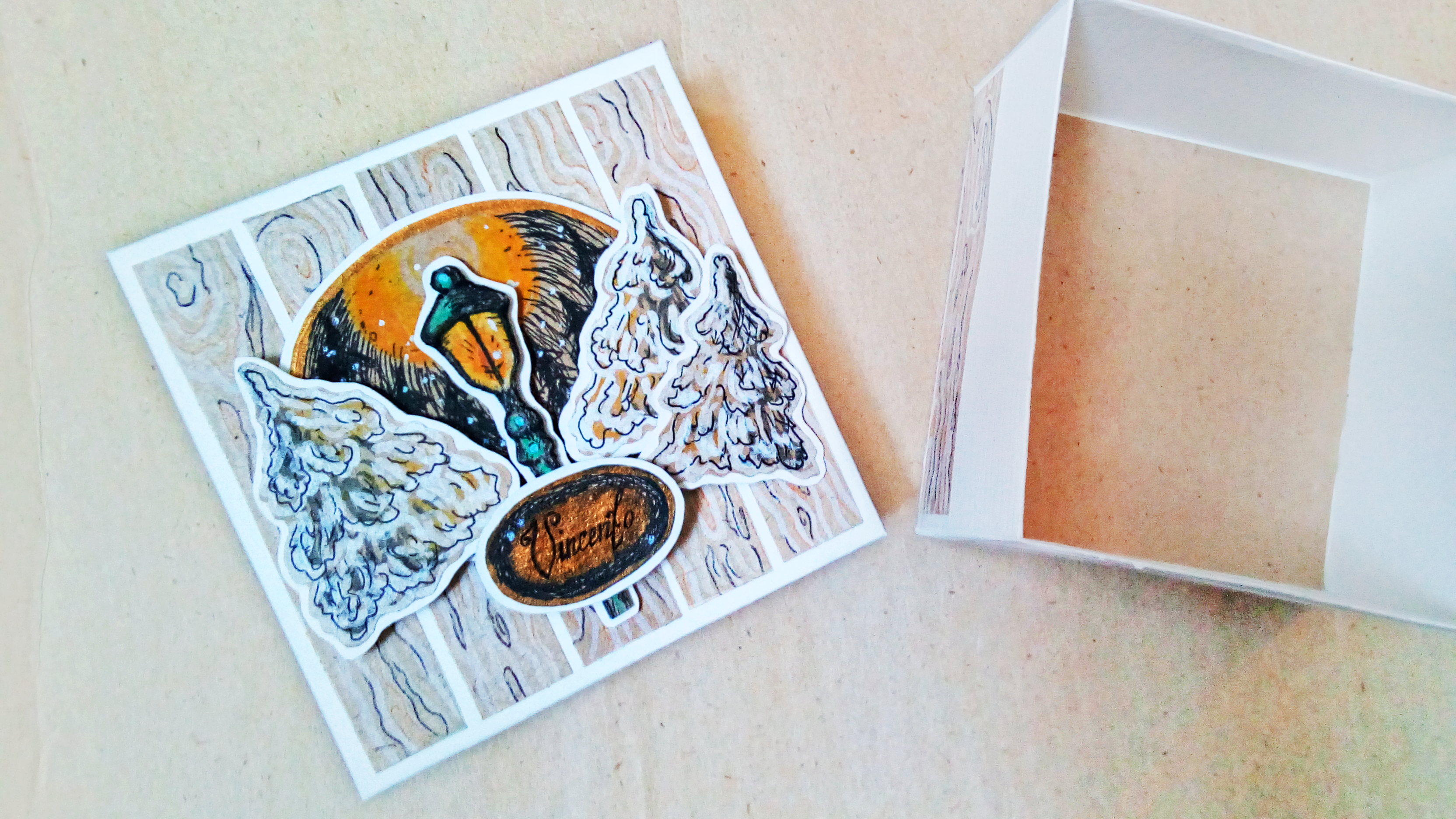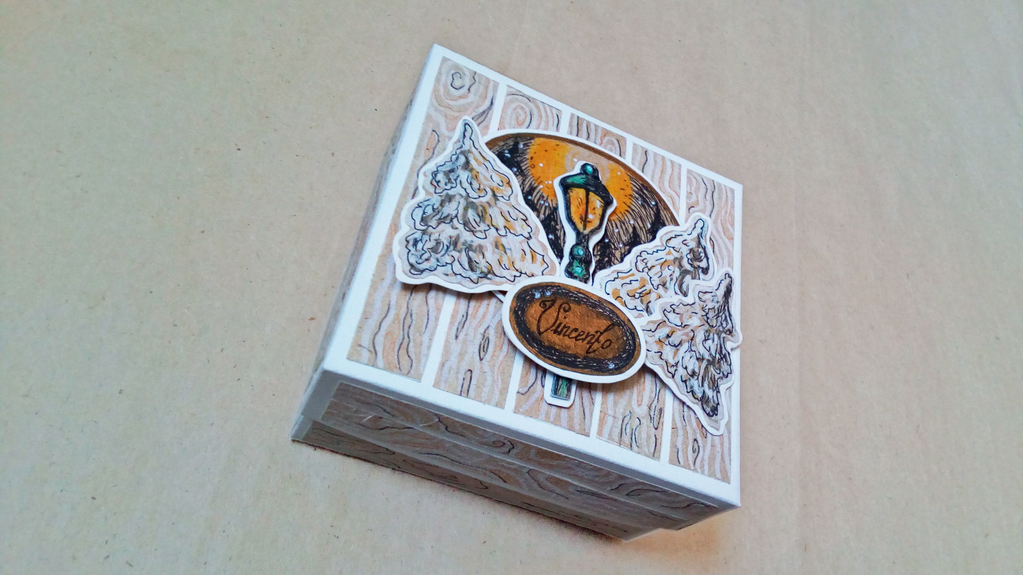 - Основной материал — плотная белая бумага, декорированная цветными принтами и объёмными скрап-элементами ручной работы (авторская роспись цветными лайнерами, пастелью и акварелью).