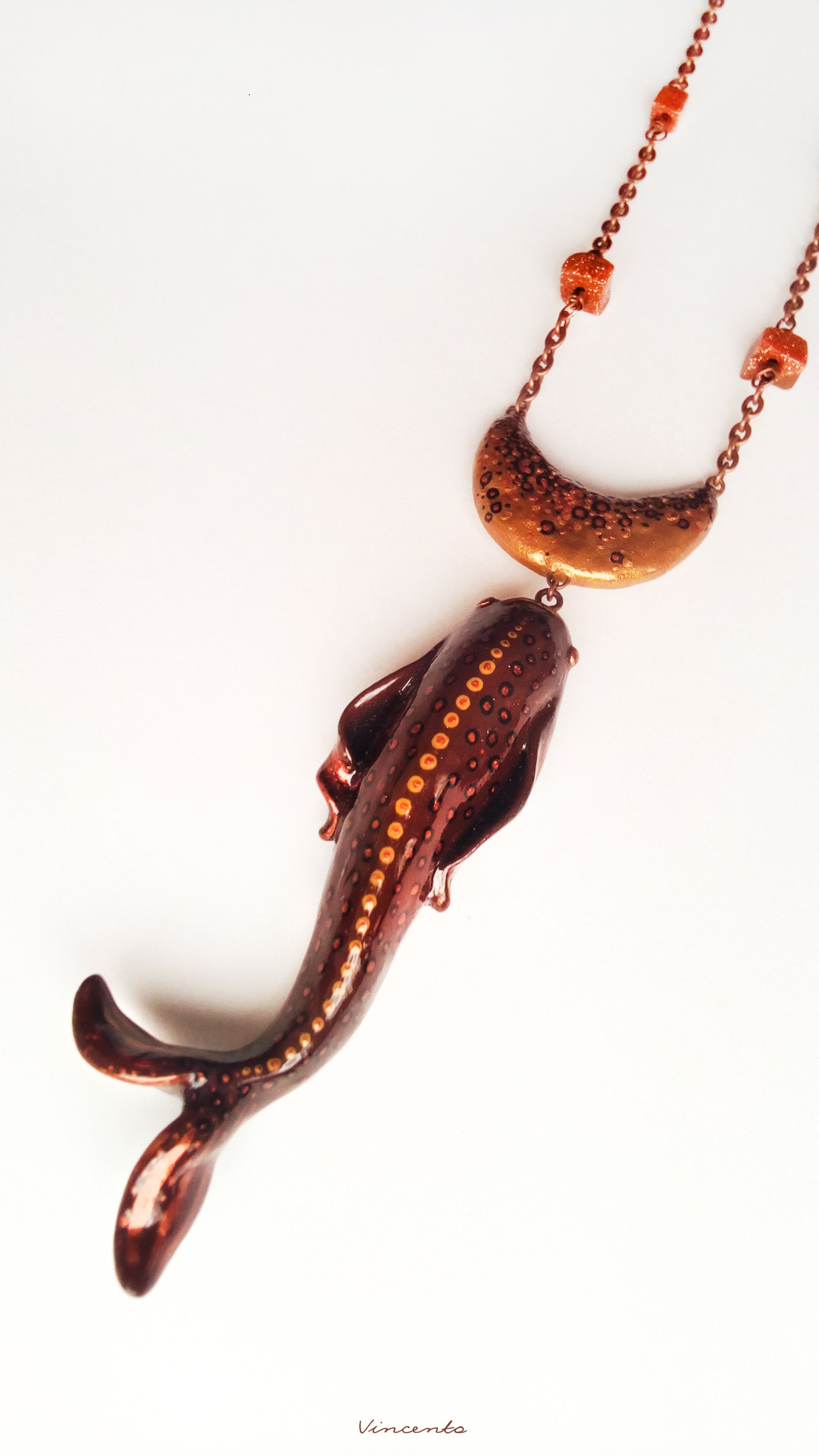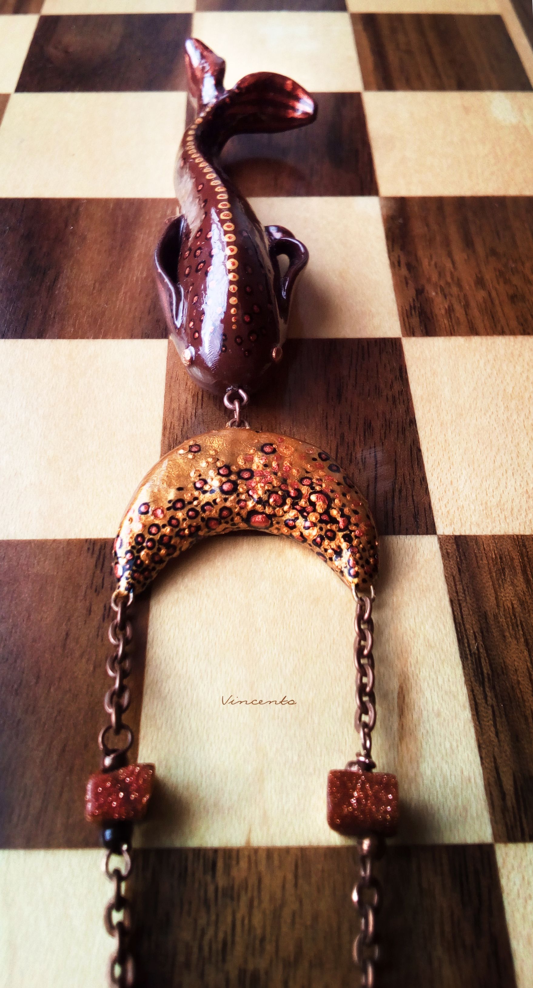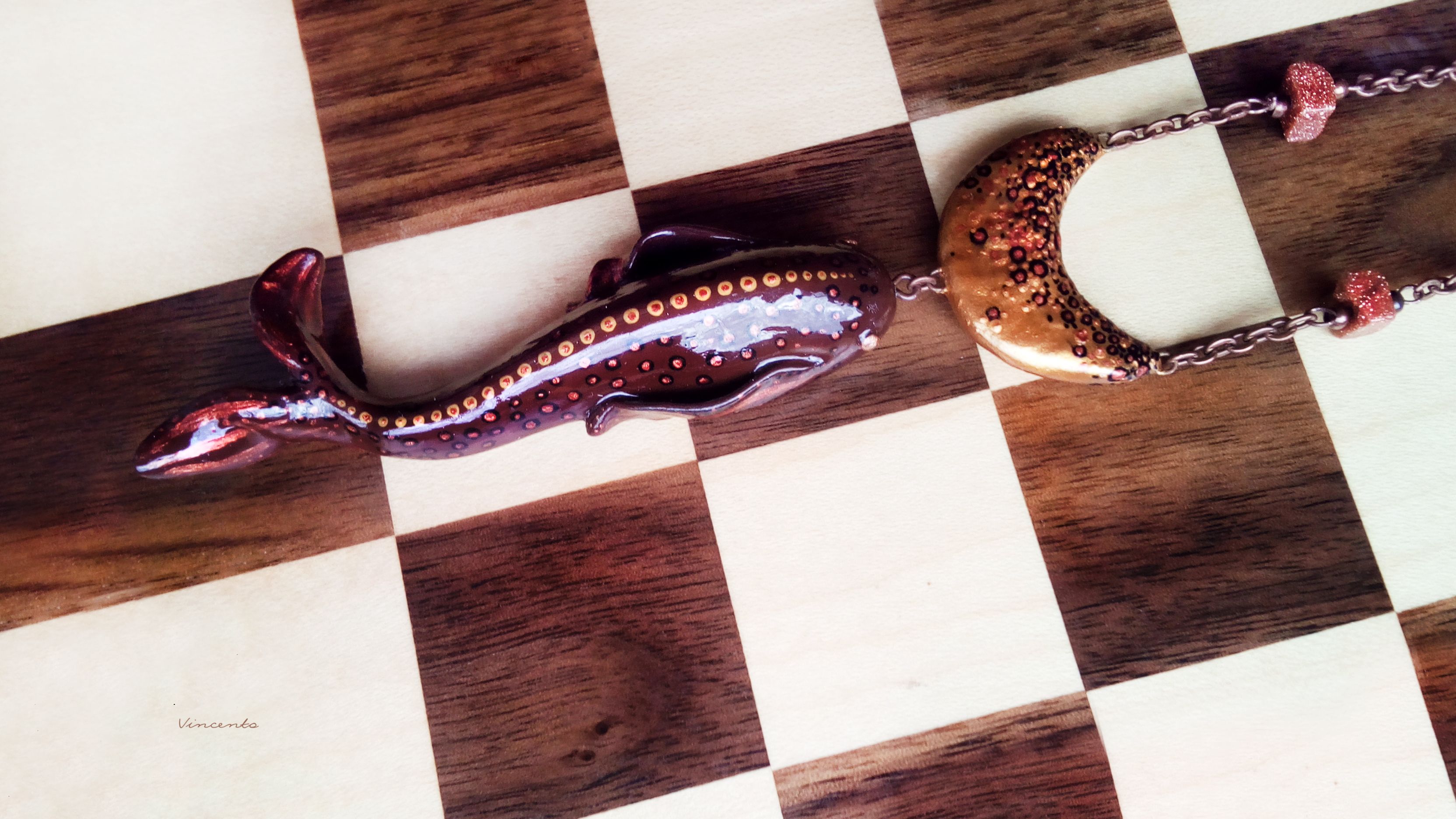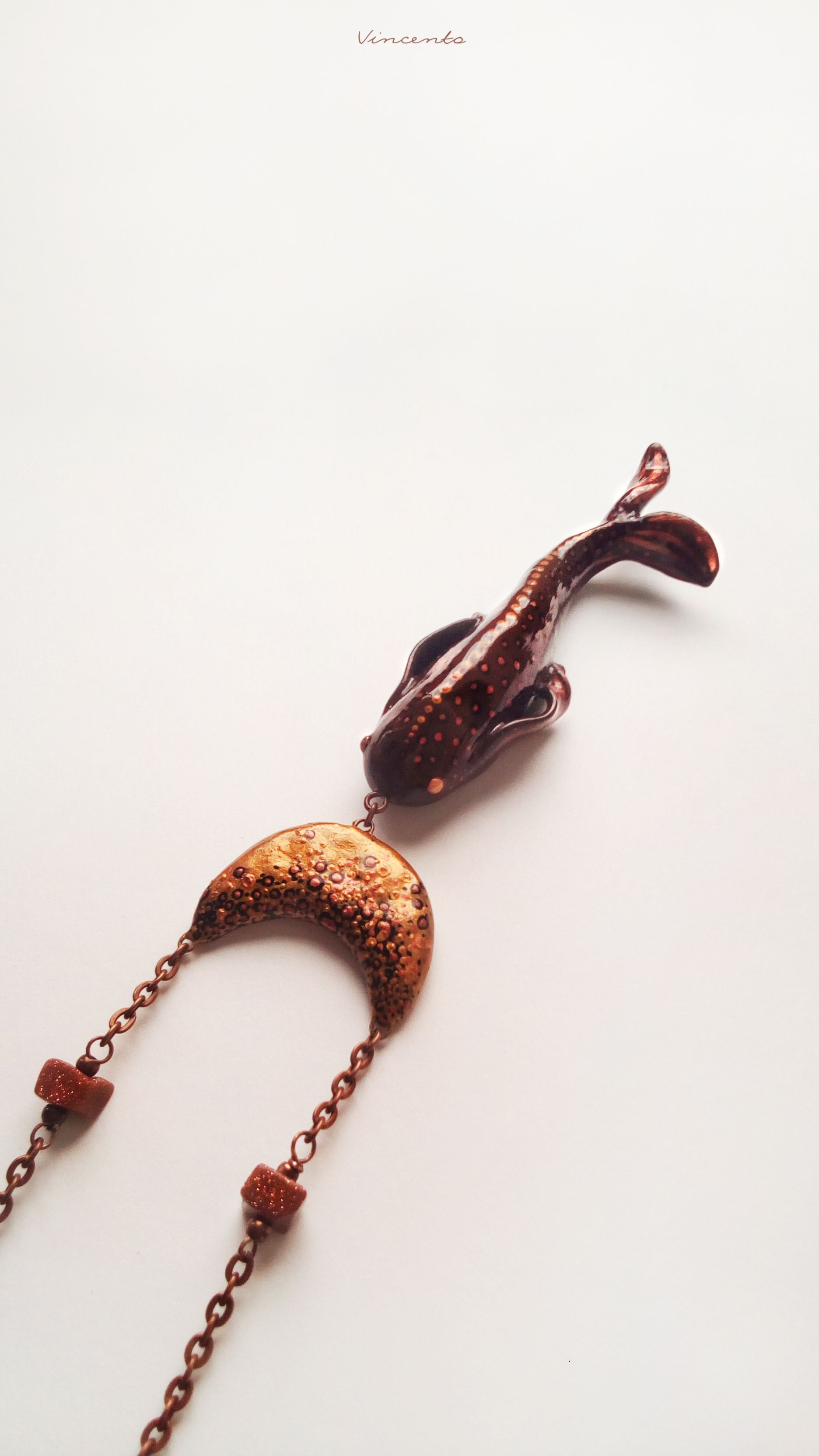 - Необычное украшение в этническом стиле с двумя подвесками: мерцающим месяцем и фэнтезийной рыбкой, — на тоненькой цепочке с миниатюрными кубами натуральных авантюринов.