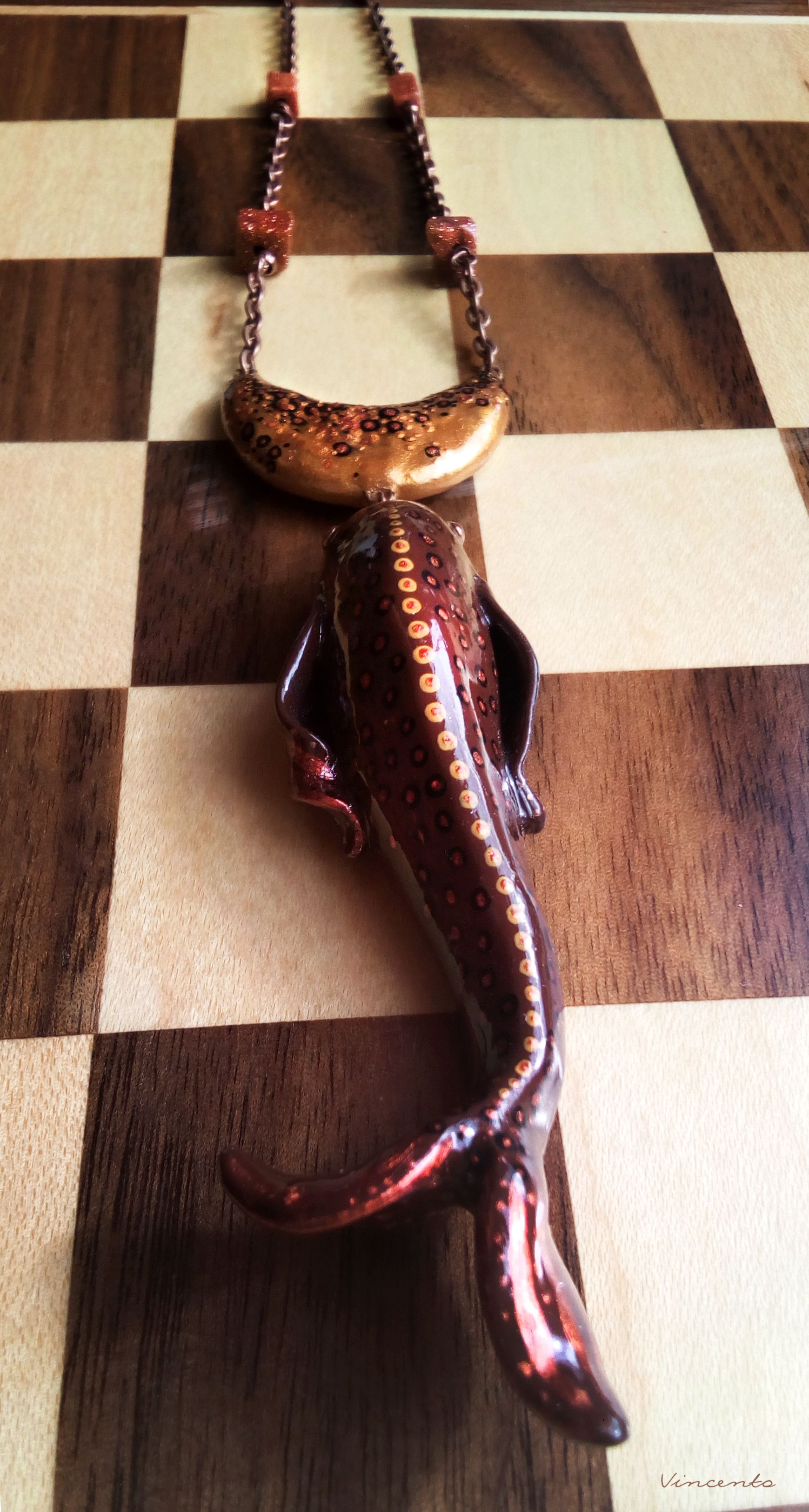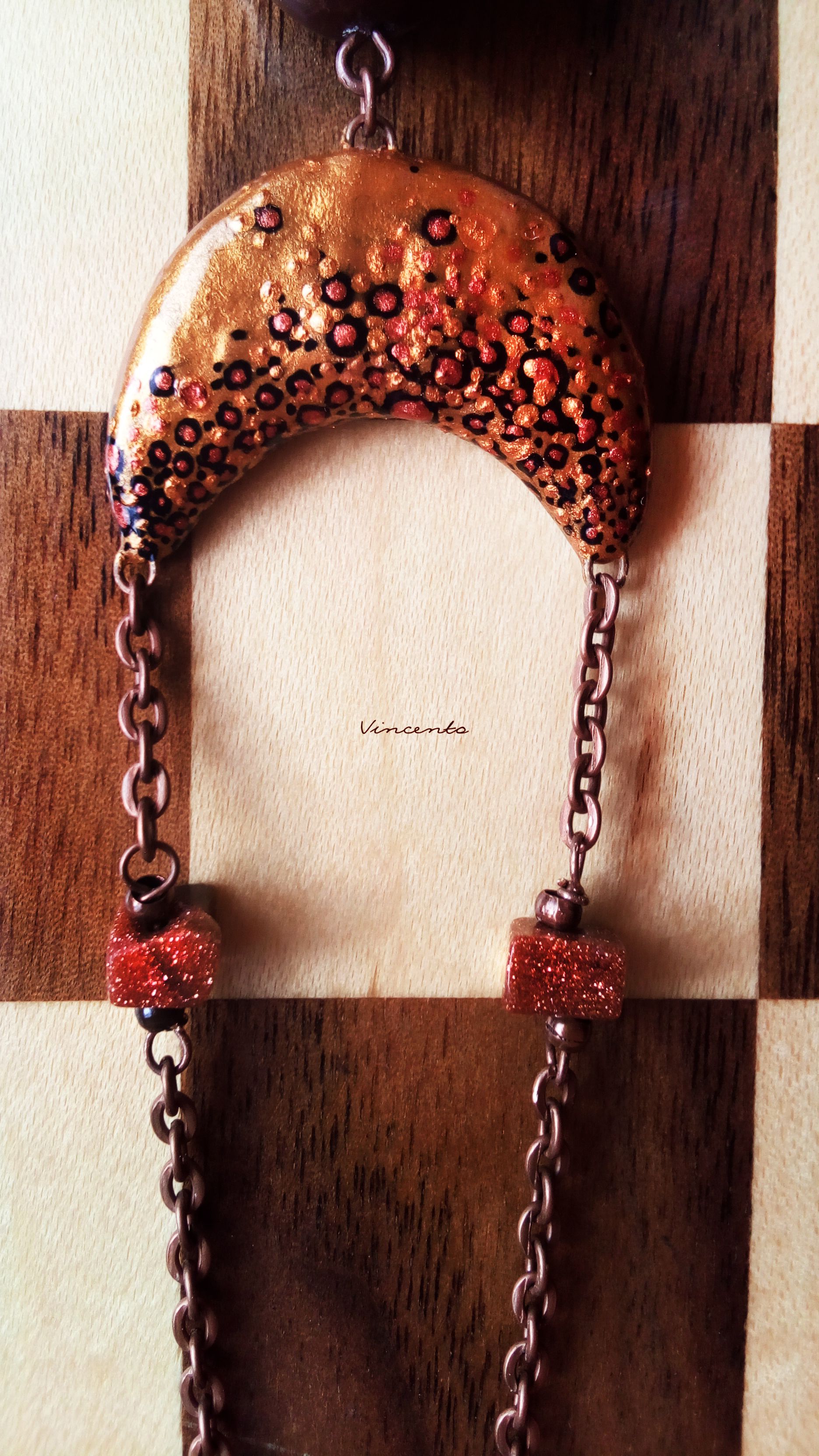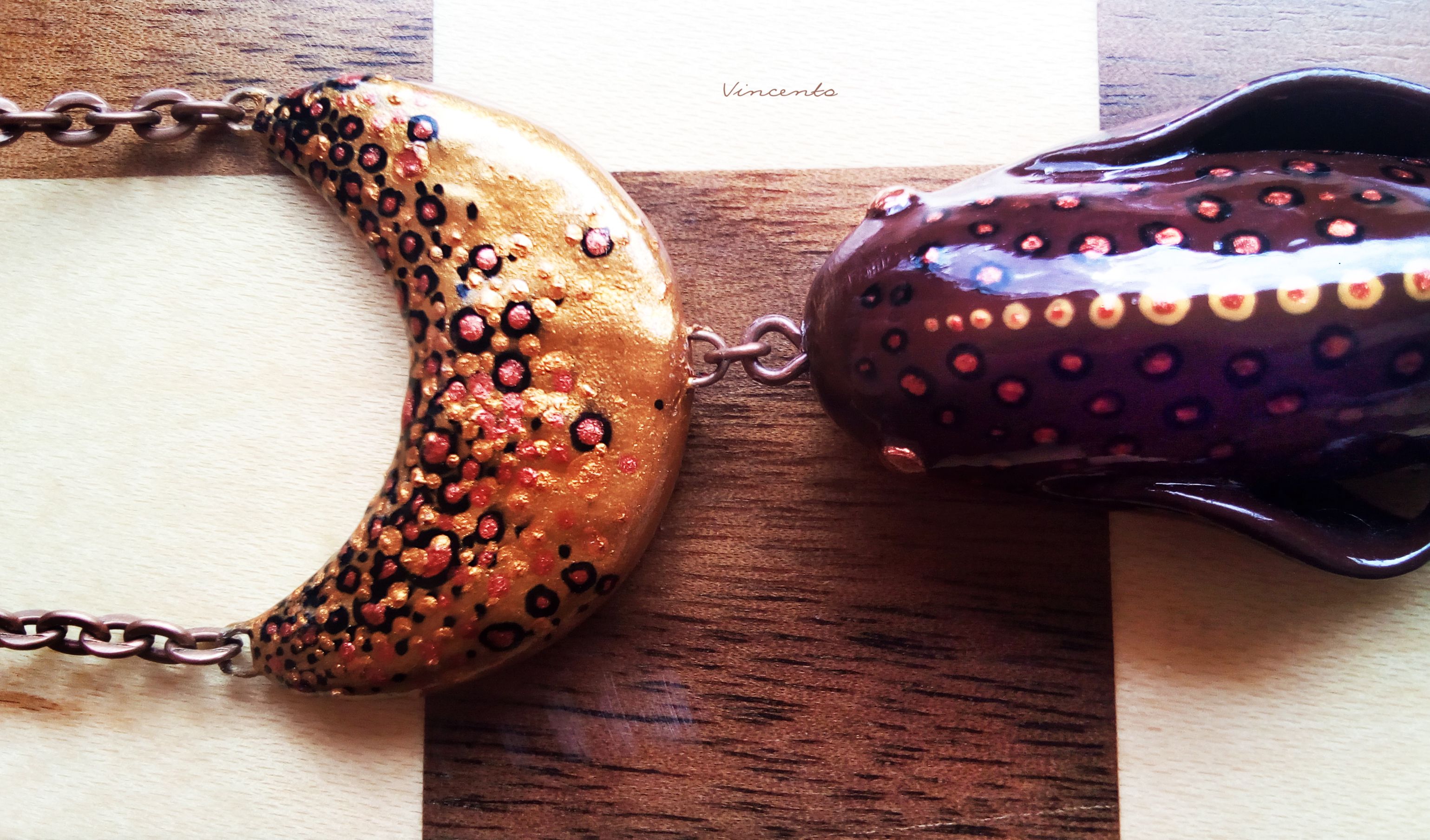 - Материалы: термоглина, акриловые краски, пигменты, лак, стекловидная масса, натуральный авантюрин, металлическая фурнитура.