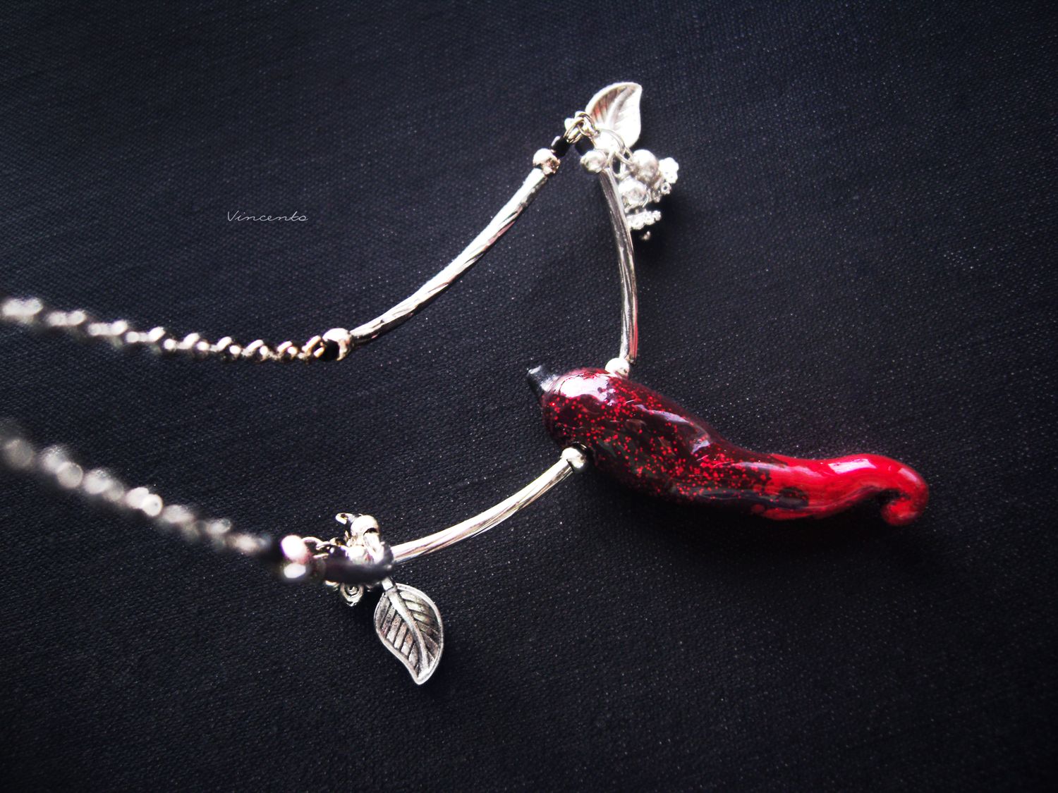- В центре композиции — перчик чили из полимерной глины, гладкий и блестящий, будто принесённый прямиком из того самого легендарного Сада Наваждений...