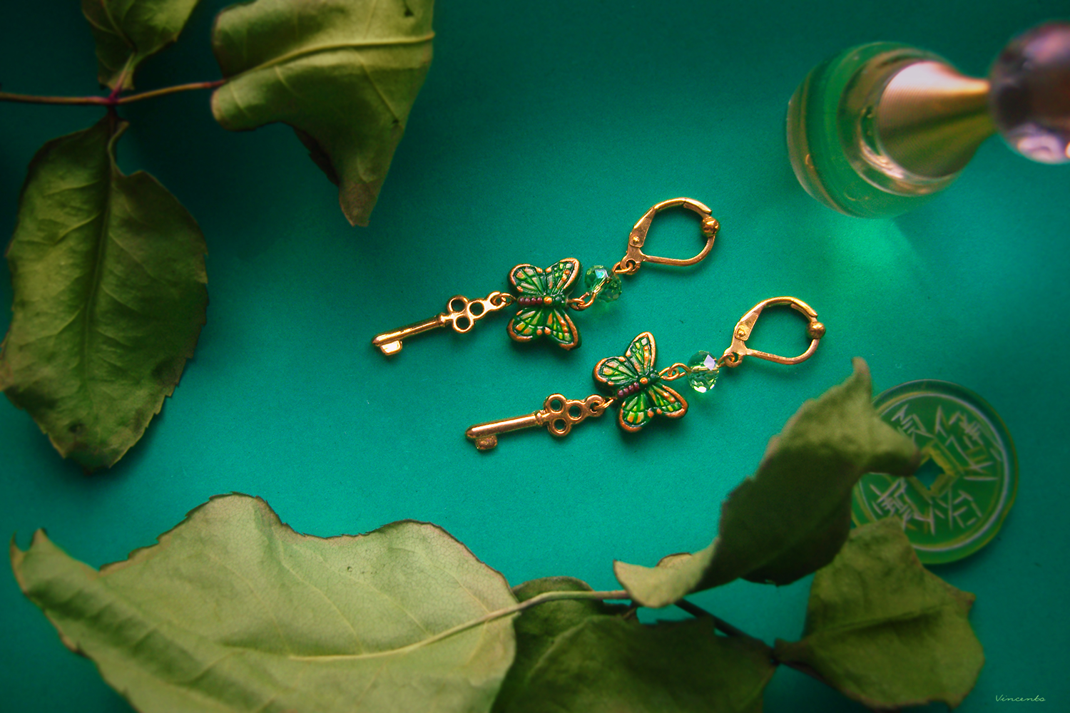 - Реплика популярных серёжек "Сказка о Салаточке". Тоже с яркими золотыми ключиками, гранёными хрусталиками цвета весенней зелени и милыми бабочками, расписанными вручную изумрудными и золотистыми пигментами. И всё же настроение этой пары отличается, ведь волшебные бабочки стали детализированней, мы затемнили оттенки, сделав их насыщеннее и благородней. Теперь они напоминают серьги травяной феи из Полуденного Сада Зелёных Теней.