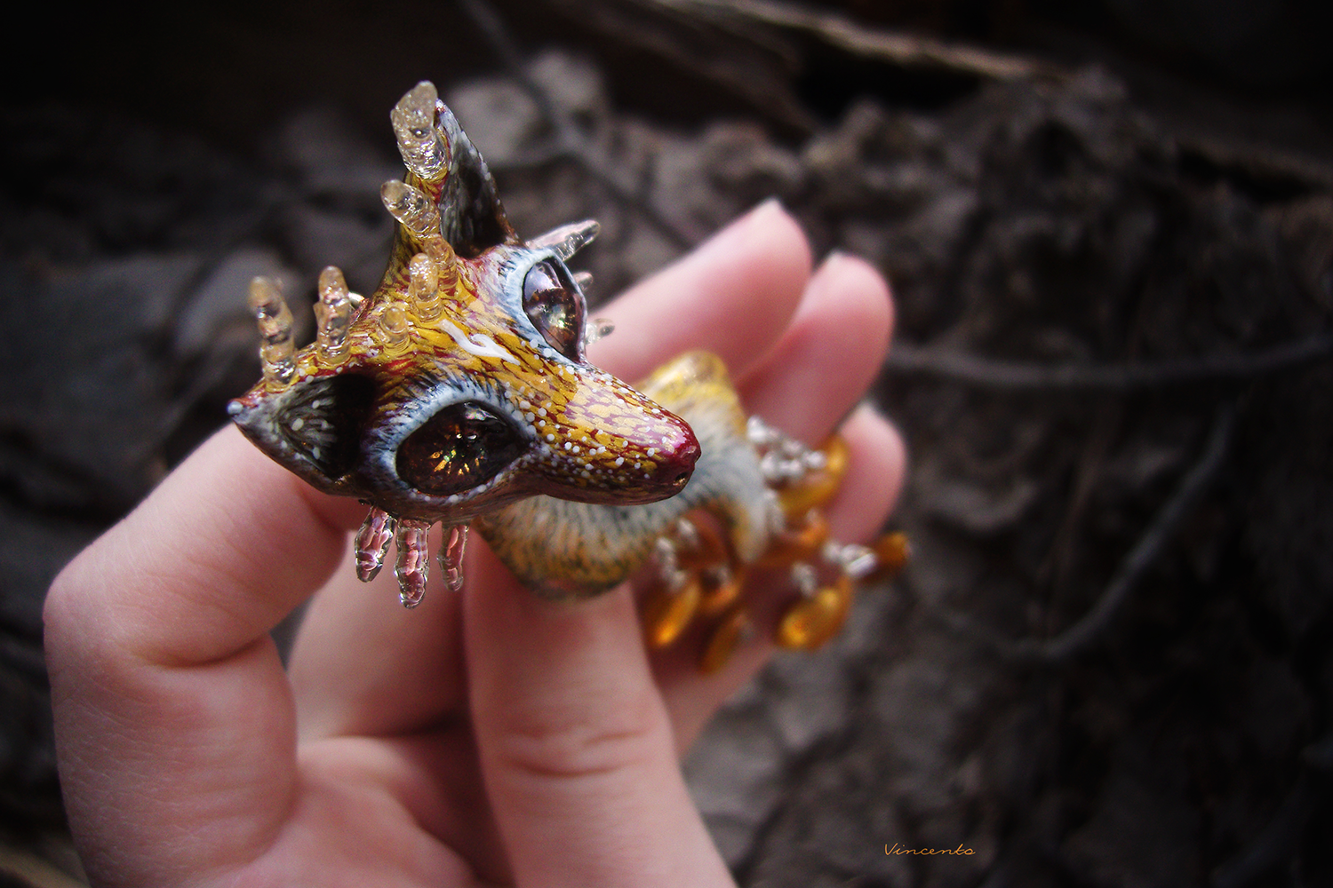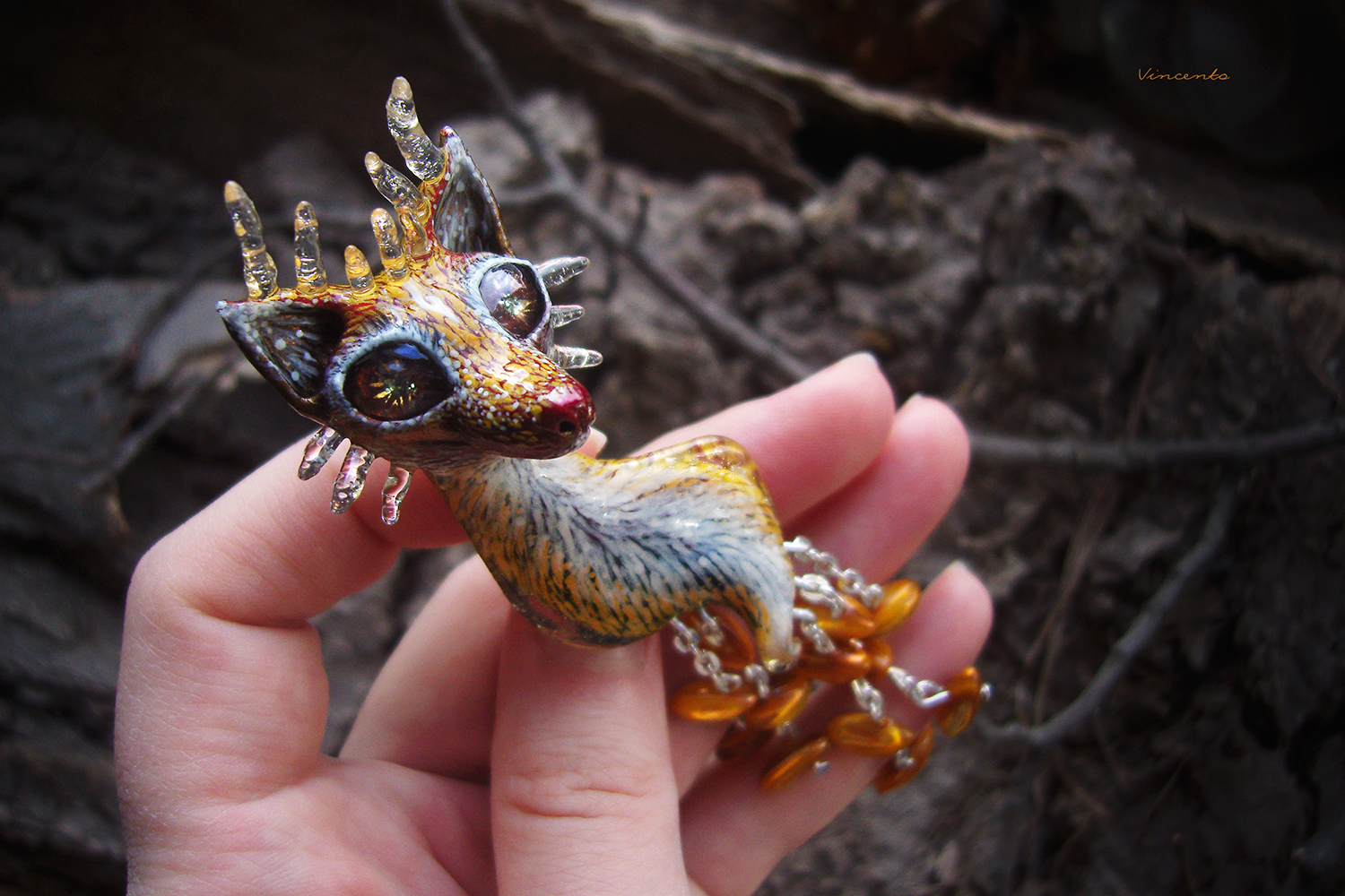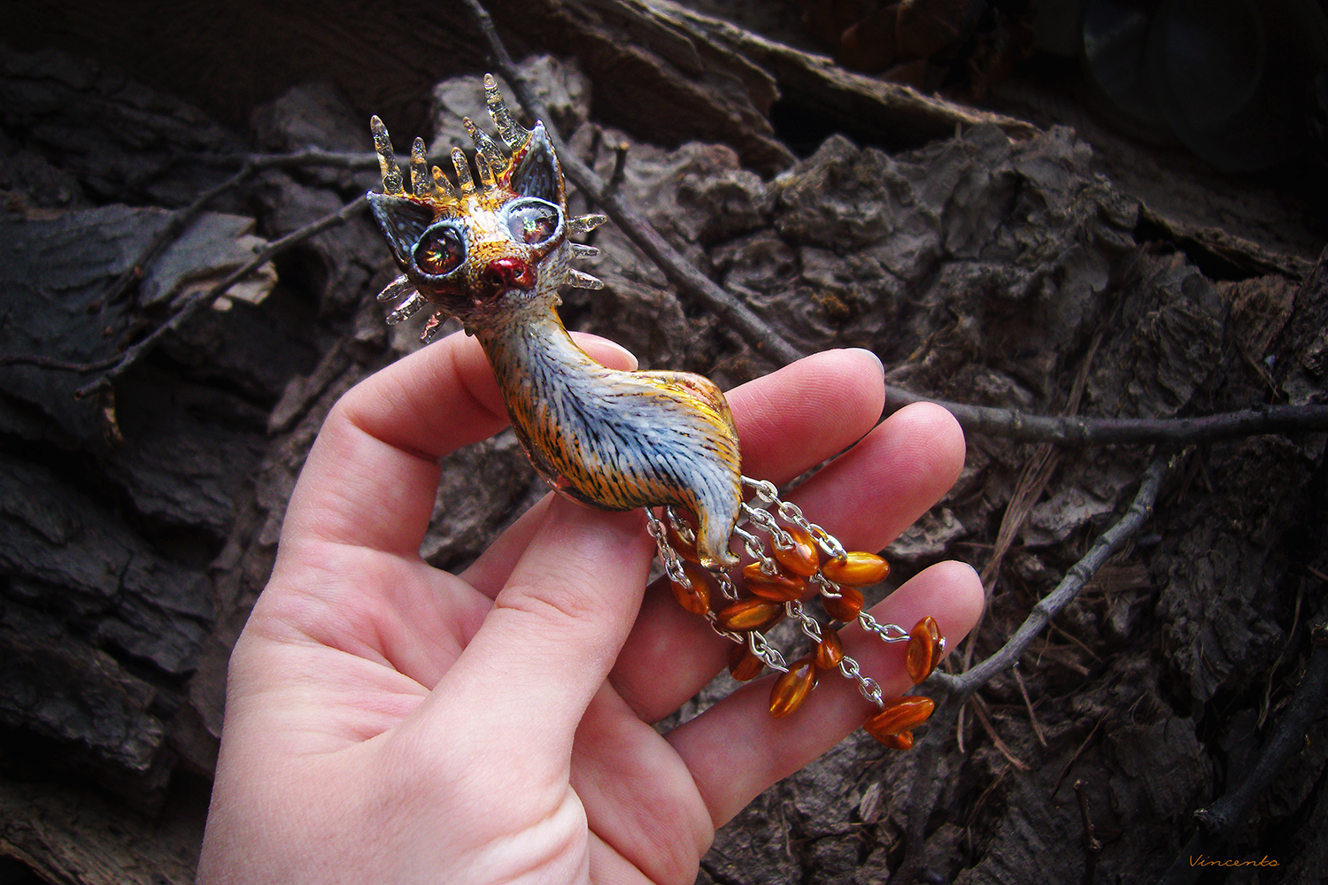 - Материалы: термоглина, паперклей, пигменты, акриловые краски, акриловые кристаллы, глиттер, лаки, стекловидная масса, металлическая фурнитура, натуральный перламутр.