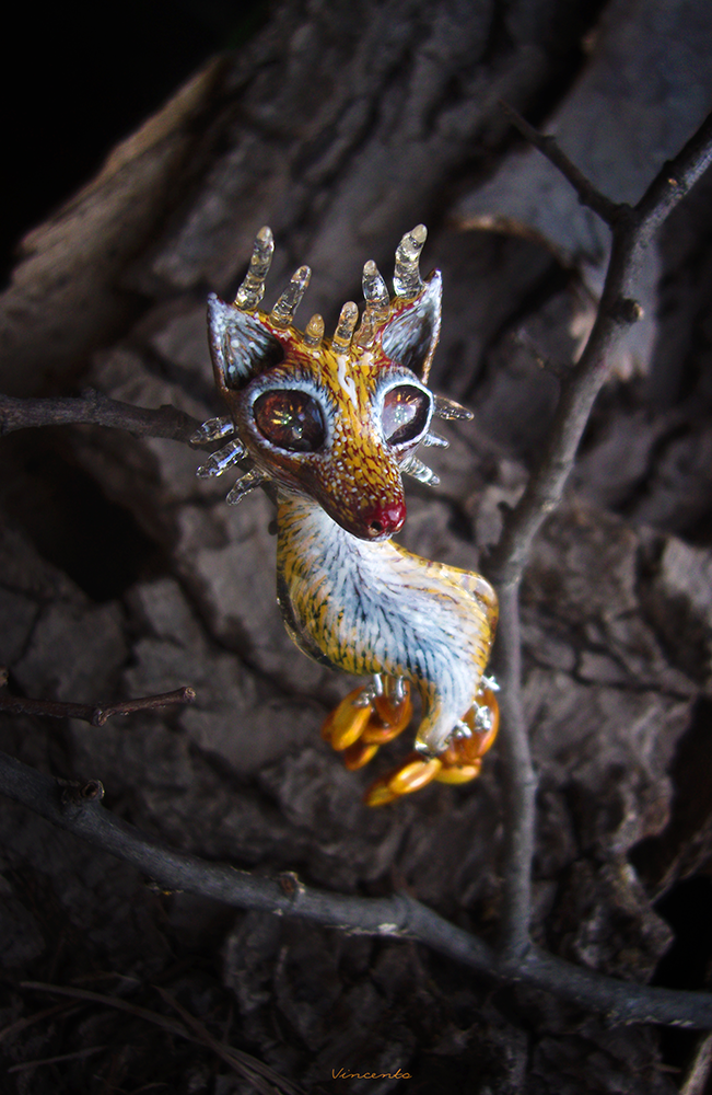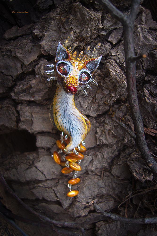 - Яркая, утончённая брошь в стиле восточного фэнтези в виде мифологического персонажа — огненной лесной лисицы с пятью хвостами.