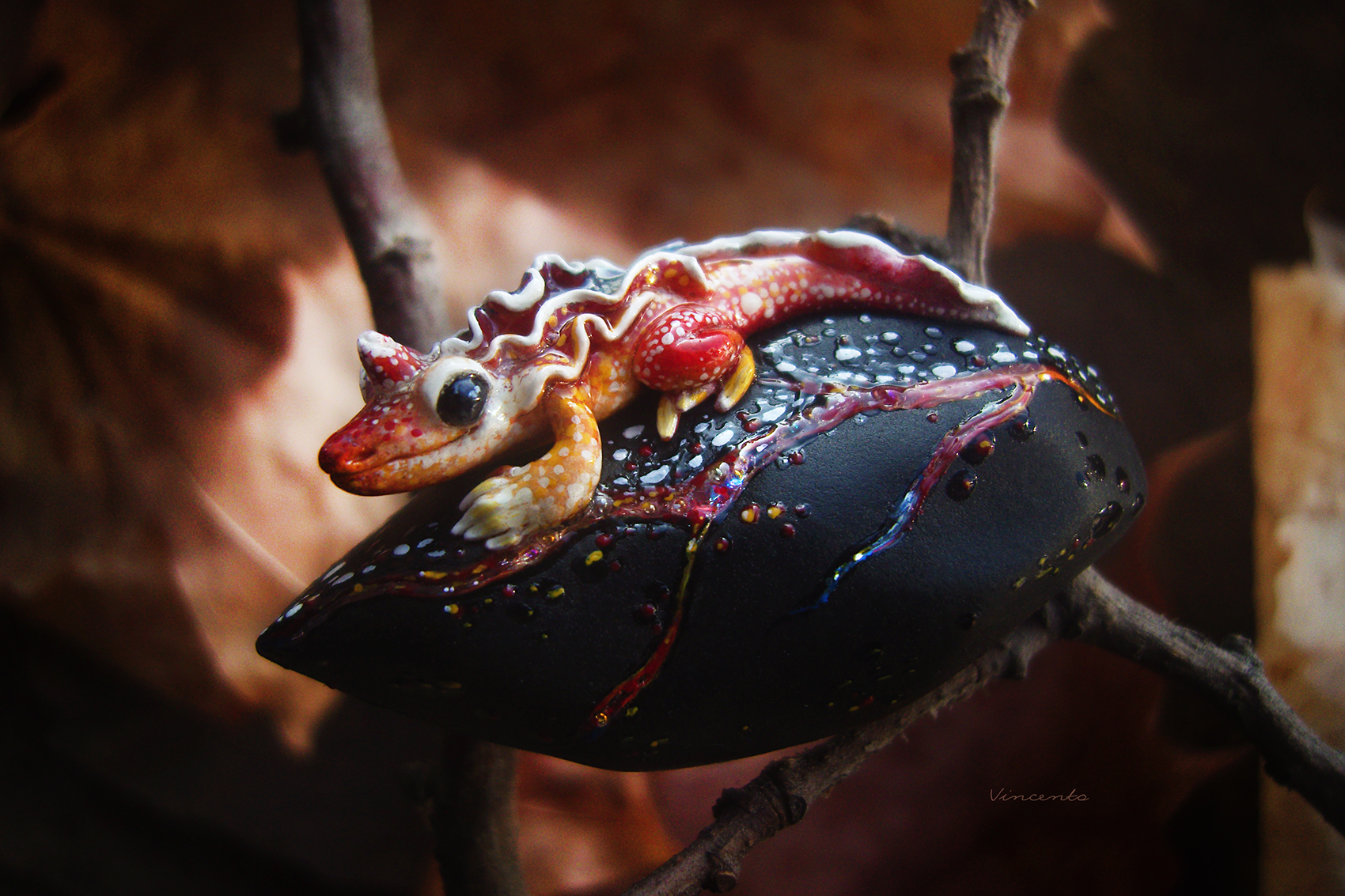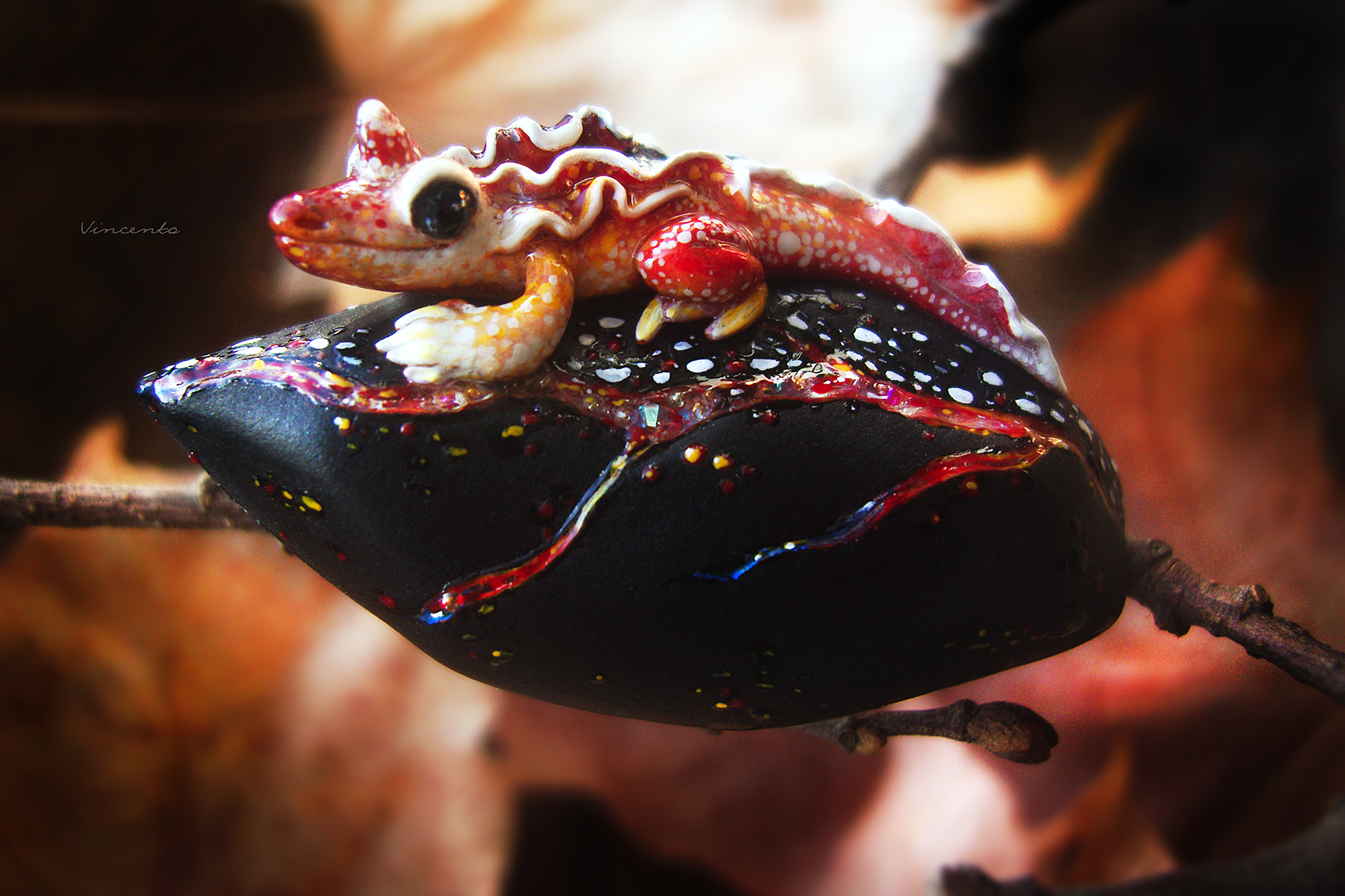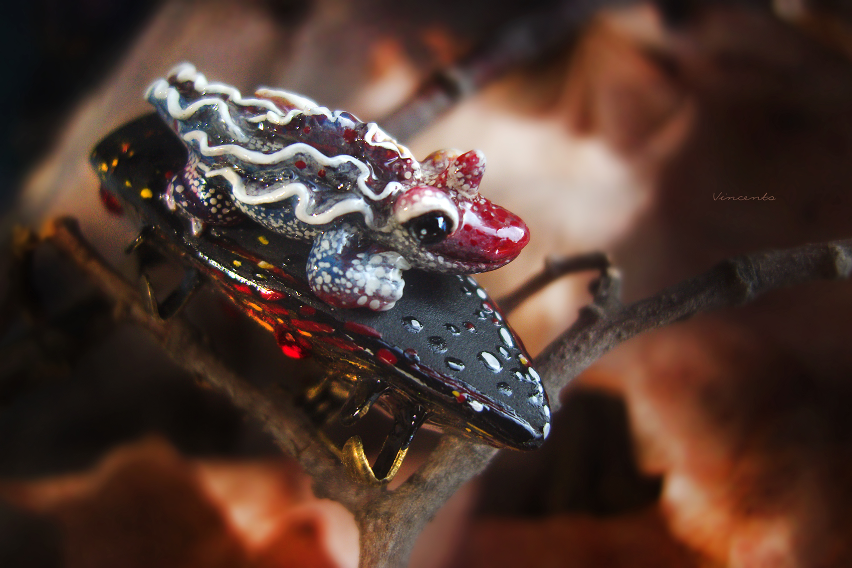 - Фэнтезийная брошечка в виде огненной саламандры на тлеющем угольке, напоминающем кристаллический лепесток, рассечённый прожилками раскалённой лавы.