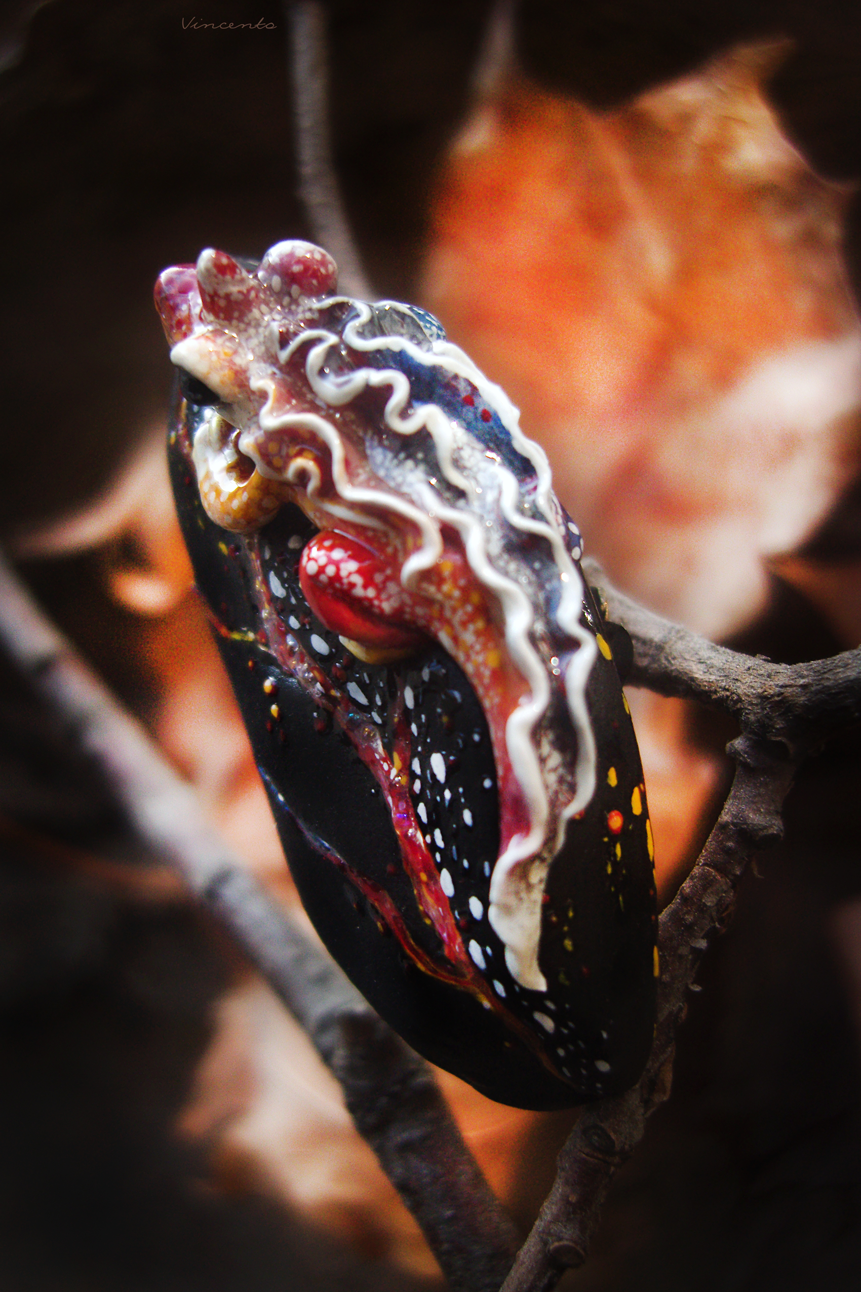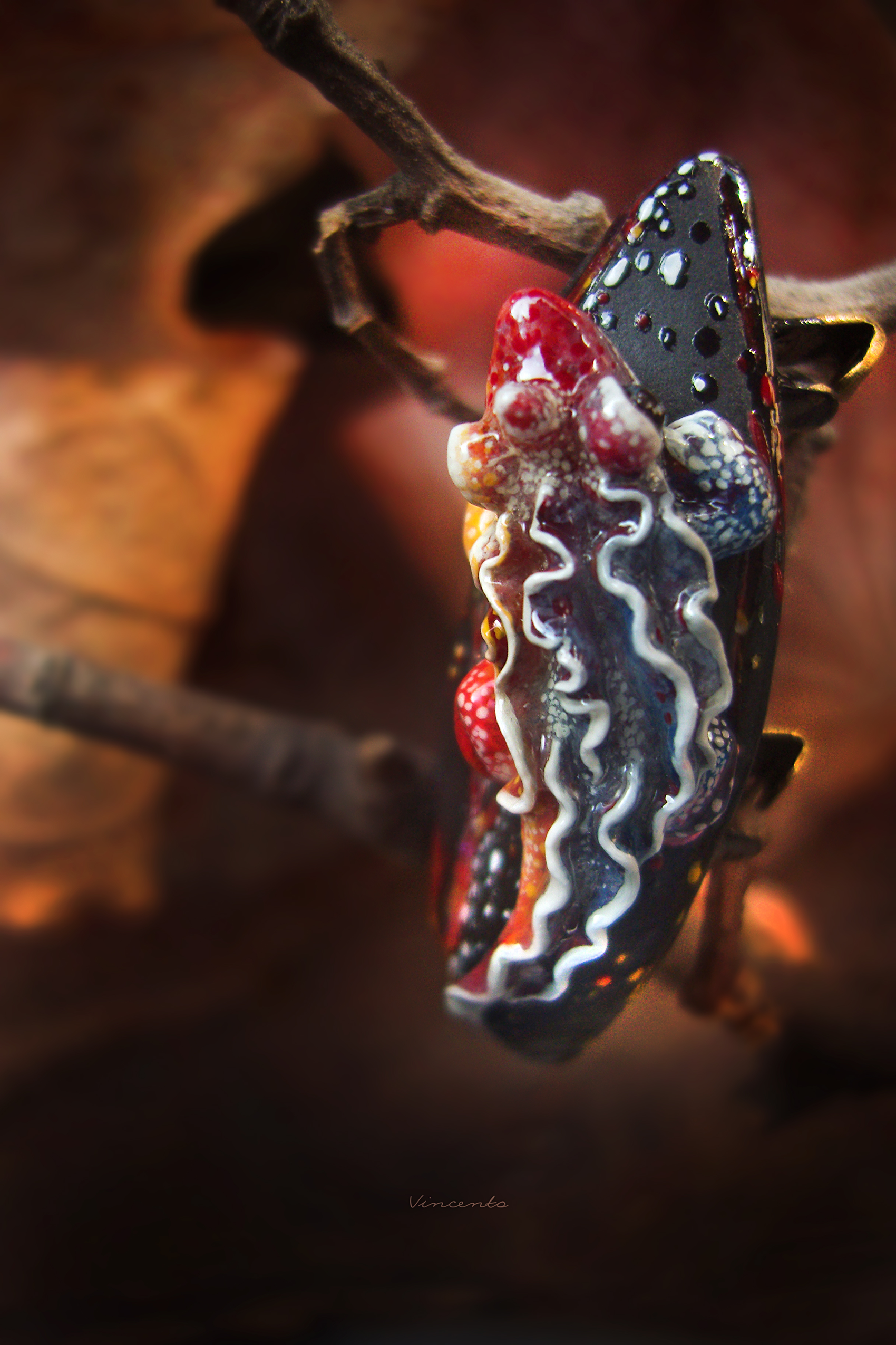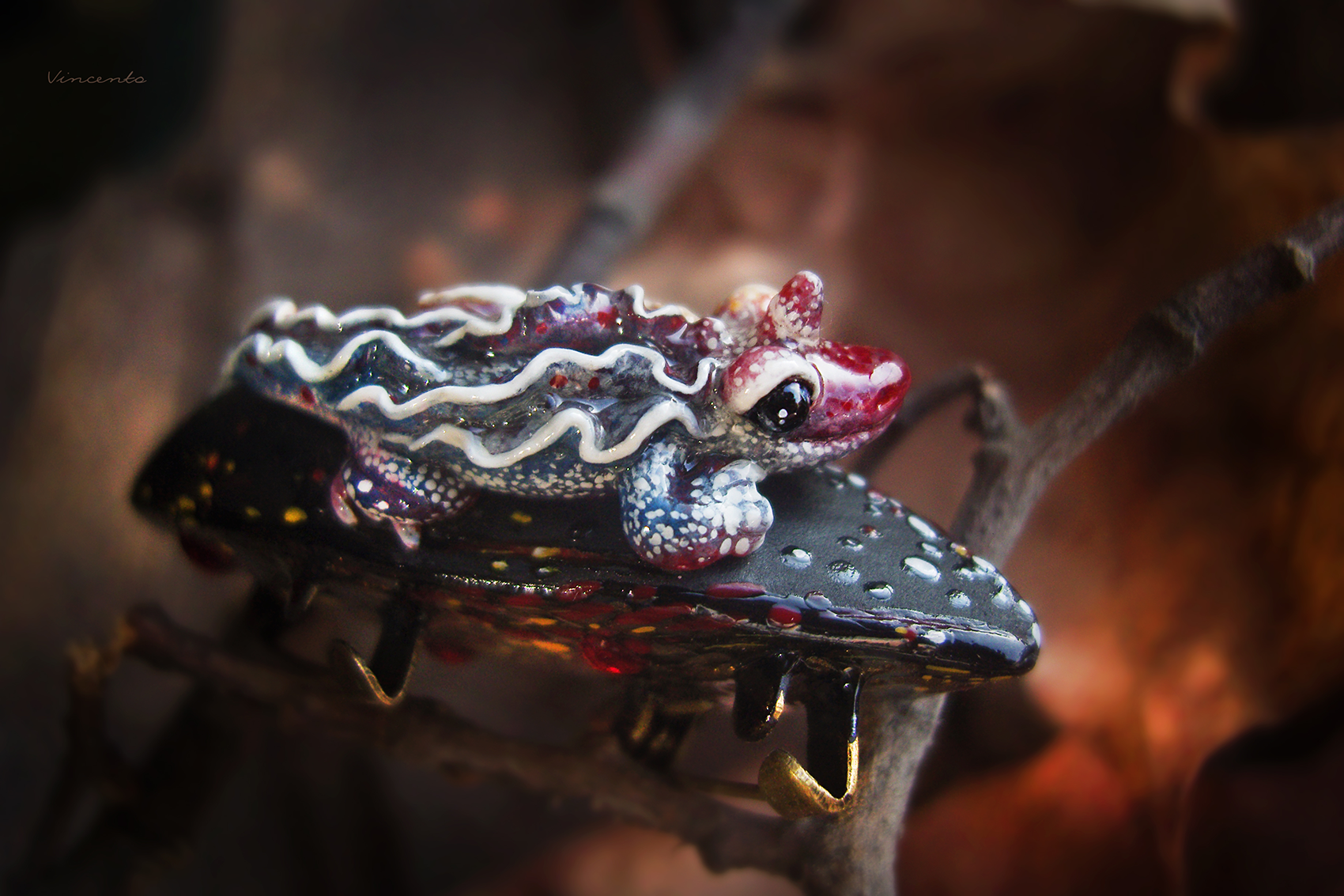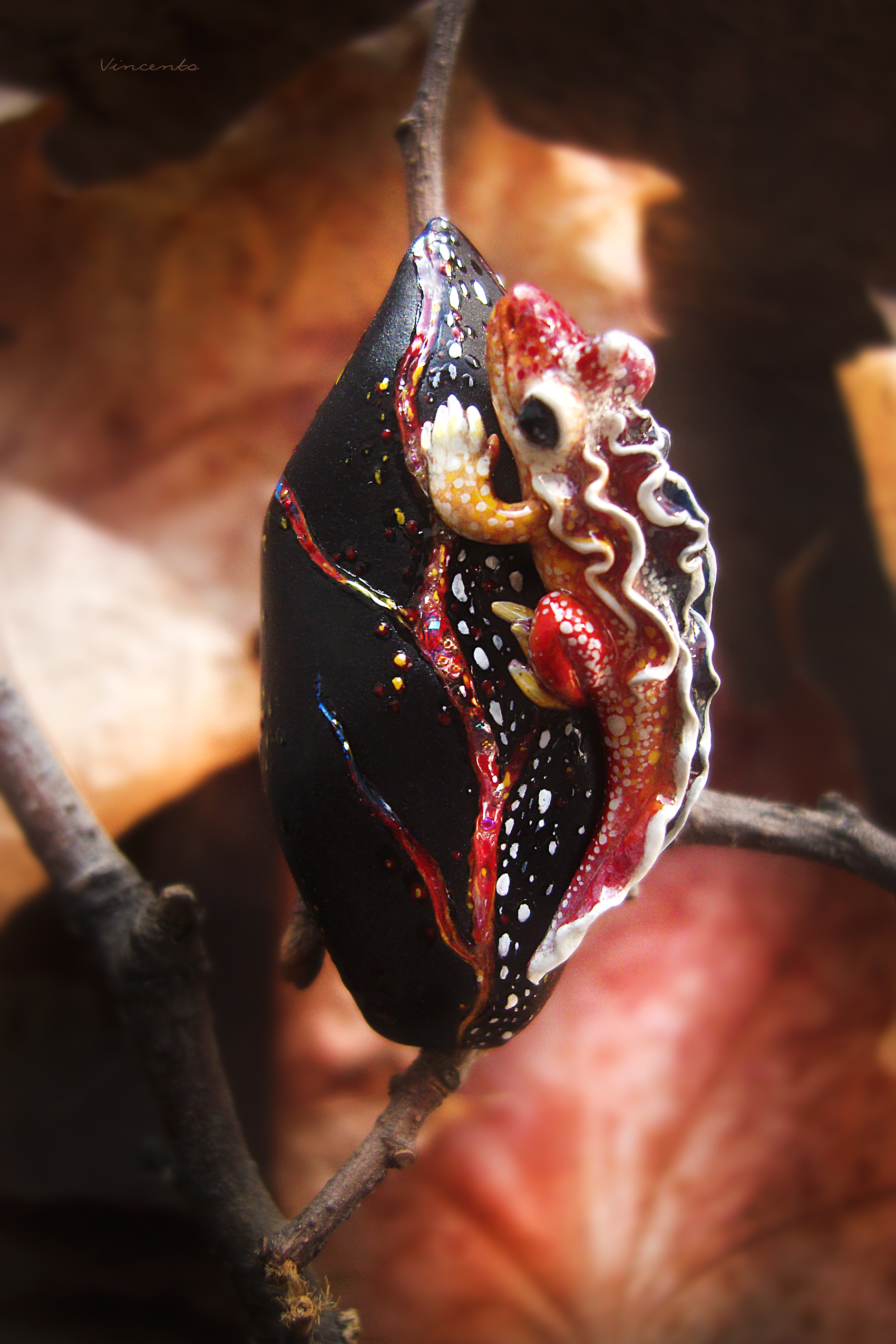 - Фэнтезийная брошечка в виде огненной саламандры на тлеющем угольке, напоминающем кристаллический лепесток, рассечённый прожилками раскалённой лавы.