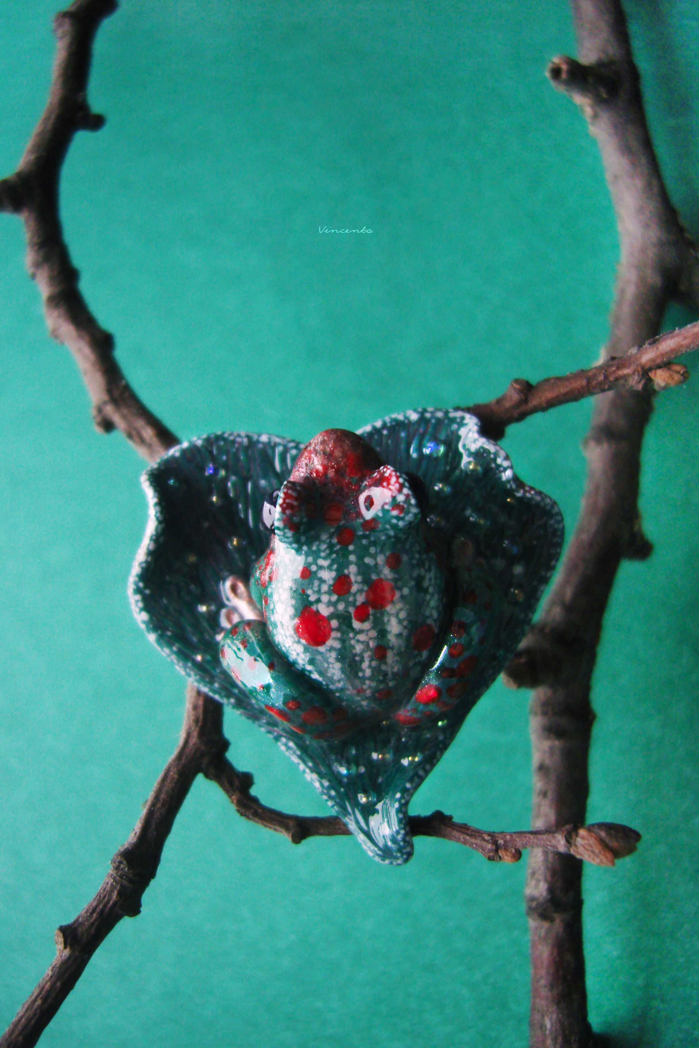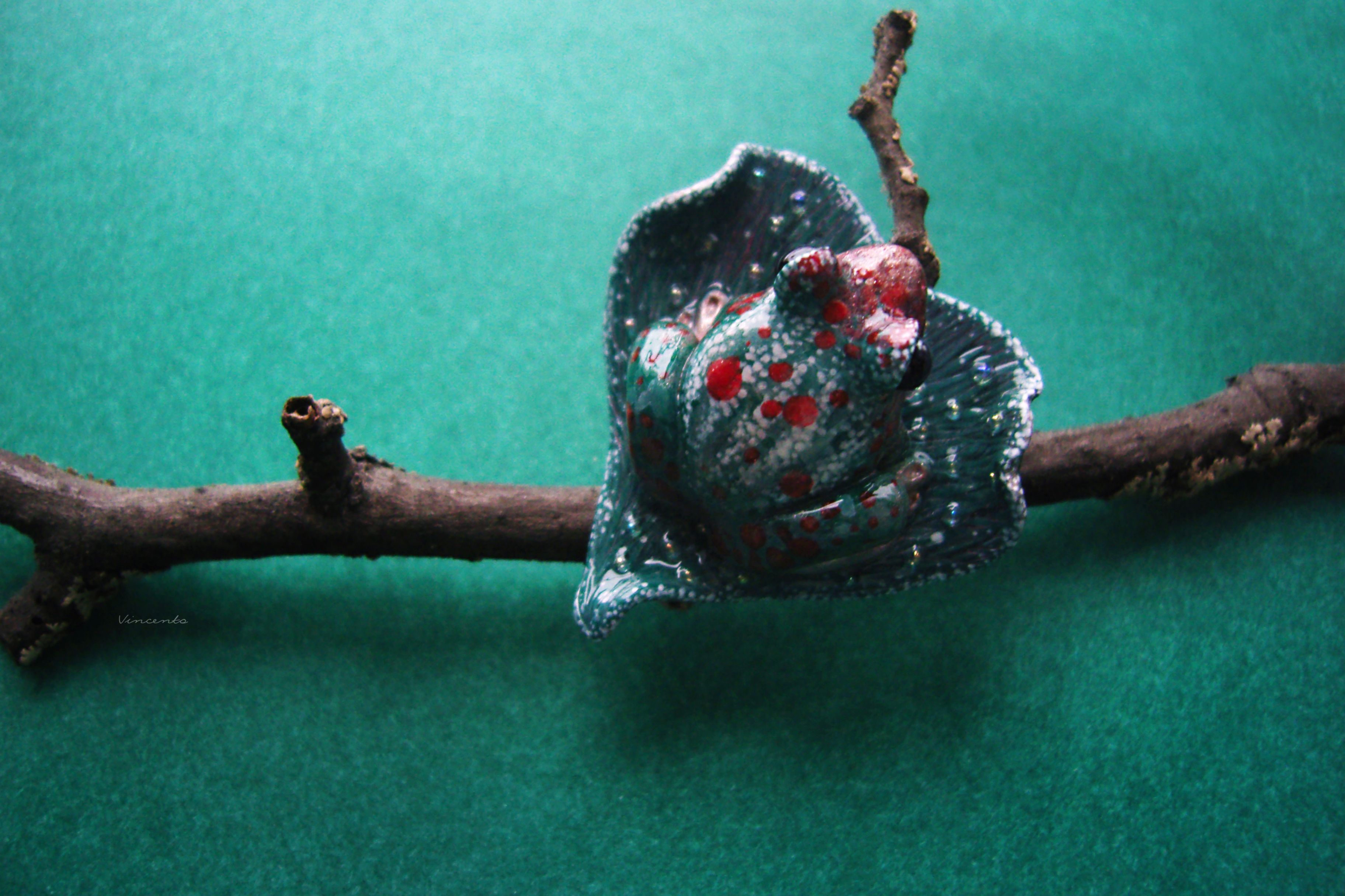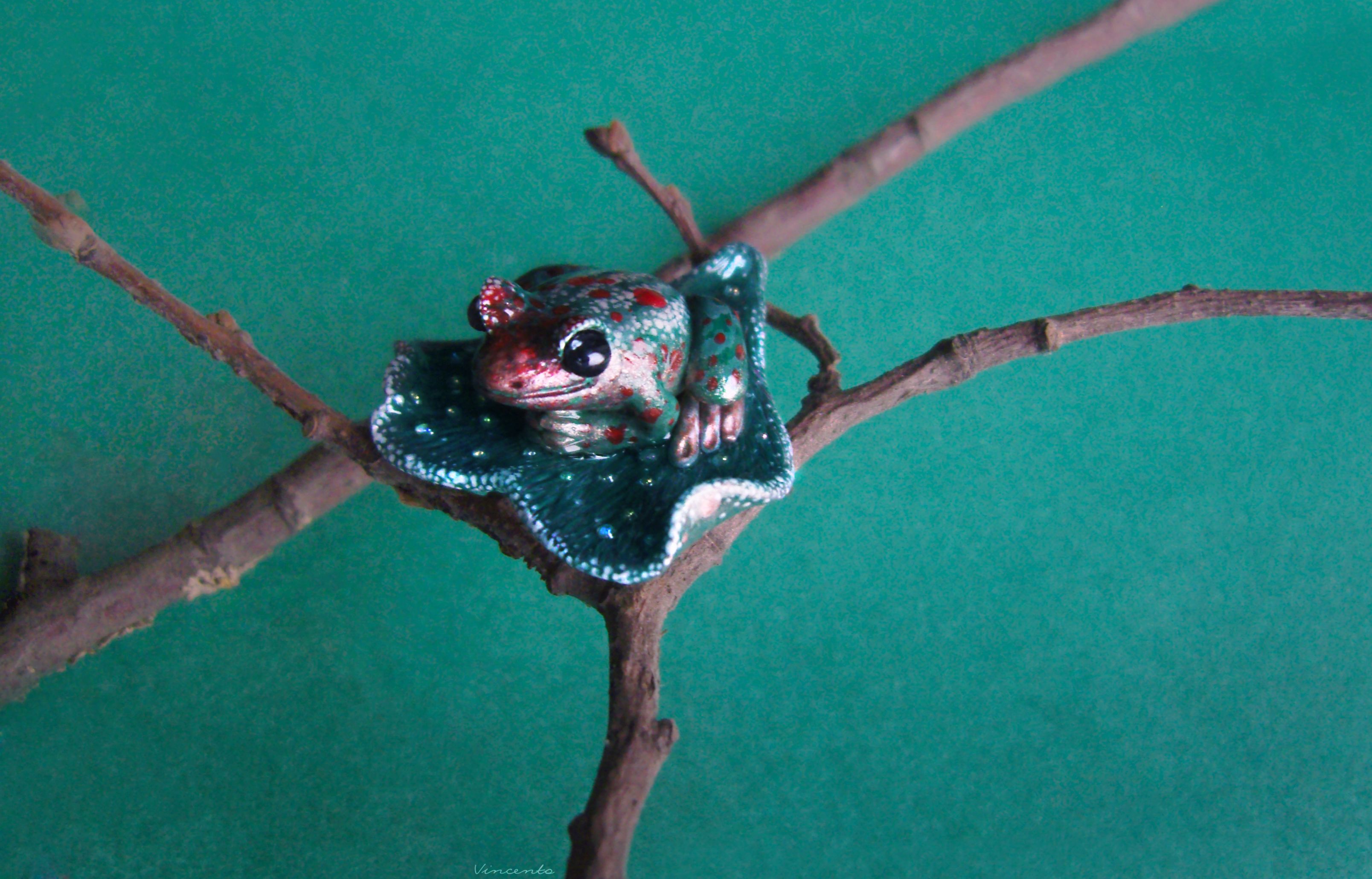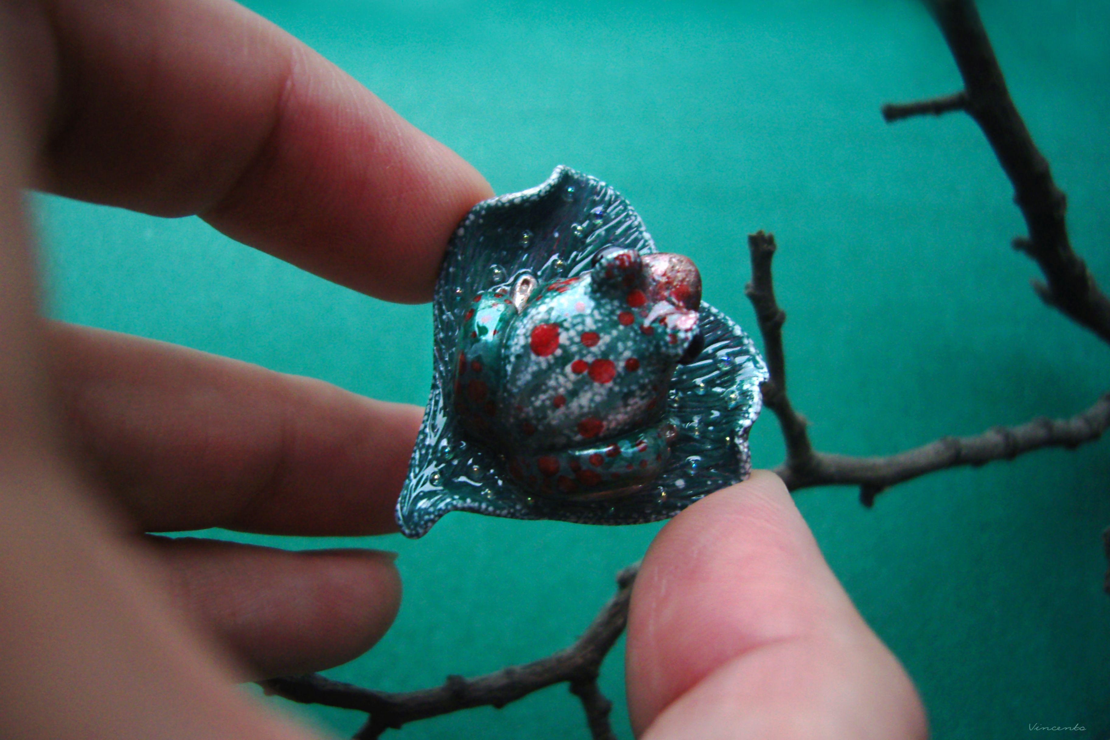 - Красивая, романтичная брошь с миниатюрной лягушкой на листе в форме изумрудного сердца с мерцающими шариками-крупицами, напоминающими пыльцу фей.
