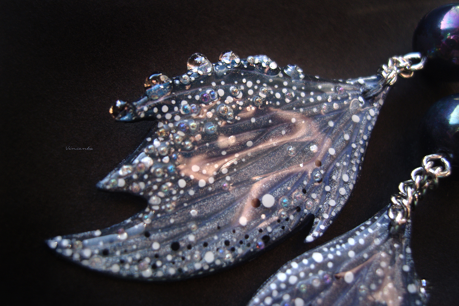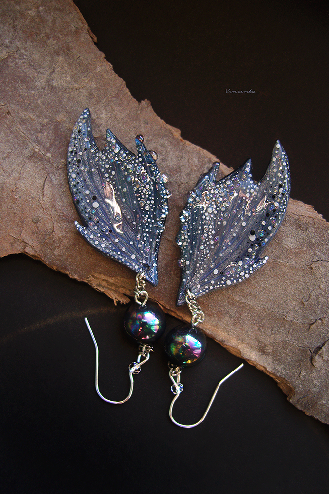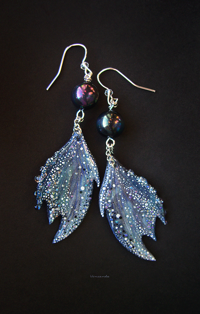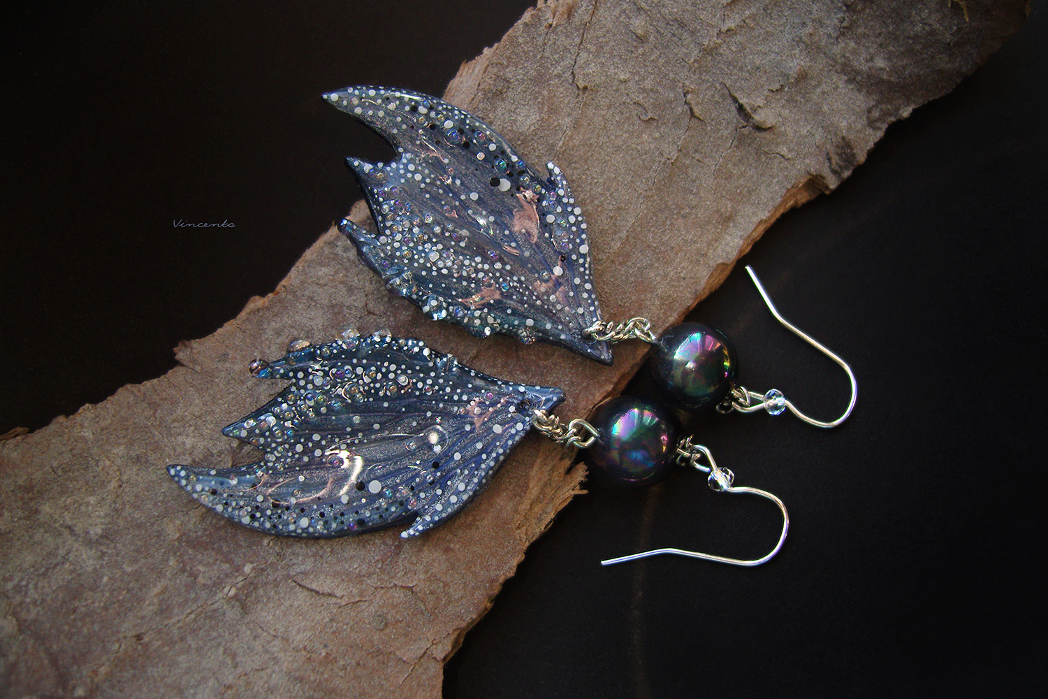Длинные серьги-крылышки "Фея Исчезающих Сумерек" с чёрным жемчугом