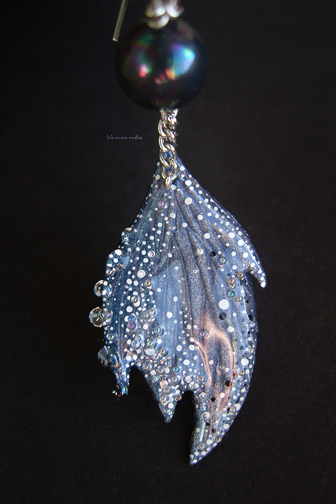 - Бусины жемчуга (10 мм) гармонируют с цветом крылышек, они тоже пепельно-синие, ближе к тёмно-серому с цветными отливами перламутра.