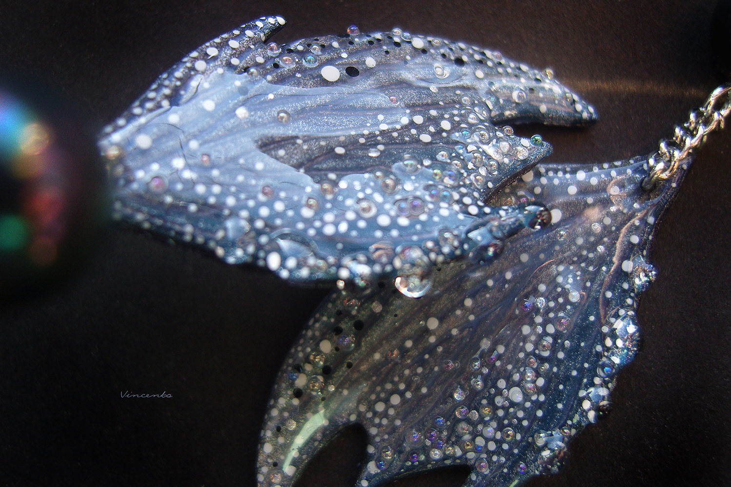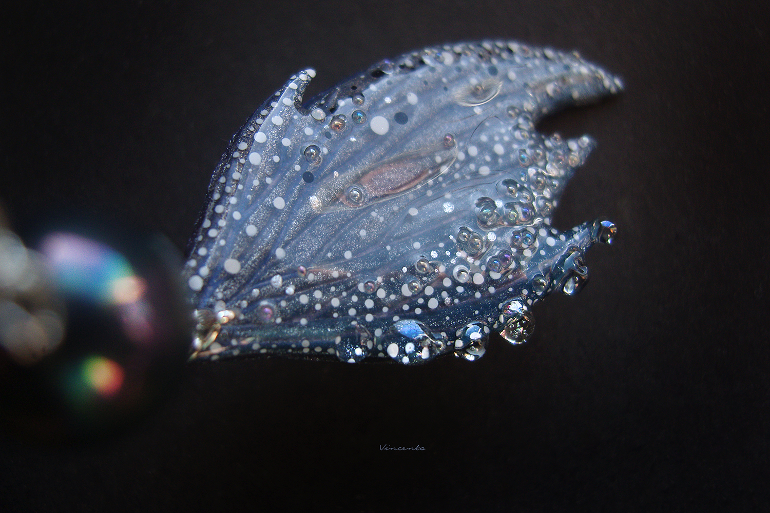- Толстый слой прозрачного покрытия, напоминающего толщу воды, делает крылышки блестящими и переливающимися, добавляет всем оттенкам глубины и насыщенности.