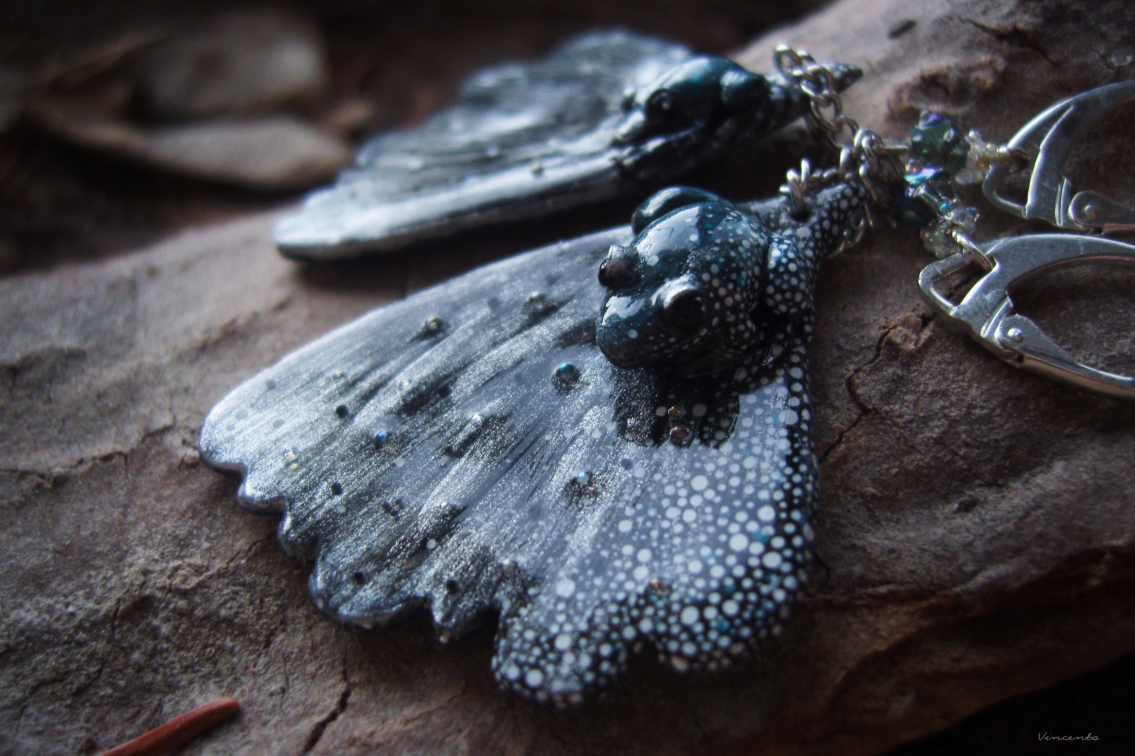 - Волшебные серьги в виде фэнтезийных крылышек Туманных фей с миниатюрными лягушками, зачарованными принцессами Сумеречного леса.