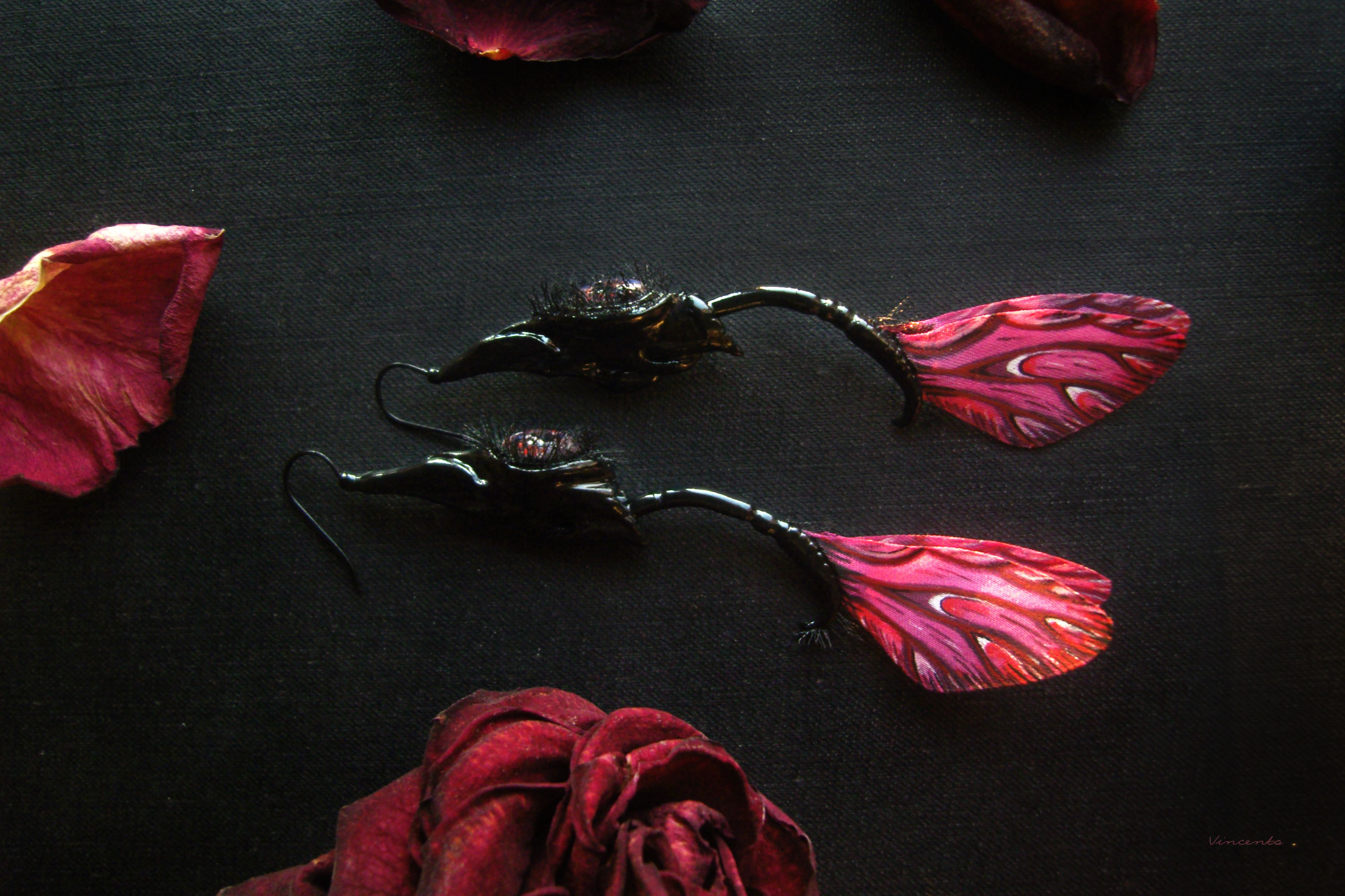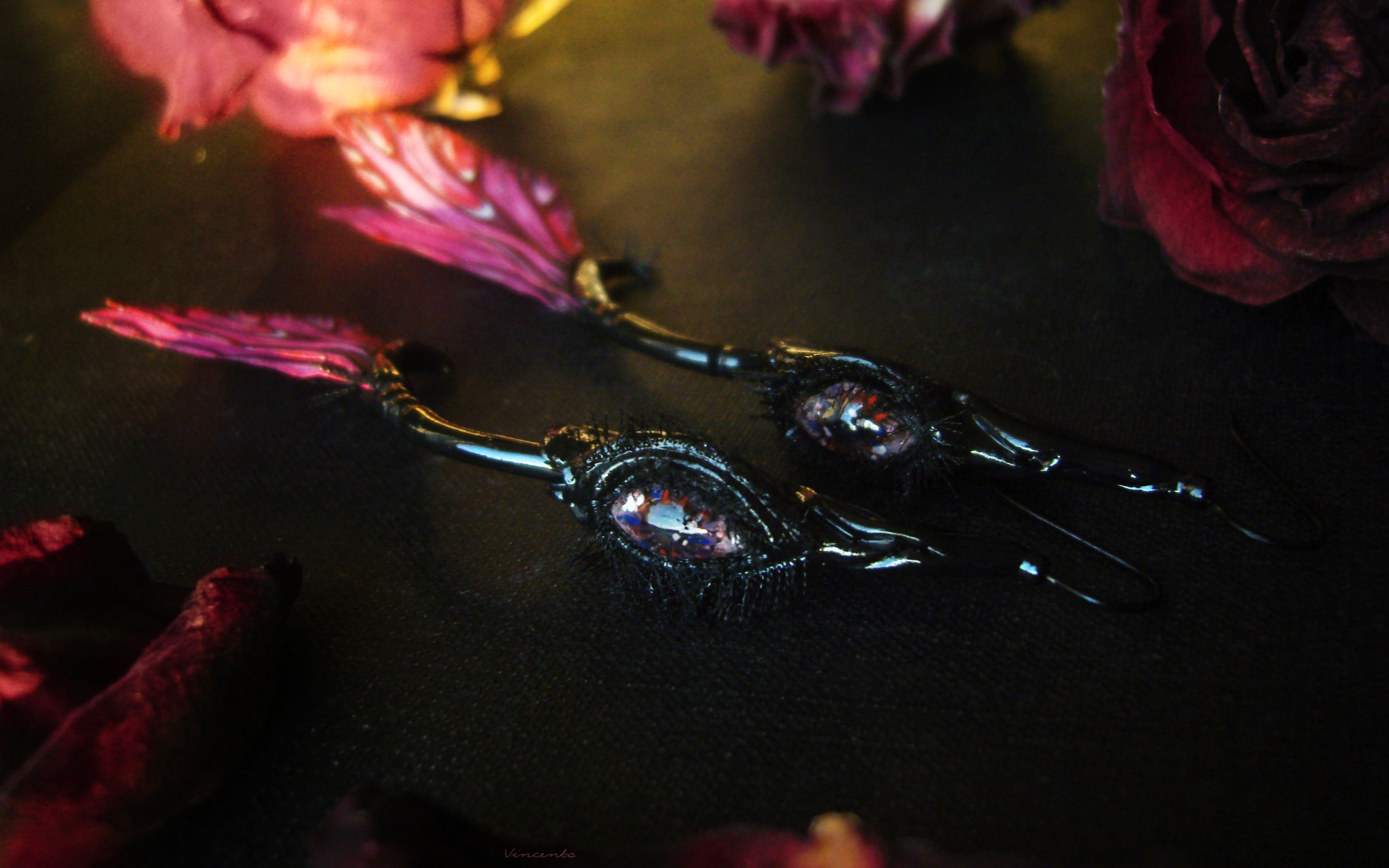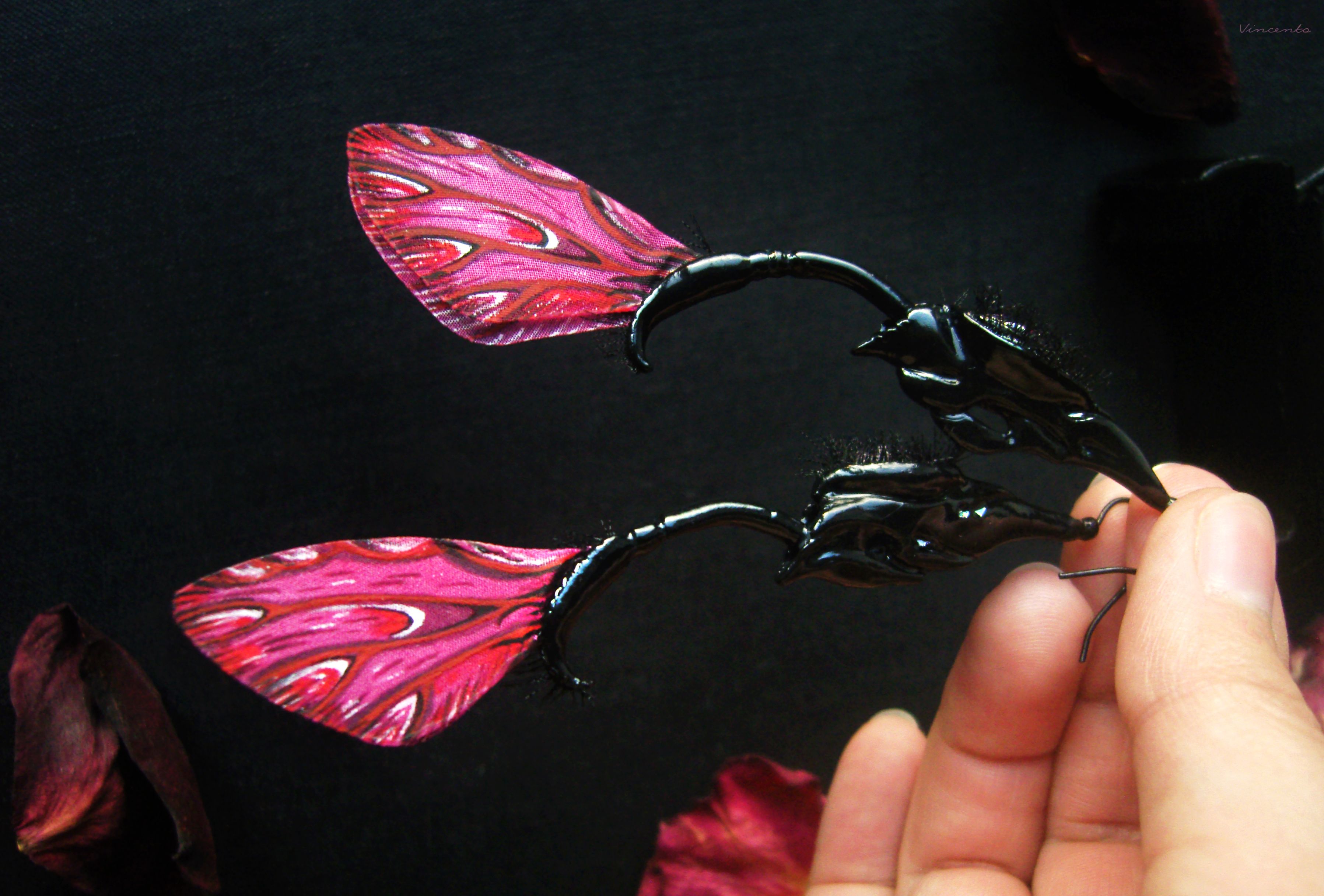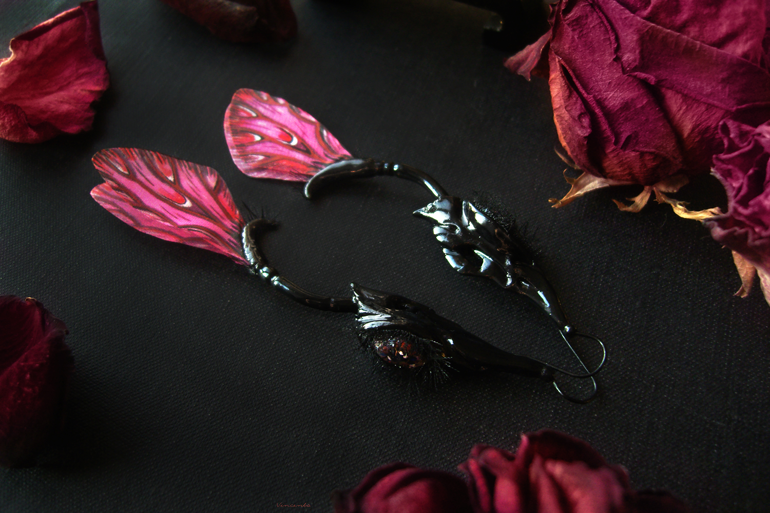 - Образ серёжек собирательный, здесь сплетаются формы и фактуры: трепетные крылышки праздничного, малиново-алого оттенка, словно только пробудившиеся ото сна бабочки, опустившиеся на глянцево-лаковую, будто латексную, поверхность смоляных паучьих лапок, с щетинками на коготках и густыми ресничками вокруг всевидящих глаз. Или может, так и выглядят крылышки сумрачных фейри из параллельных миров? Окутанные тайной затягивающих сновидений, создания ночных теней?..