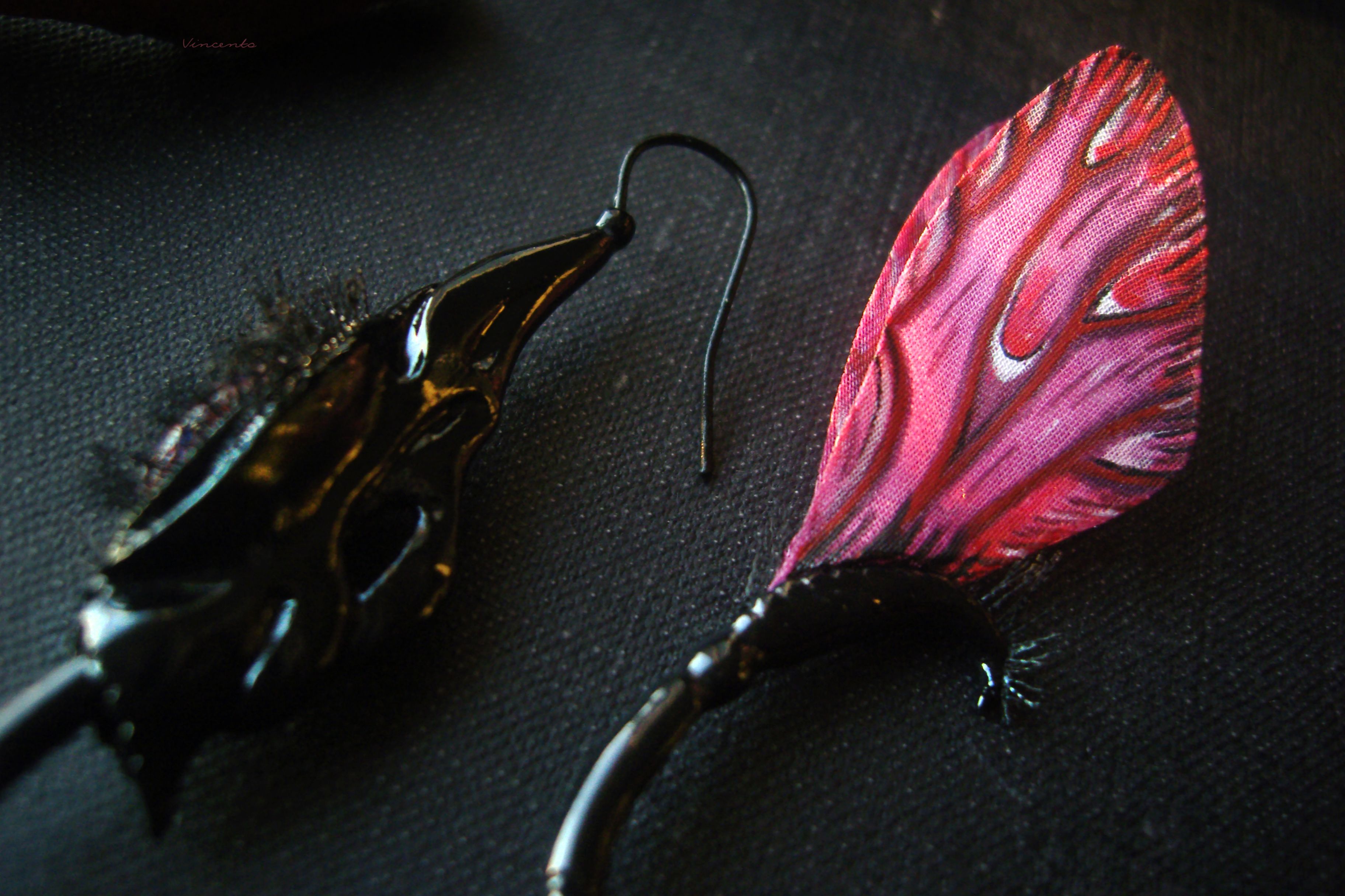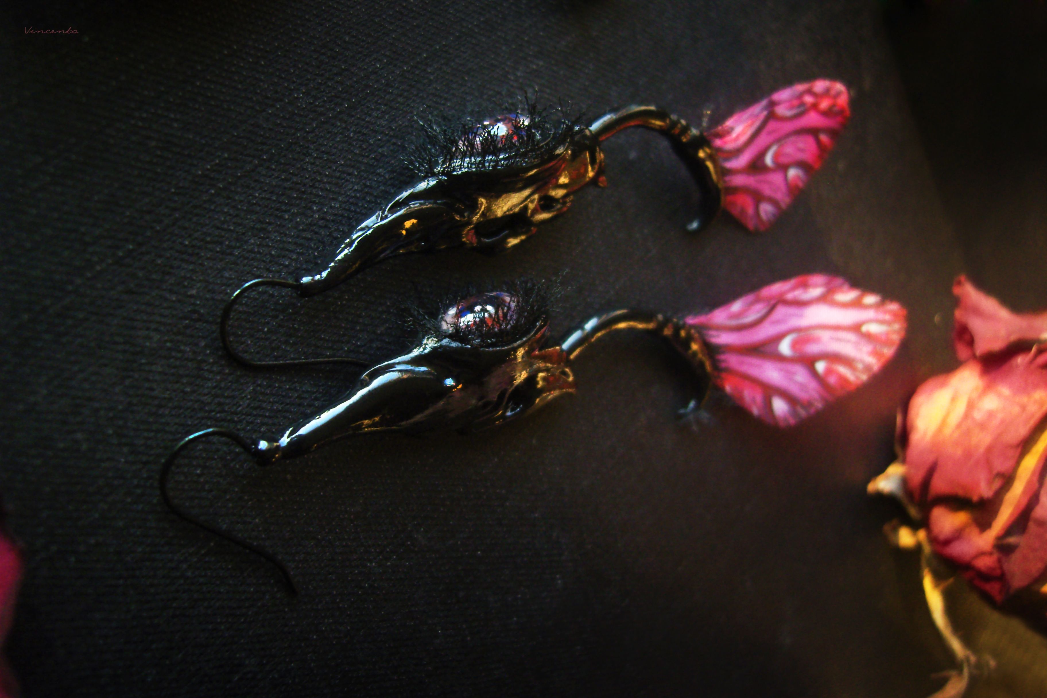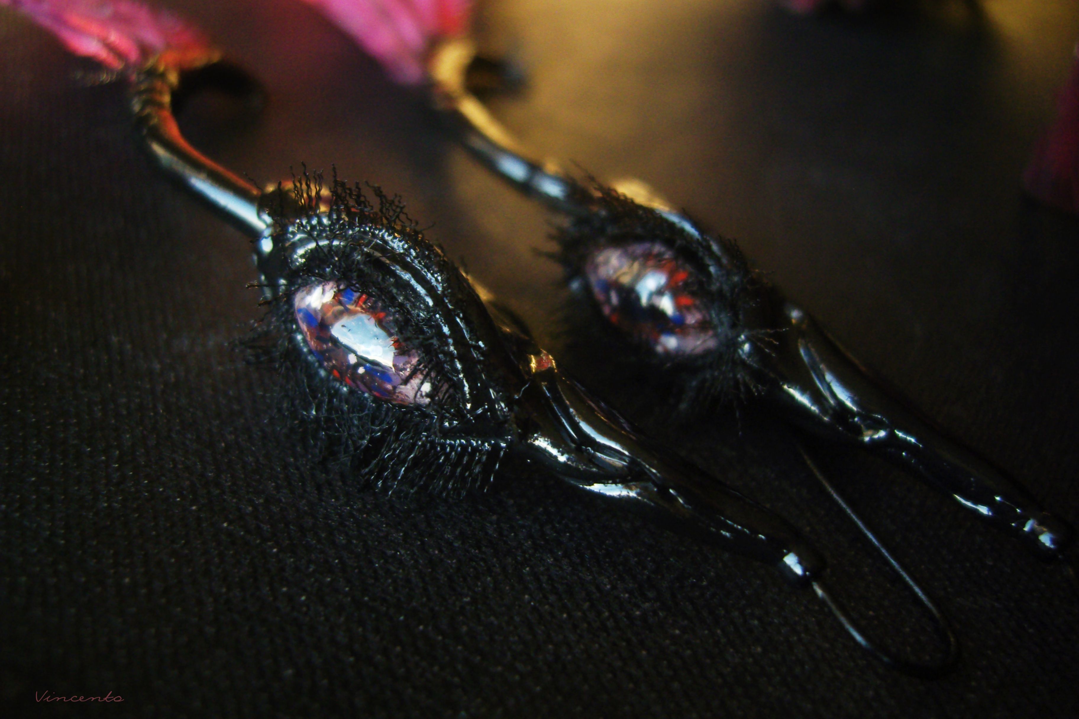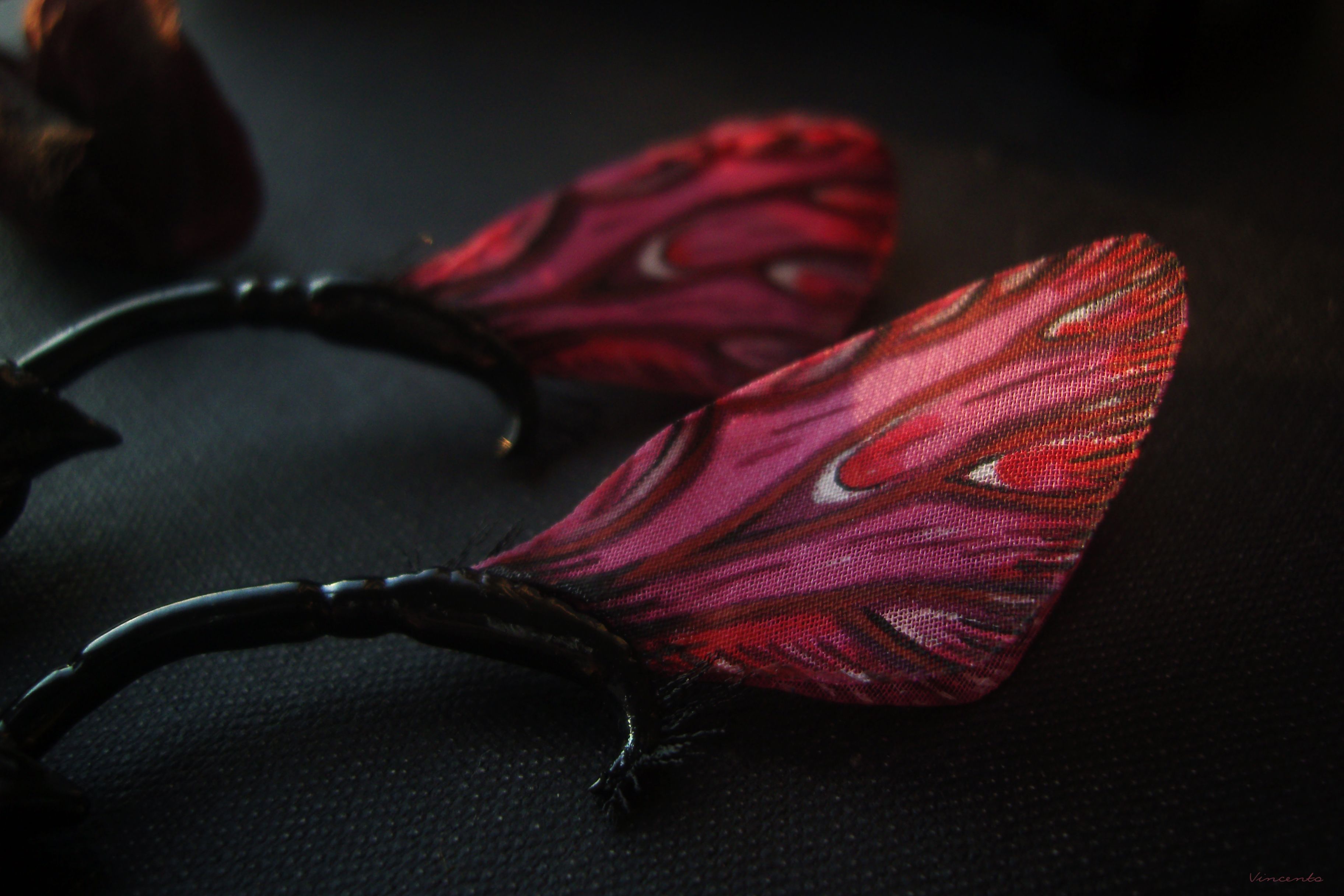 - Образ серёжек собирательный, здесь сплетаются формы и фактуры: трепетные крылышки праздничного, малиново-алого оттенка, словно только пробудившиеся ото сна бабочки, опустившиеся на глянцево-лаковую, будто латексную, поверхность смоляных паучьих лапок, с щетинками на коготках и густыми ресничками вокруг всевидящих глаз. Или может, так и выглядят крылышки сумрачных фейри из параллельных миров? Окутанные тайной затягивающих сновидений, создания ночных теней?..