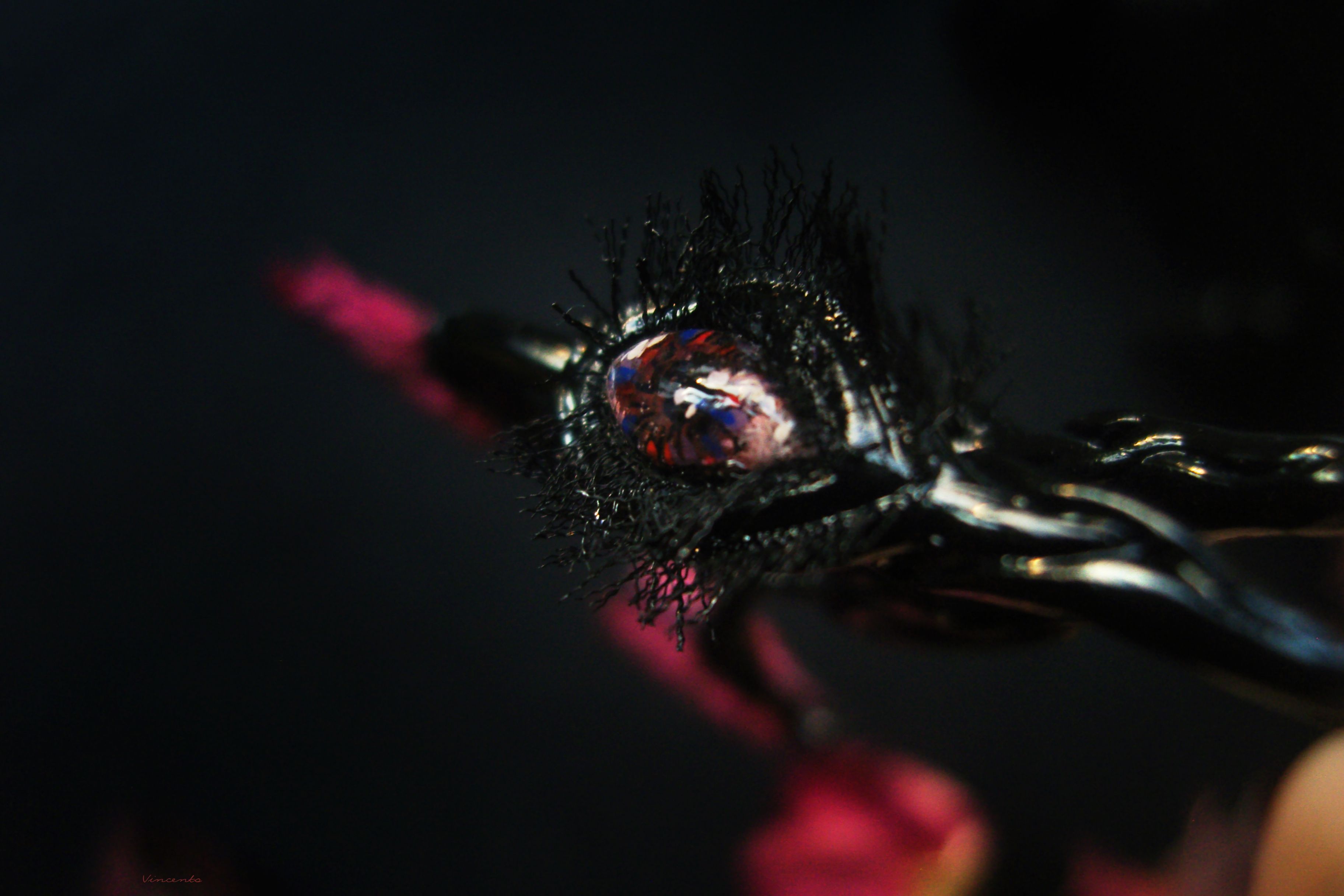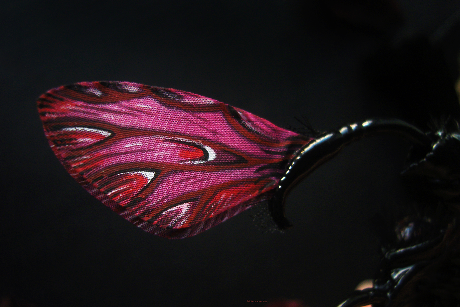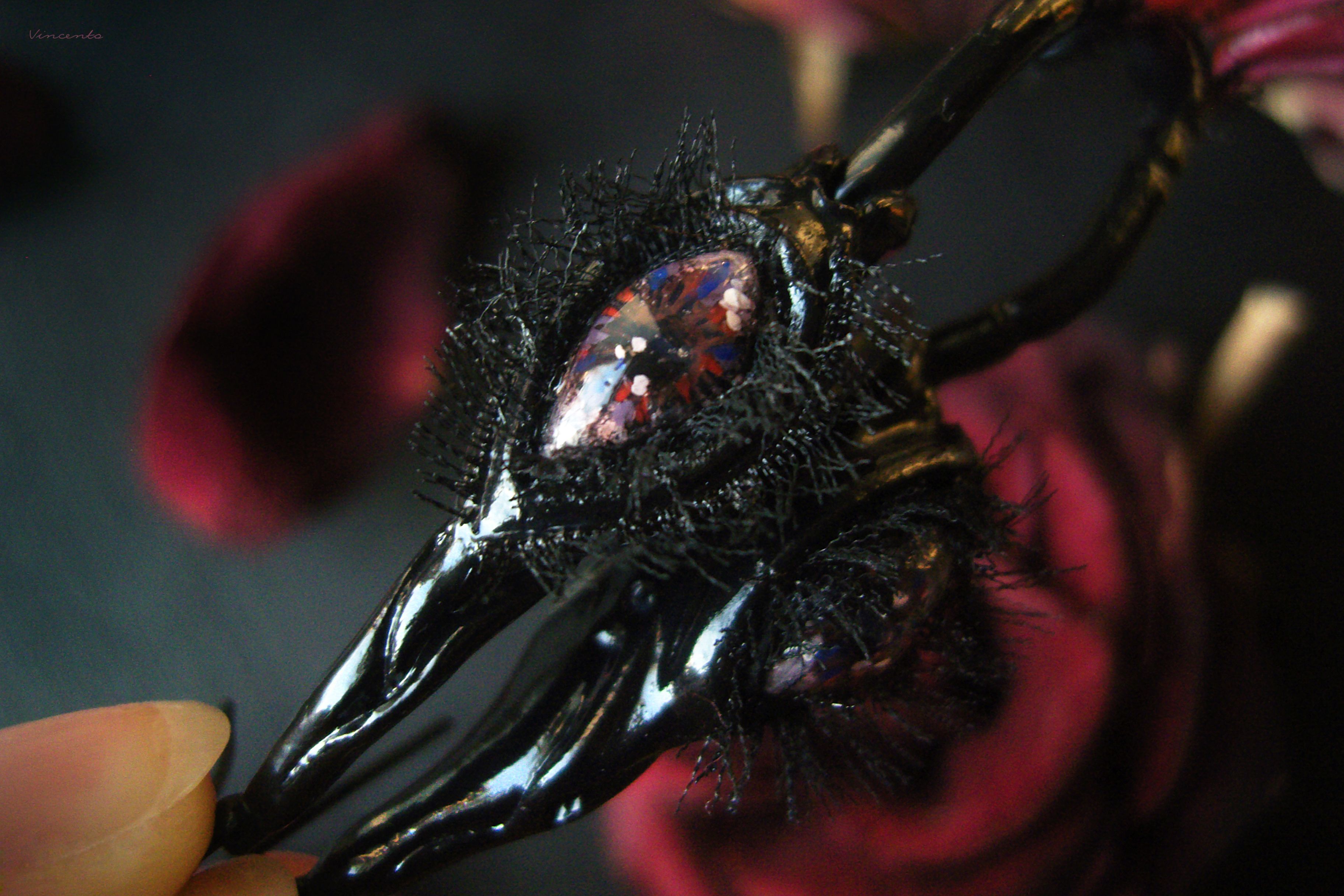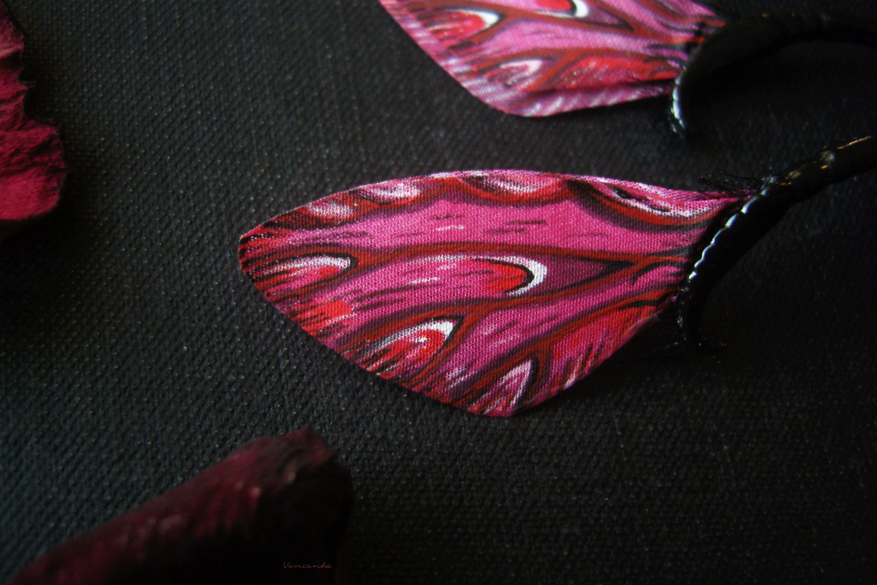 - Образ серёжек собирательный, здесь сплетаются формы и фактуры: трепетные крылышки праздничного, малиново-алого оттенка, словно только пробудившиеся ото сна бабочки, опустившиеся на глянцево-лаковую, будто латексную, поверхность смоляных паучьих лапок, с щетинками на коготках и густыми ресничками вокруг всевидящих глаз. Или может, так и выглядят крылышки сумрачных фейри из параллельных миров? Окутанные тайной затягивающих сновидений, создания ночных теней?..
