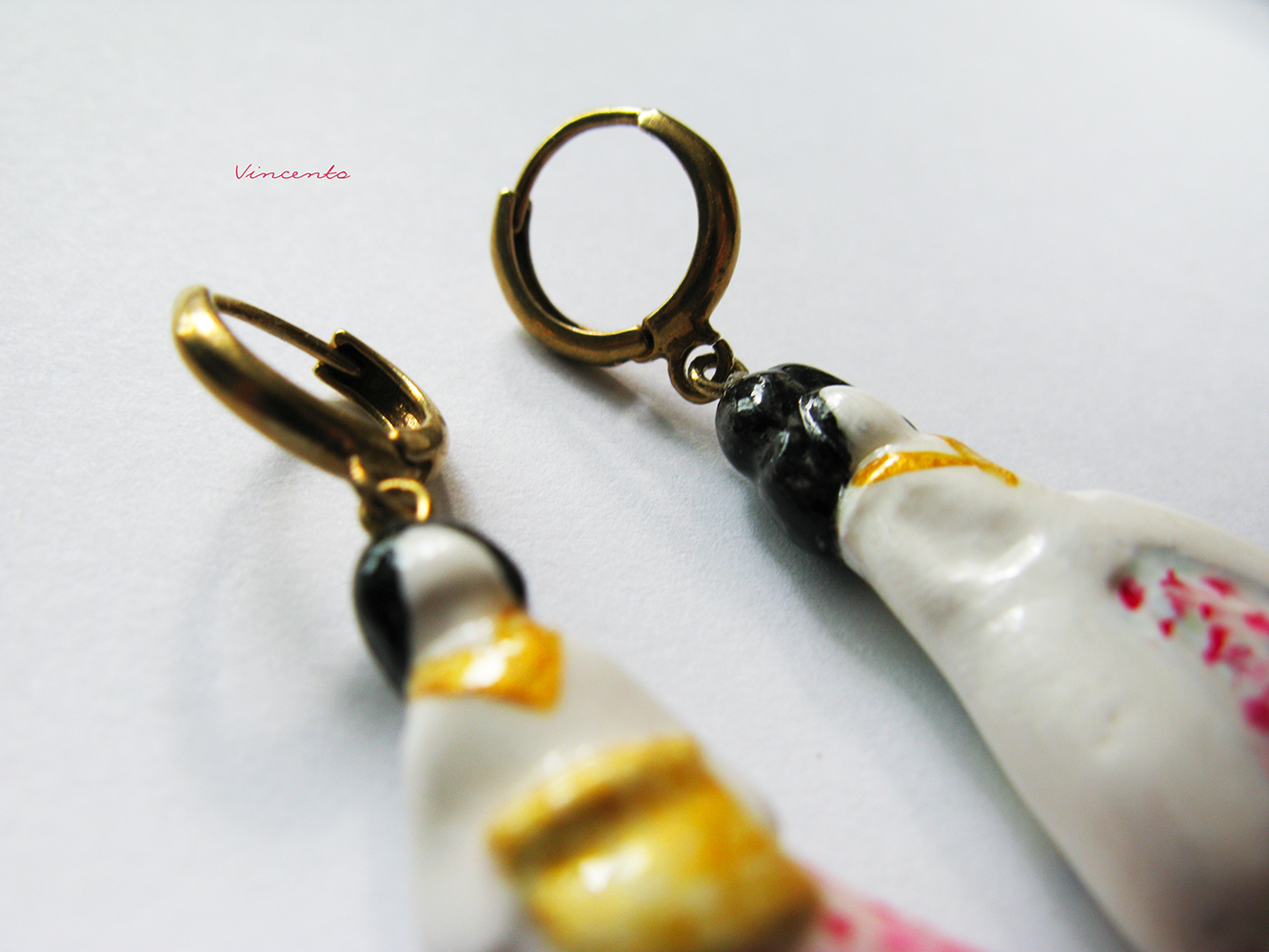 - Восточные серьги-капли выполнены в весенней, очень нежной цветовой гамме: украшенное золотой оторочкой белое кимоно завершается малиново-розовой юбкой с синими вкраплениями. И конечно, весьма узнаваемы классические чёрные причёски восточных красавиц.