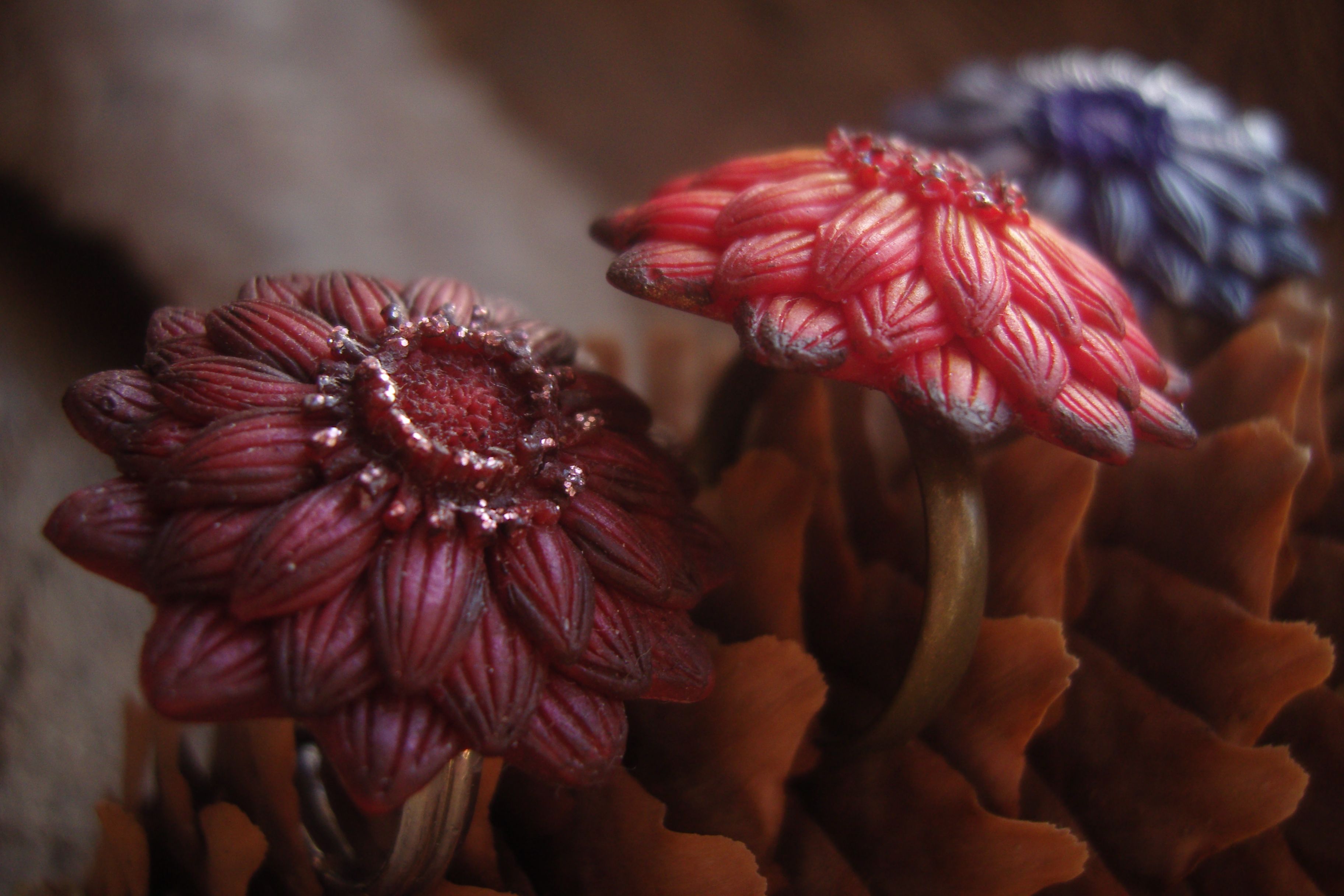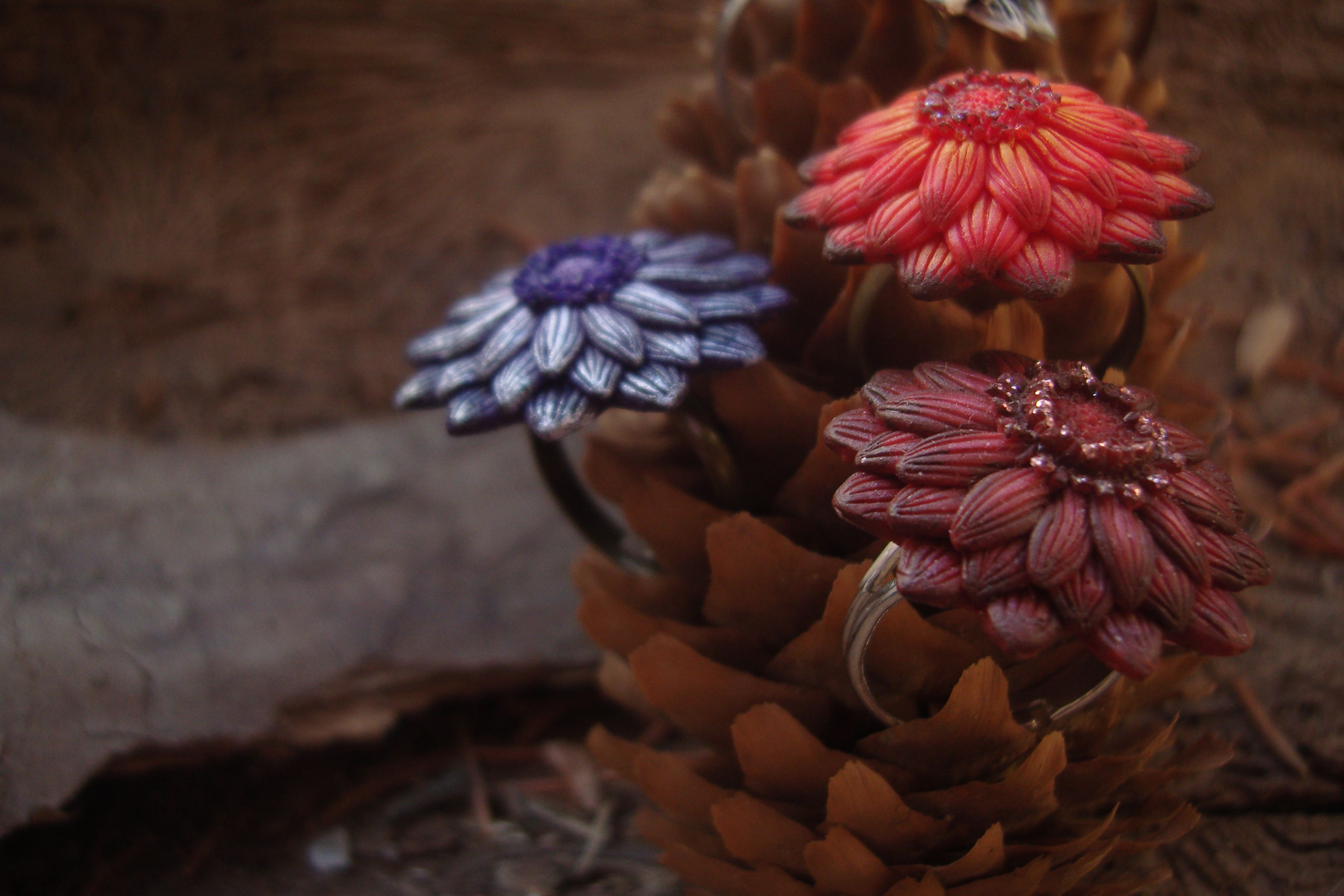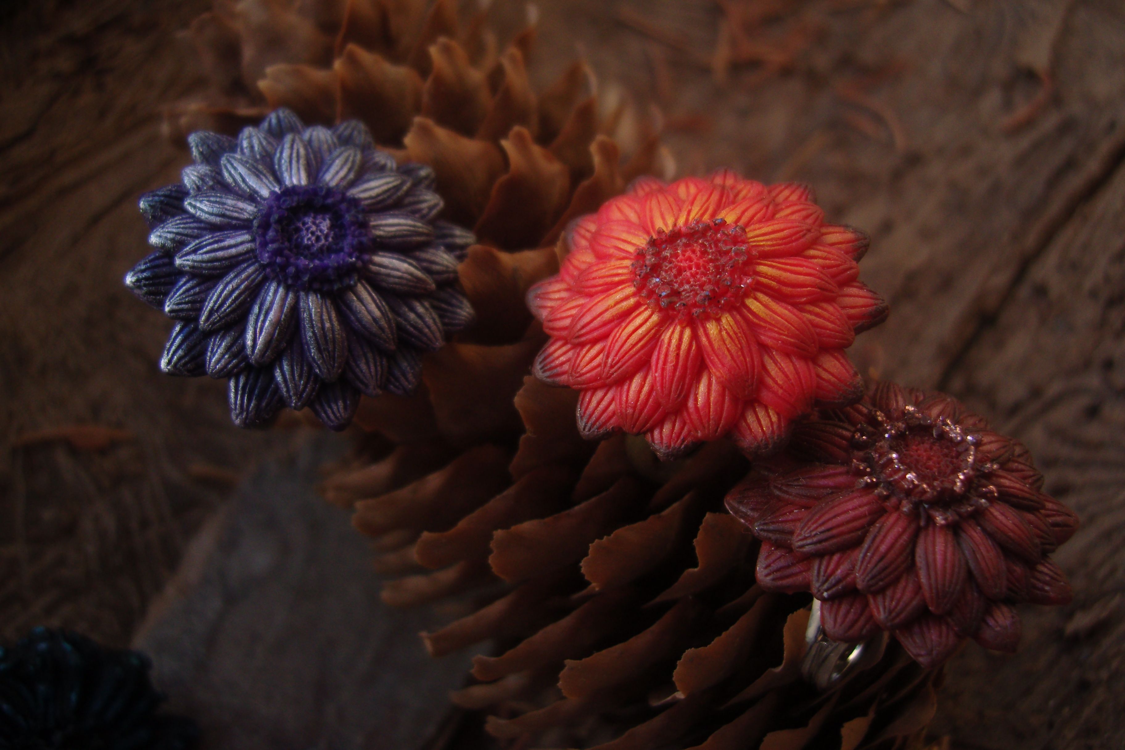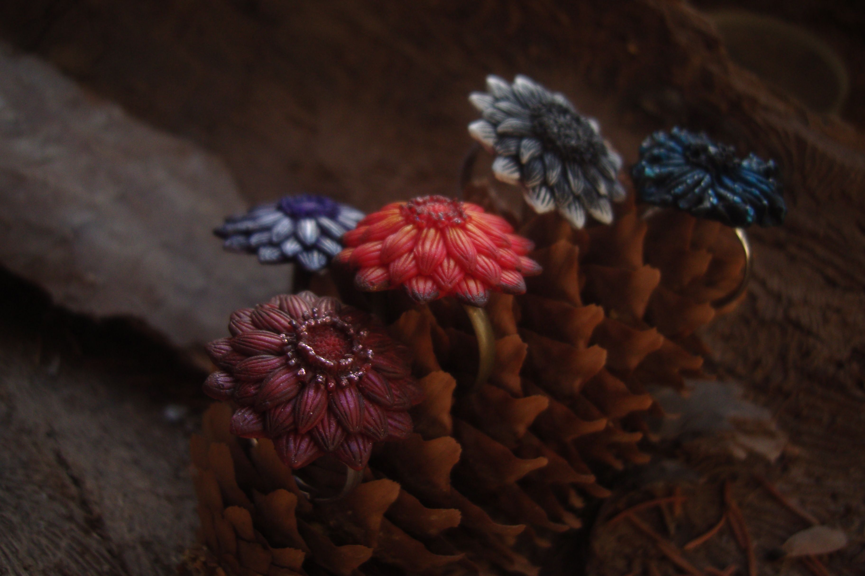 - На фотографиях представлены колечки: оранжево-красный "Цветок осеннего Солнца", фиолетово-серебристый "Цветок Феи Лилак", приглушённо-розовый "Рассветный Зачаровник", чёрно-белый "Цветок Угля и Пепла" и, наконец, тёмно-синий цветок с капельками "Ночная Магия".