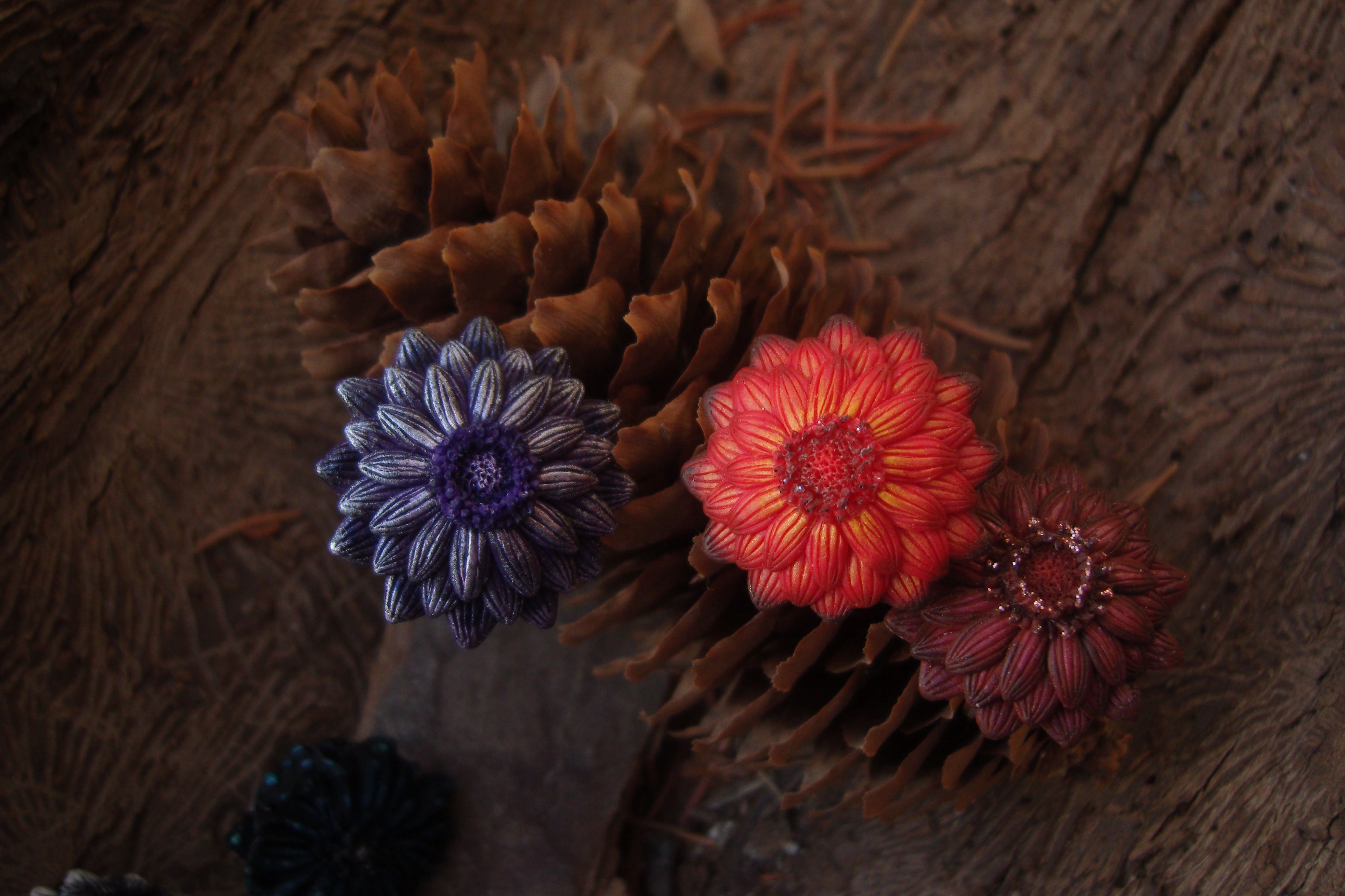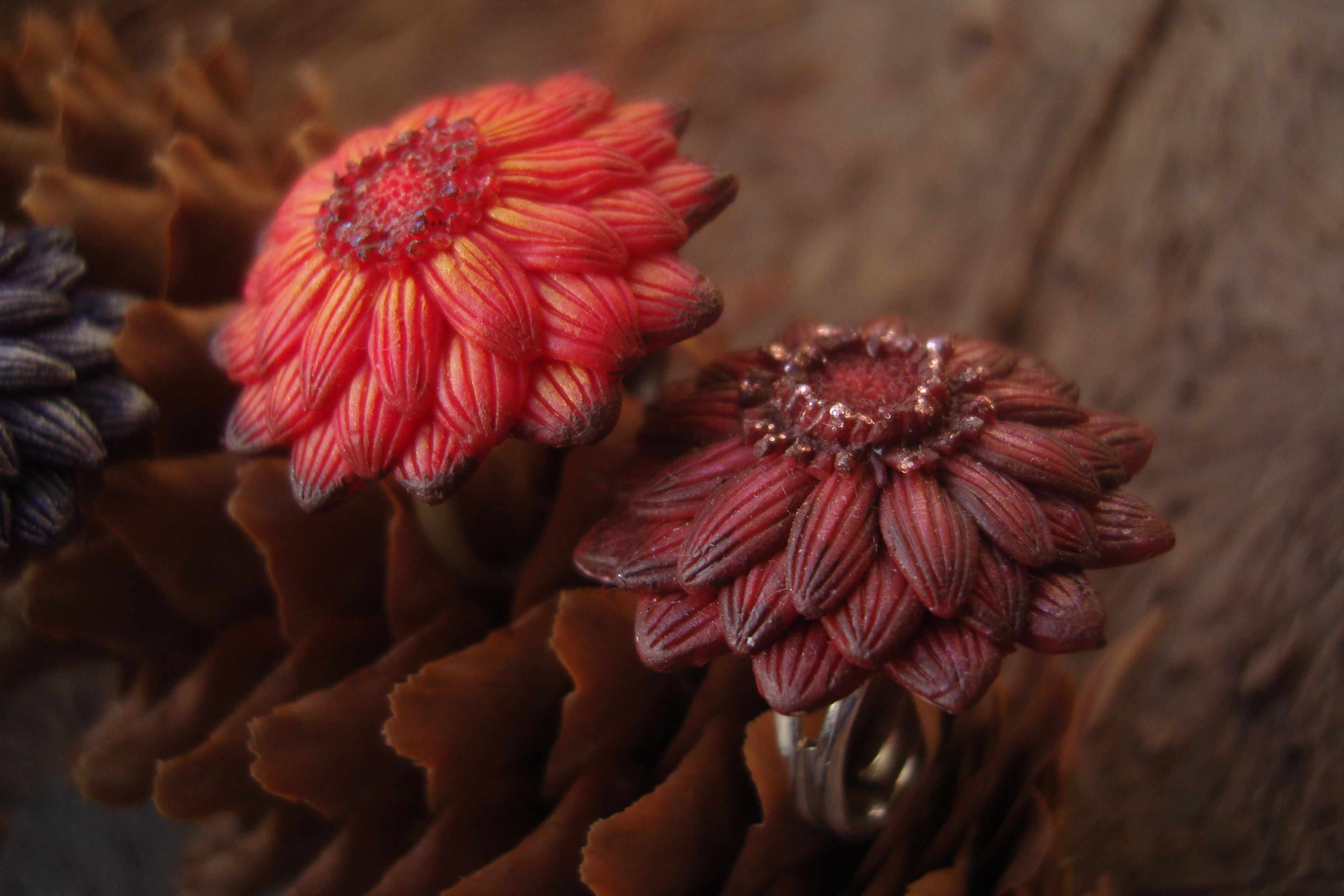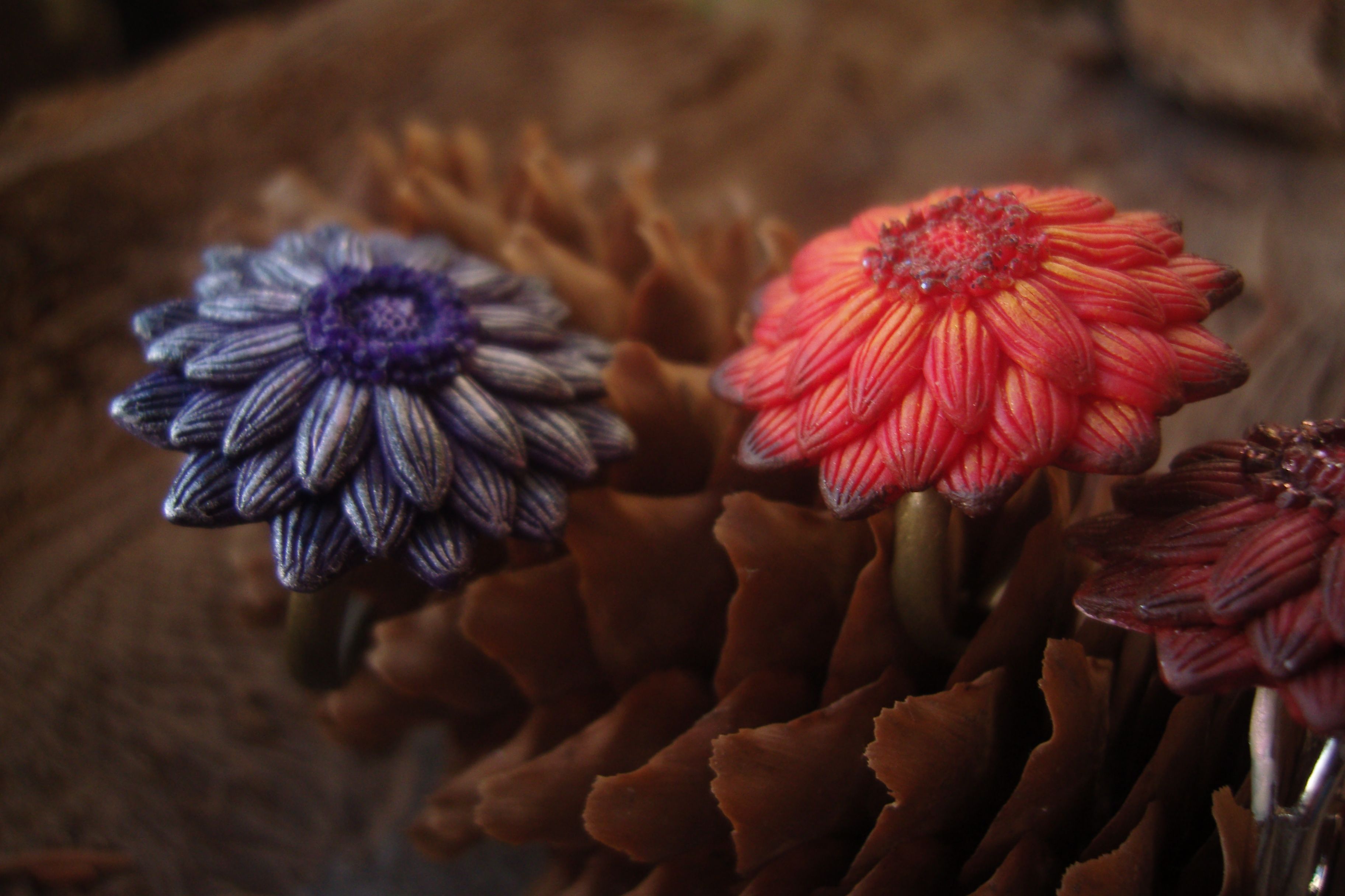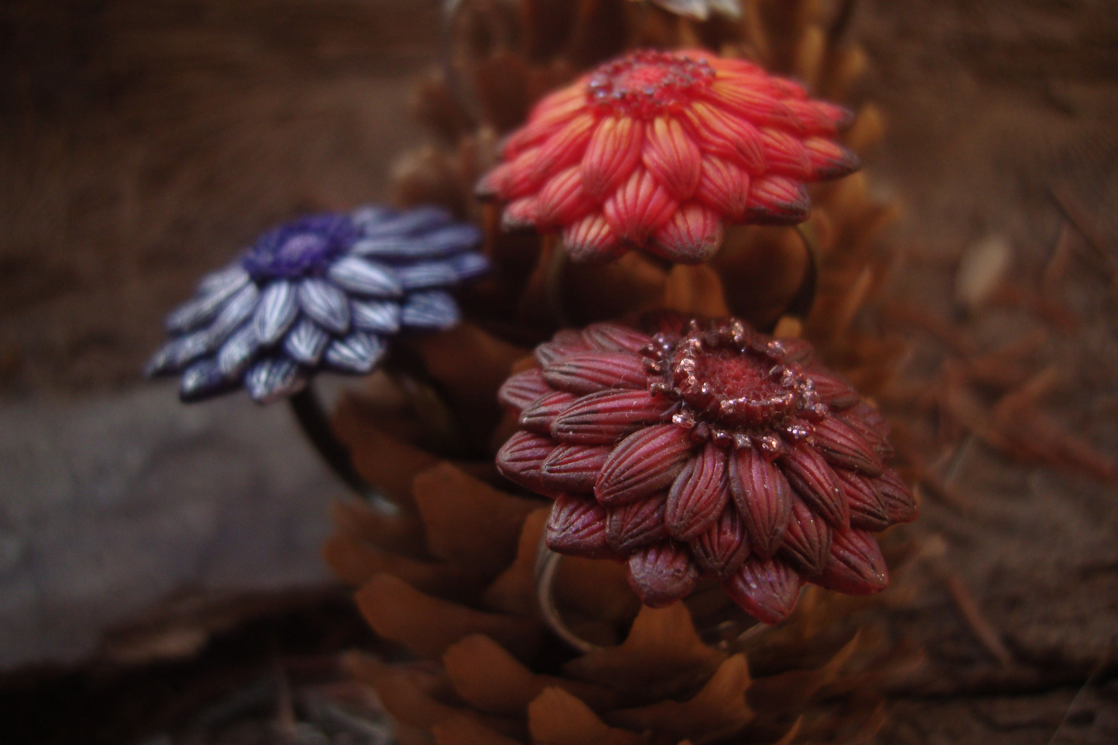 - На фотографиях представлены колечки: оранжево-красный "Цветок осеннего Солнца", фиолетово-серебристый "Цветок Феи Лилак", приглушённо-розовый "Рассветный Зачаровник", чёрно-белый "Цветок Угля и Пепла" и, наконец, тёмно-синий цветок с капельками "Ночная Магия".