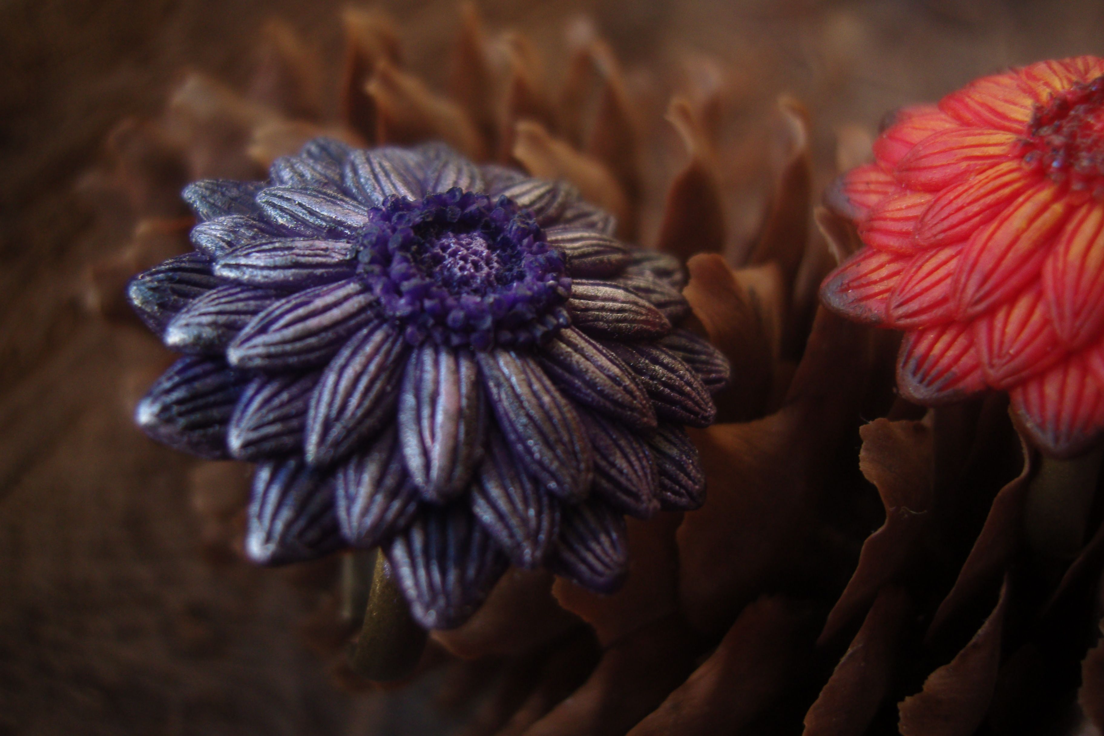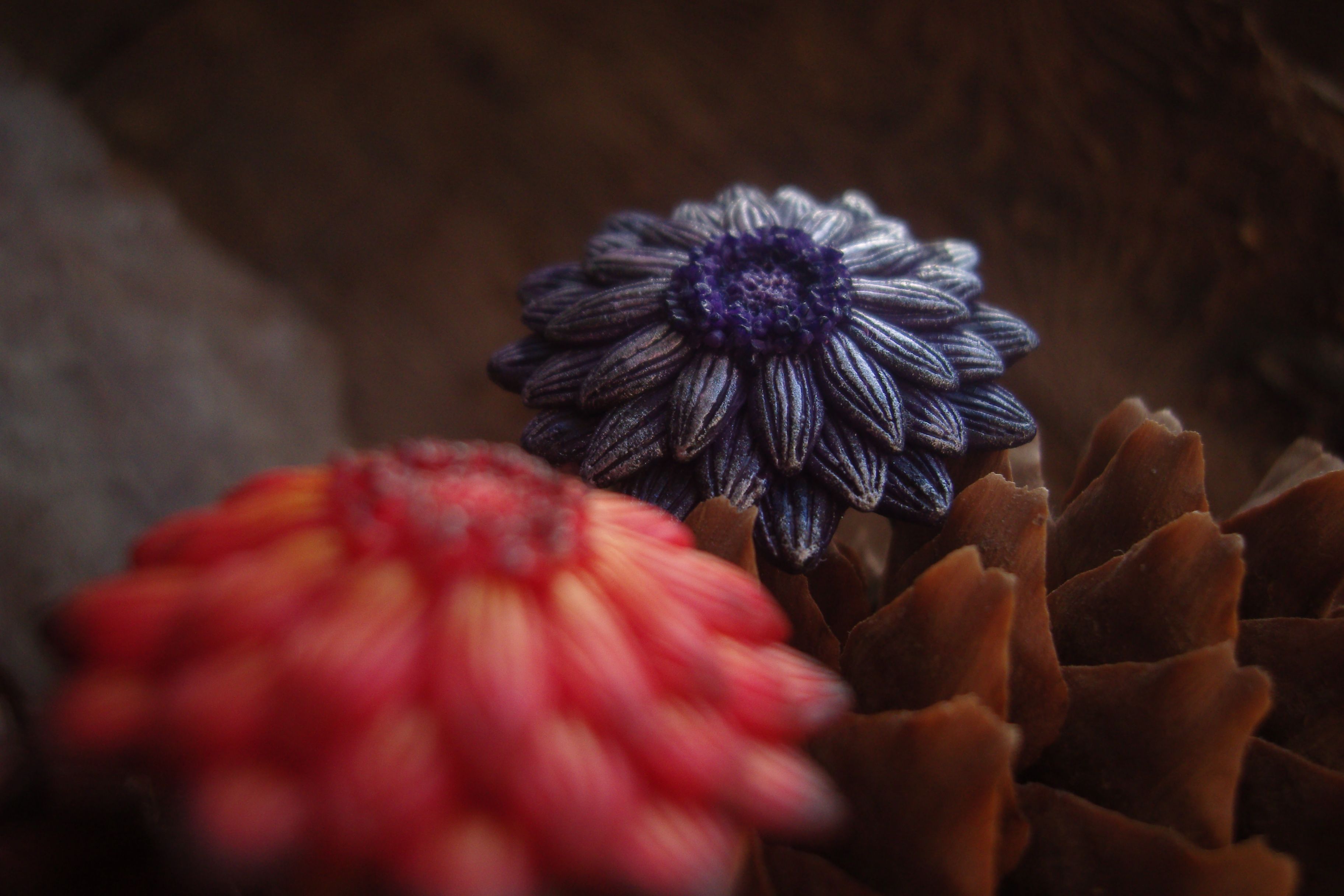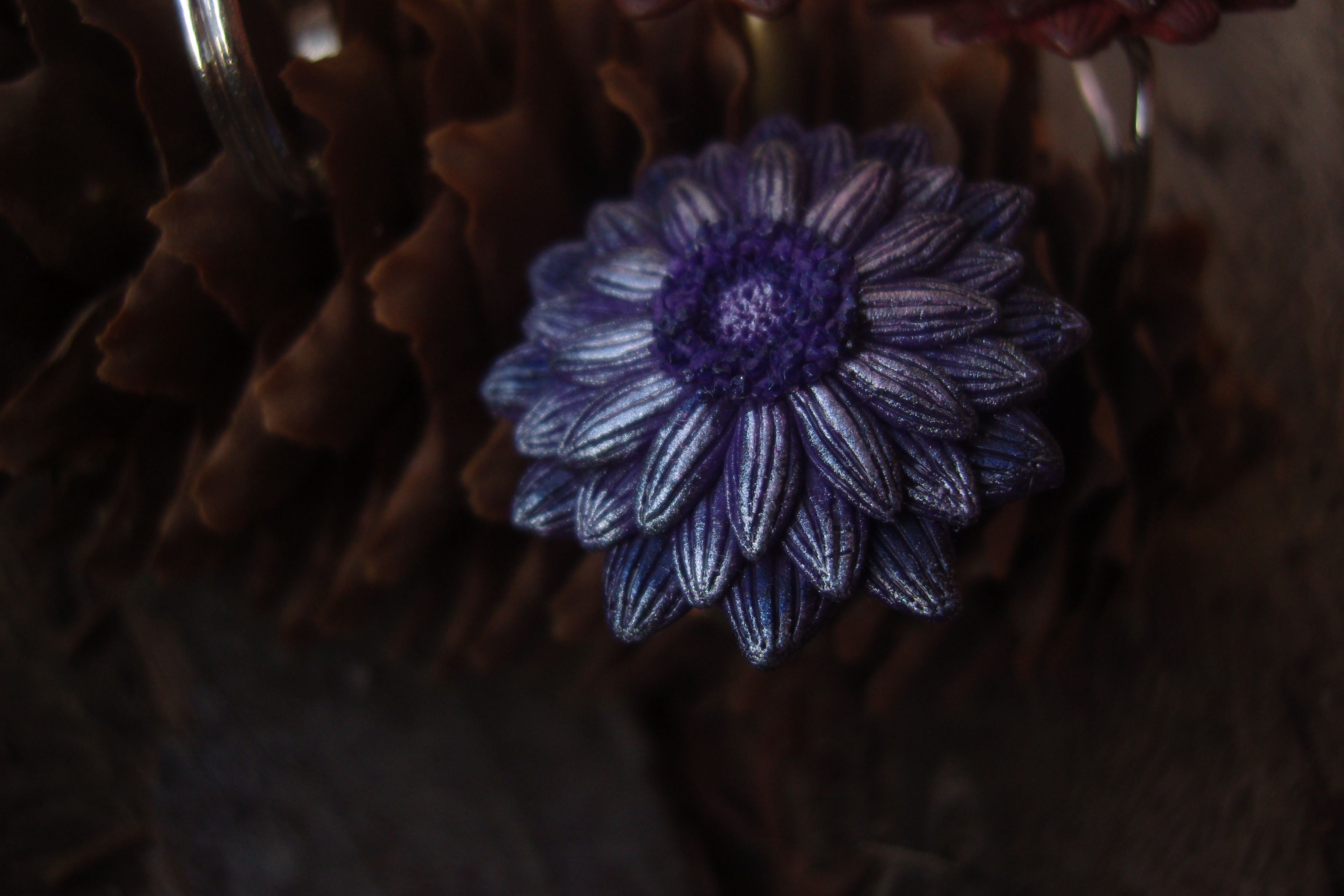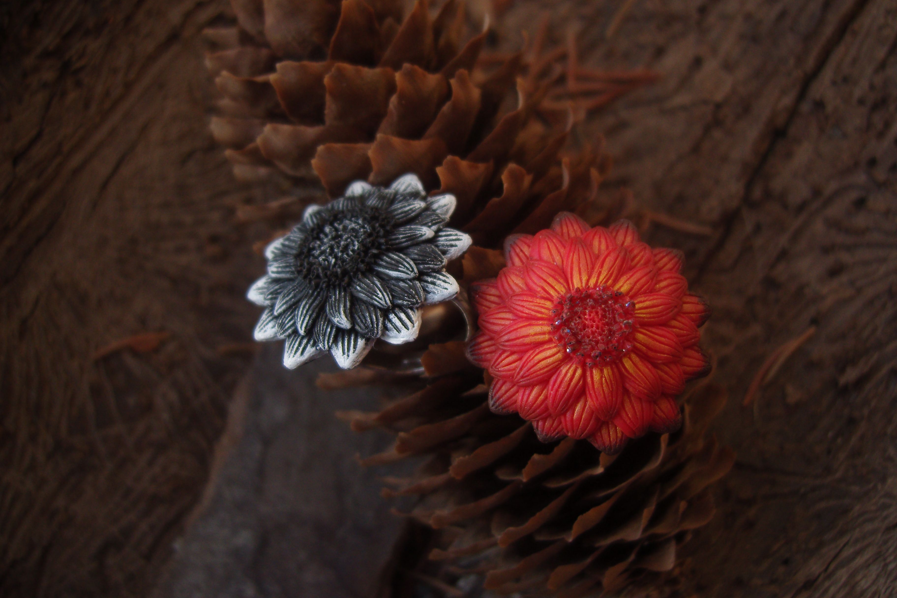 - На фотографиях представлены колечки: оранжево-красный "Цветок осеннего Солнца", фиолетово-серебристый "Цветок Феи Лилак", приглушённо-розовый "Рассветный Зачаровник", чёрно-белый "Цветок Угля и Пепла" и, наконец, тёмно-синий цветок с капельками "Ночная Магия".