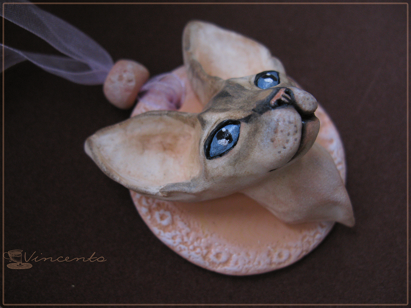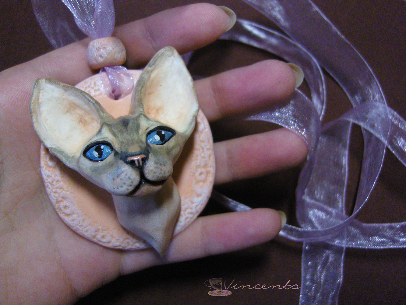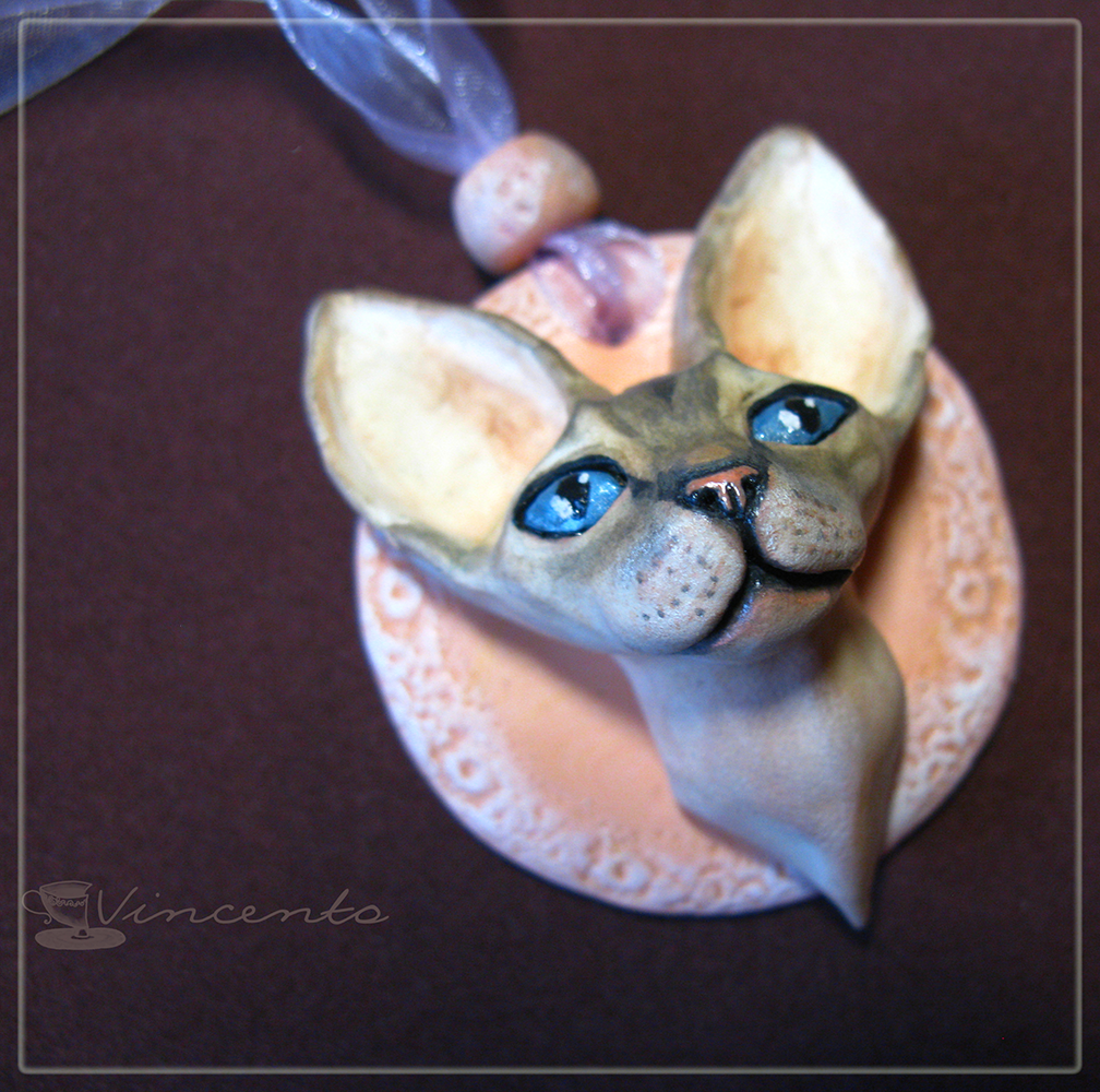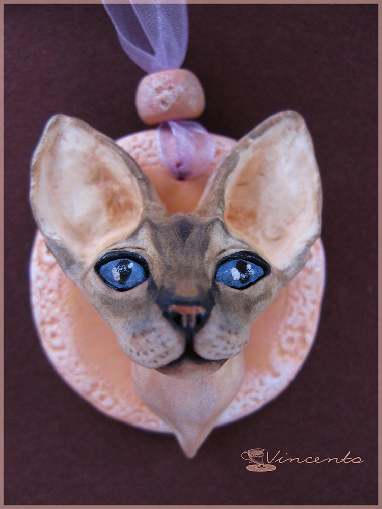 - Кулон "Катря - кошечка сфинкс" отличается тщательной детализацией (весь орнамент кошачьей расцветки наши мастера прорисовывают вручную, используя акриловые краски и технику "мокрой" пастели). Мордочка кошки также изготавливается вручную из лёгкой полимерной глины, без использования штампов или молдов. Единственный экземпляр.
